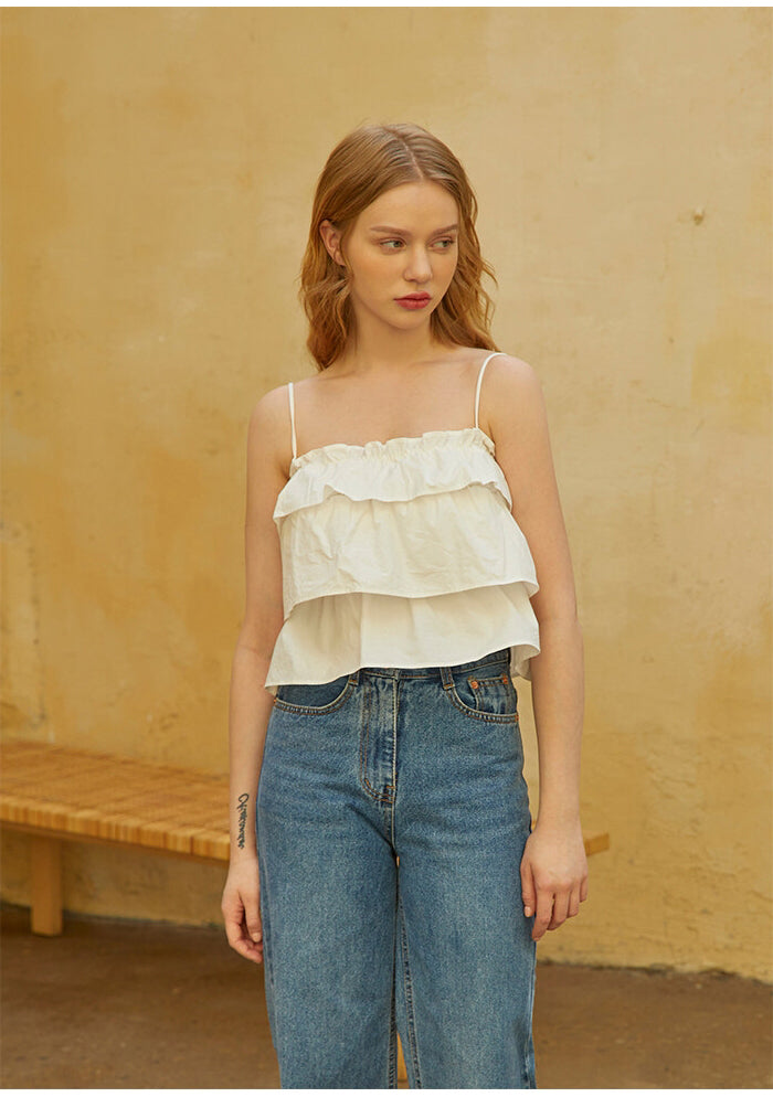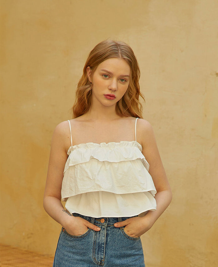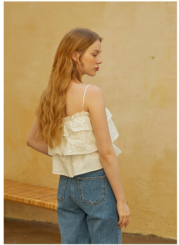 The Poplin Ruffle Top by Sarah Luton is crafted from lightweight, breathable cotton poplin for a crisp yet soft finish. Designed with delicate spaghetti straps and tiered ruffle layers, this crop silhouette brings effortless charm to warm-weather styling. Perfect for pairing with high-rise jeans or skirts, it blends playful volume with an elegant drape. The gathered detailing enhances shape while offering a flattering fit that suits both casual and elevated looks.
