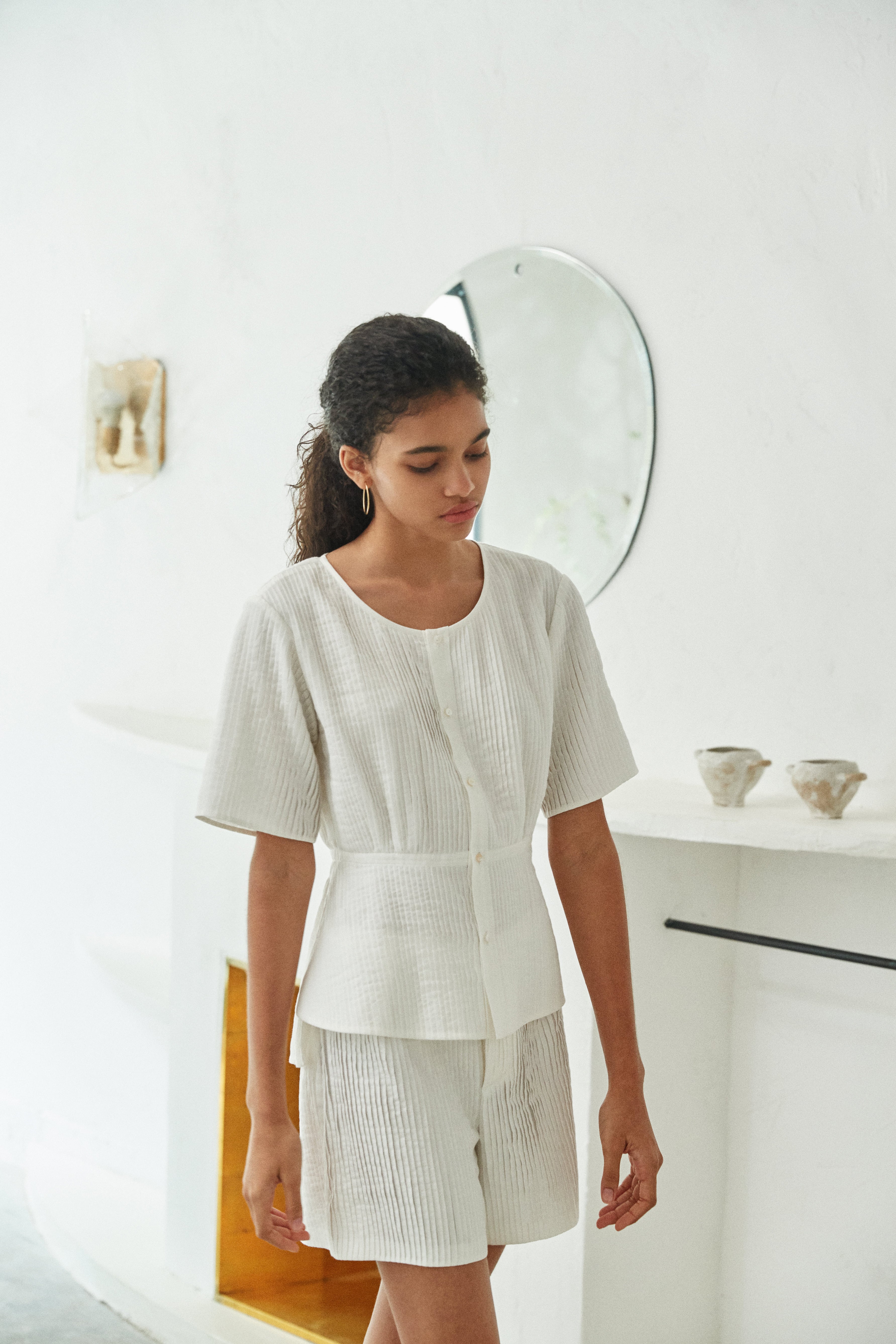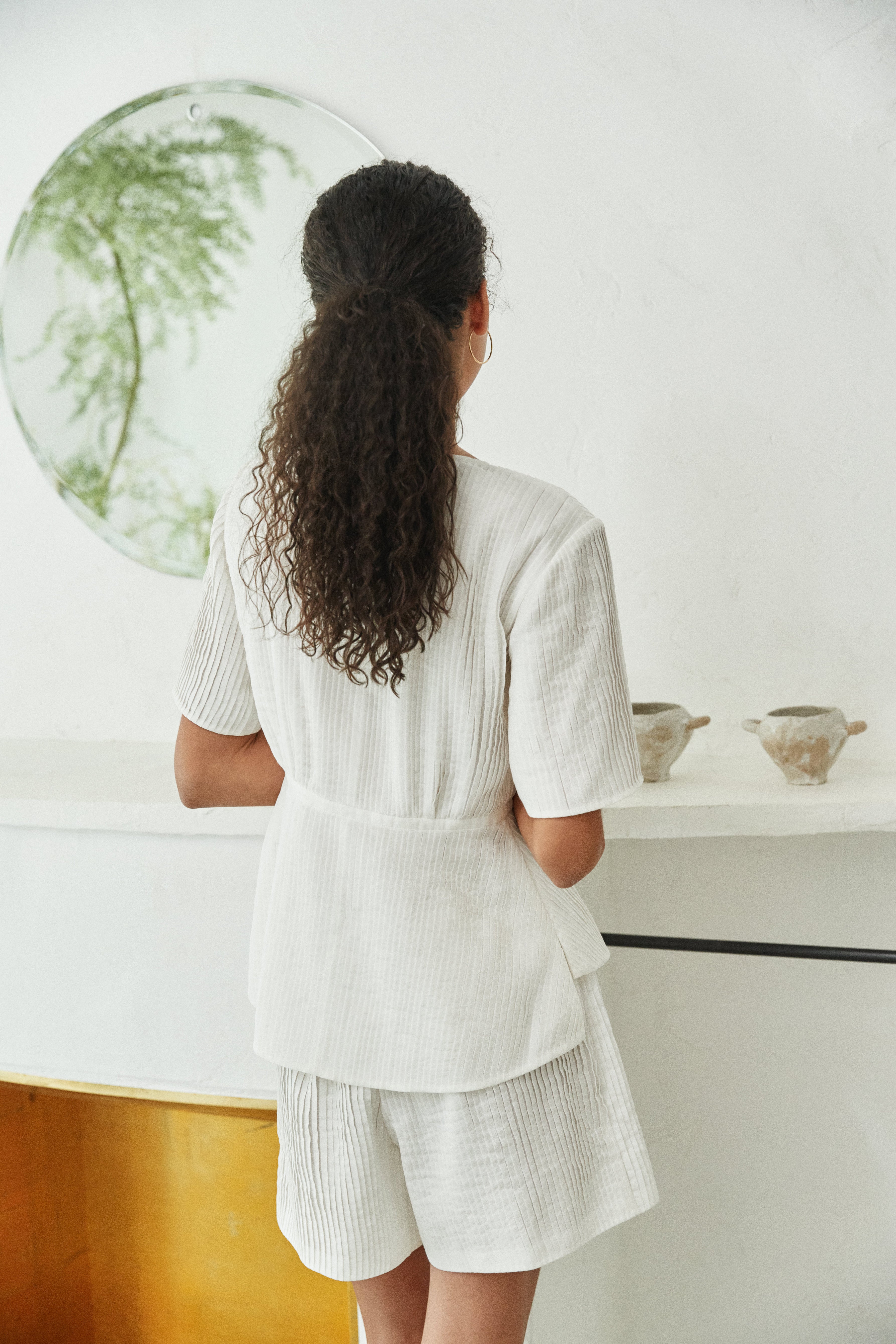 Sarah Luton’s linen shorts are a refined take on summer ease, tailored from breathable linen with a softly textured finish. Designed with a relaxed leg and structured waistband, they combine comfort and elegance effortlessly. The vertical texture adds subtle visual interest while elongating the silhouette. Perfect for pairing with the matching top or a crisp white shirt, these shorts are an essential piece in any warm-weather wardrobe. Handcrafted with care for timeless versatility.
