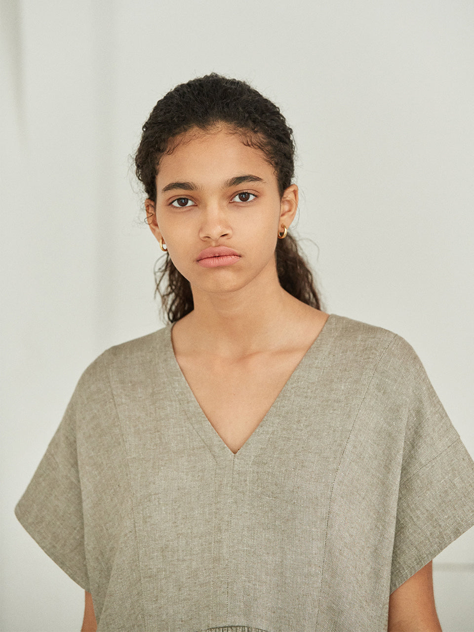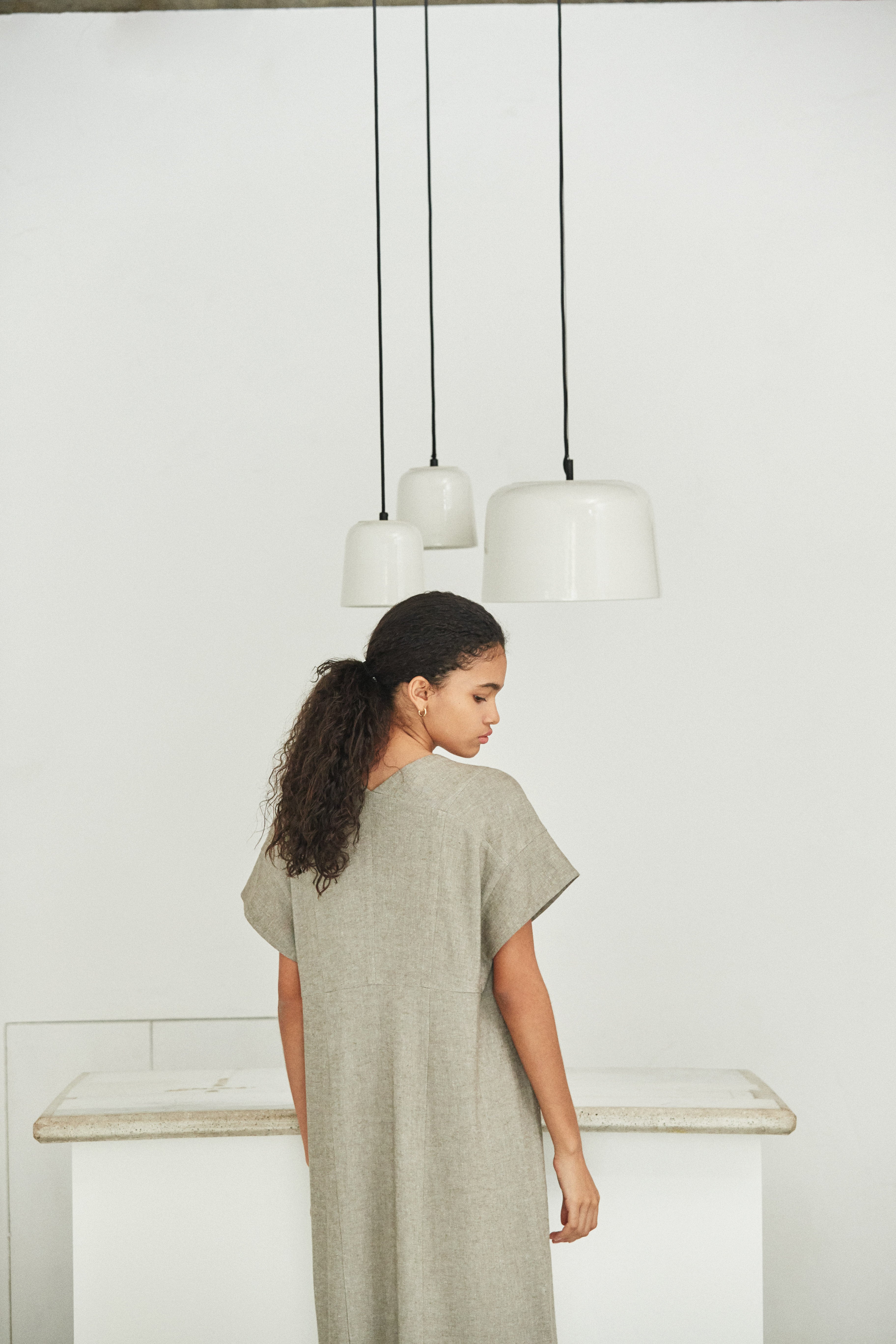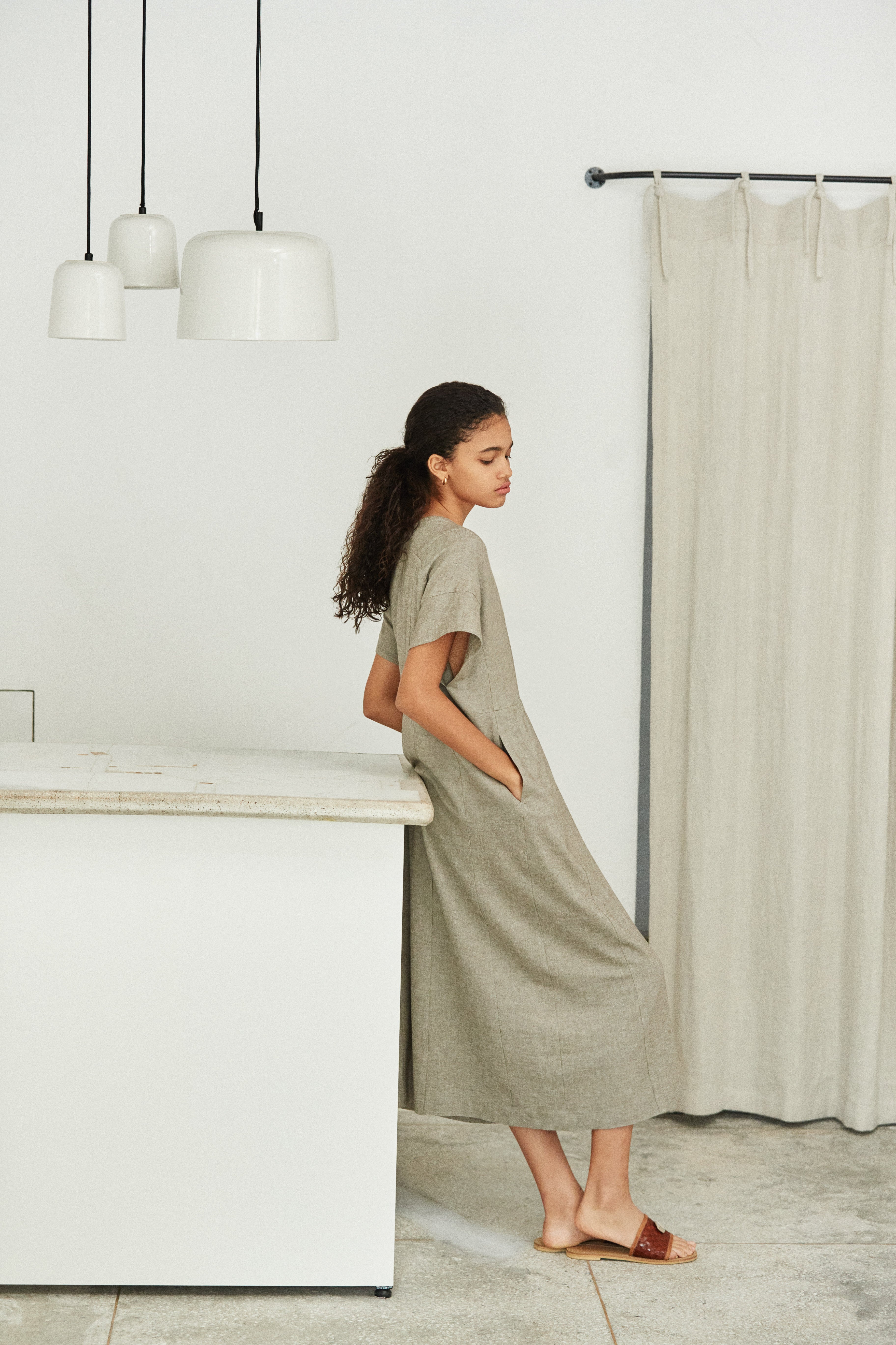Crafted from breathable linen, this dress by Sarah Luton is designed for effortless elegance and day-long comfort. It features a relaxed silhouette with a V-neckline, wide short sleeves, and a gently gathered waist for subtle volume. The midi length adds refined ease, making it perfect for both everyday wear and elevated casual occasions. Finished with minimalist lines and impeccable tailoring, it’s a timeless piece for warm-weather dressing.