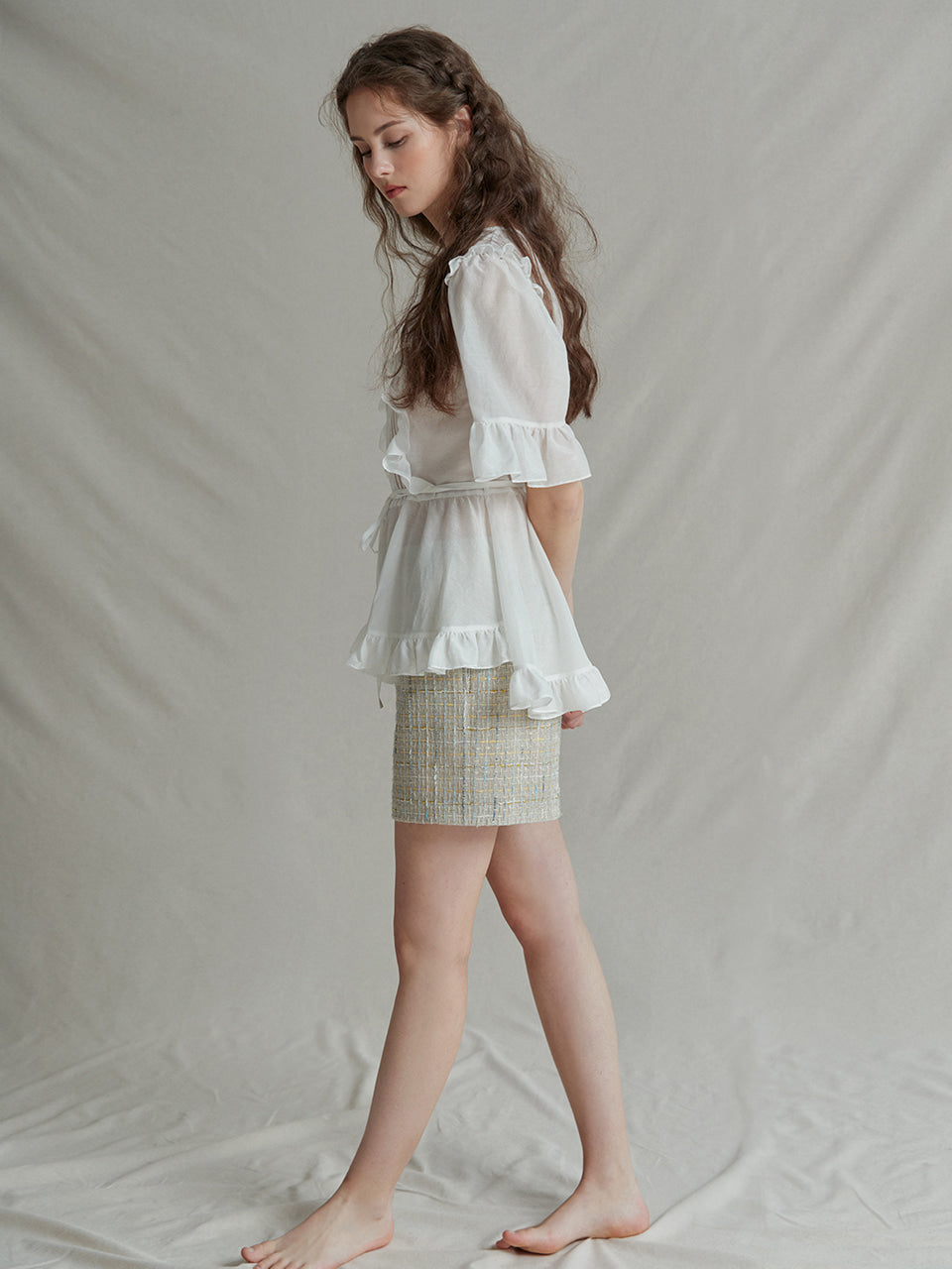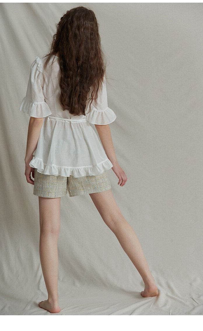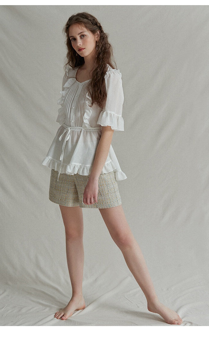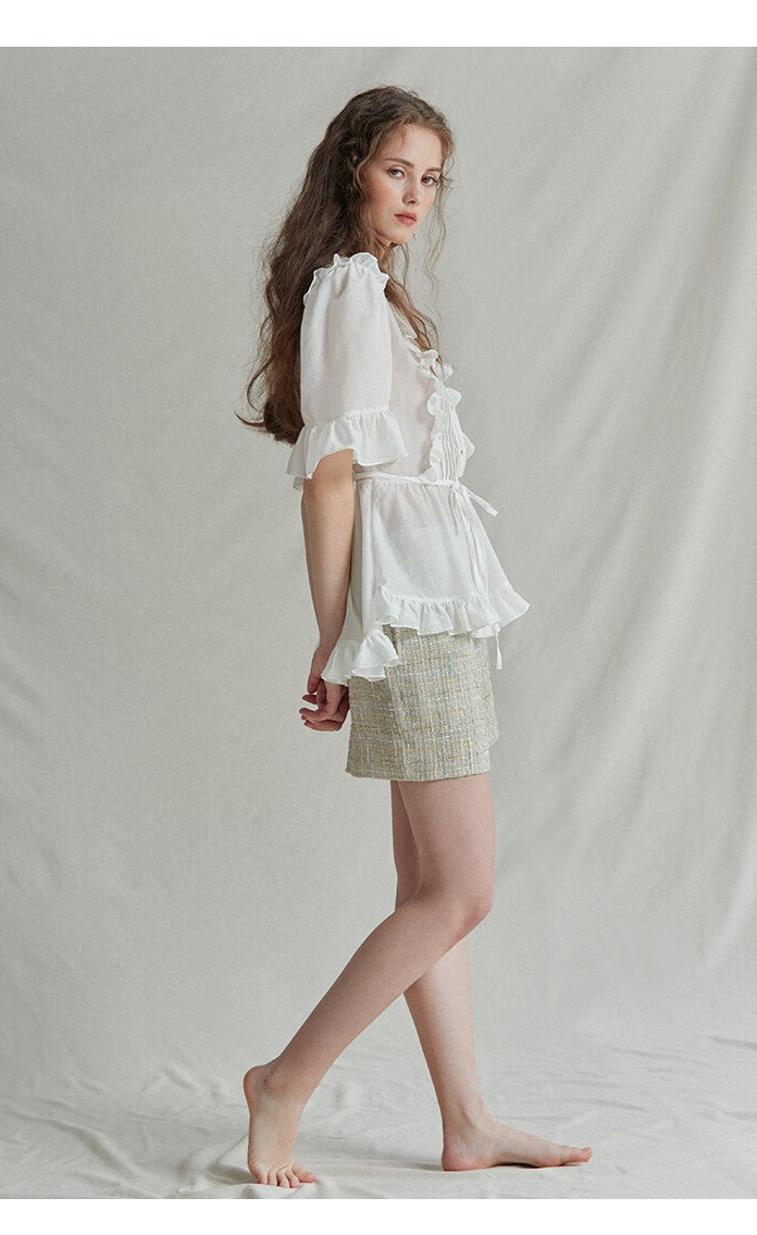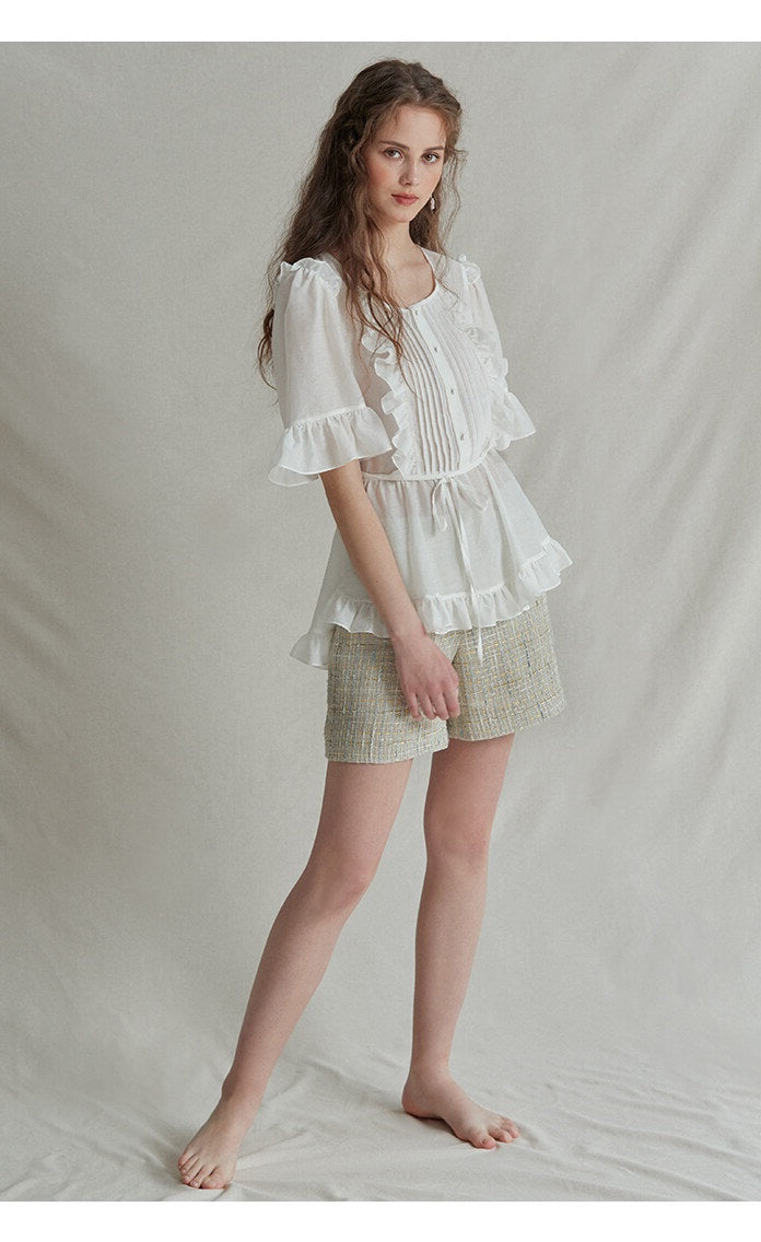 The Ruffle Trim Linen Top by Sarah Luton captures refined femininity through every detail. Designed in breathable linen, this top features a soft pleated front framed with romantic ruffles, voluminous half sleeves, and a delicate tie waist for a flattering silhouette. Whether paired with tailored shorts or high-waisted trousers, it transitions seamlessly from casual brunch to weekend garden gatherings. A charming staple for the modern romantic.