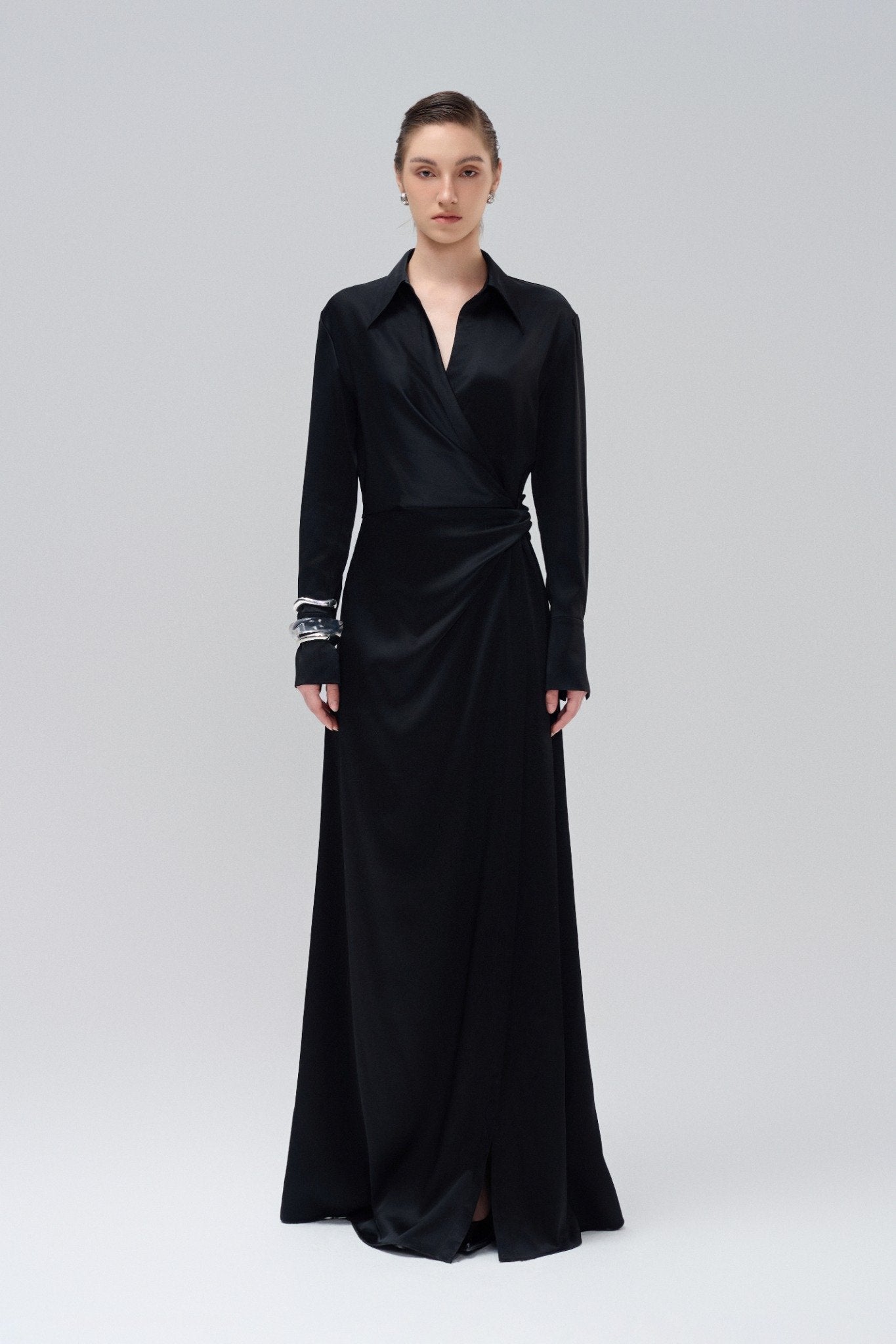 The Laura Ren satin maxi dress brings refined sophistication to modern eveningwear with its fluid silhouette and lustrous drape. Designed with a wrapped waist that creates a natural cinch, this full-length piece features a collared neckline and structured shoulders, delivering a strong, feminine profile. Buttoned cuffs add tailored elegance, while the long sleeves and front overlap create graceful movement. Whether styled with statement jewelry or minimalist heels, this piece transitions seamlessly from formal events to luxury gatherings.