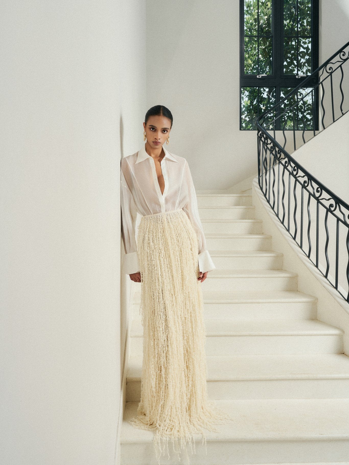 Designed for the modern wardrobe, this sheer blouse from Laura Ren combines architectural structure with soft femininity. The sharply tailored collar and exaggerated cuffs create a striking silhouette, while the transparent finish adds sensual contrast. Whether paired with fluid skirts or structured trousers, it transitions effortlessly from day to evening. A standout piece that defines elegant versatility, perfect for elevated everyday dressing.