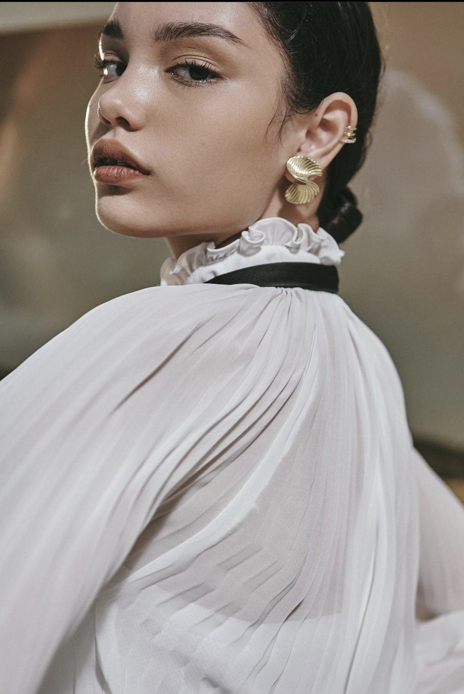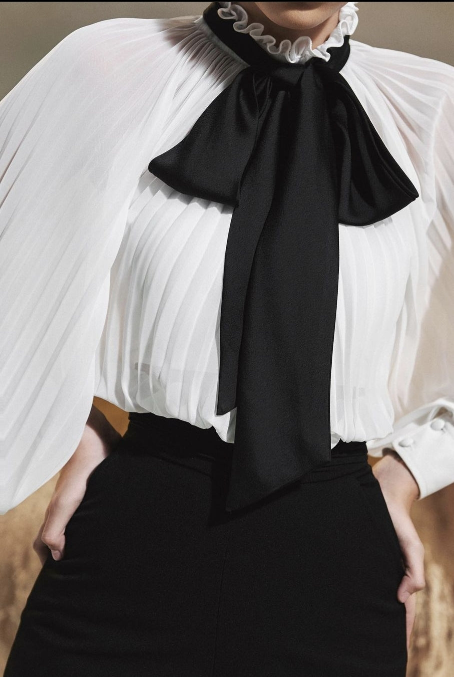 Elevate your wardrobe with this sheer organza blouse from Sarah Luton, crafted for timeless sophistication. Featuring meticulously pleated bishop sleeves and an exaggerated black bow tie at the neckline, this blouse adds drama and elegance to both tailored pants and skirts. The delicate organza fabric offers a light, ethereal texture while maintaining structure and volume. A refined high ruffled collar completes the design, perfect for modern women seeking polished statements. Discover Sarah Luton’s blend of couture detail and everyday wearability with this effortlessly elegant blouse.