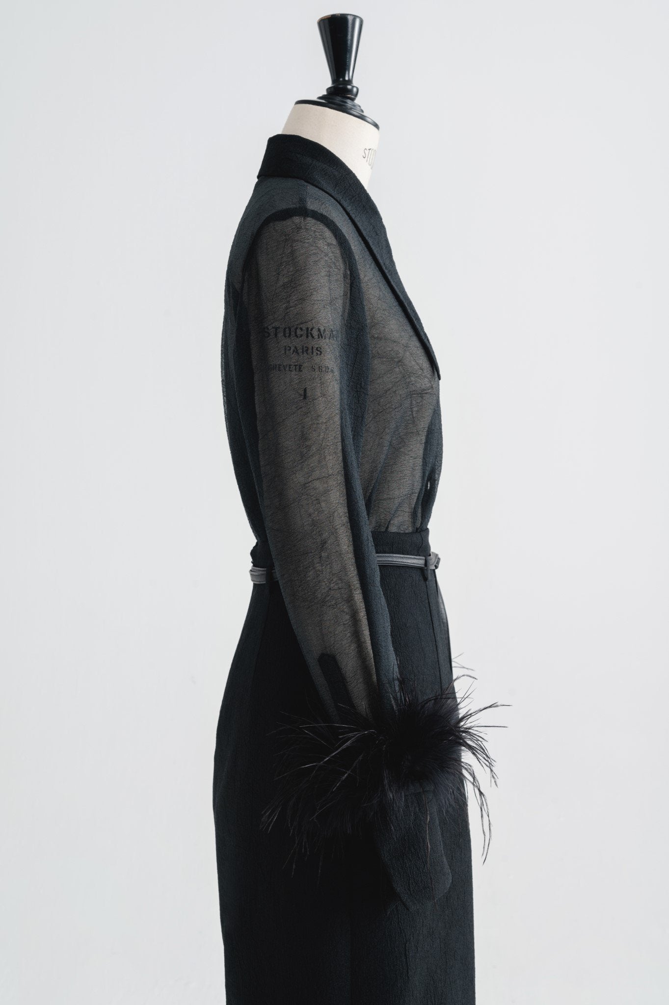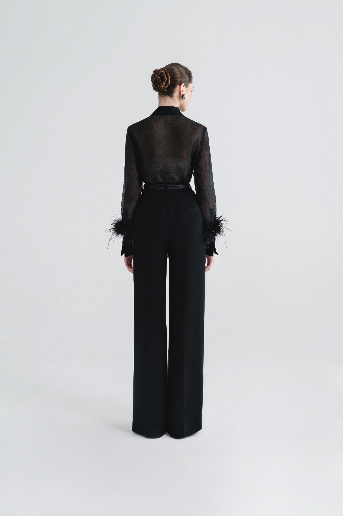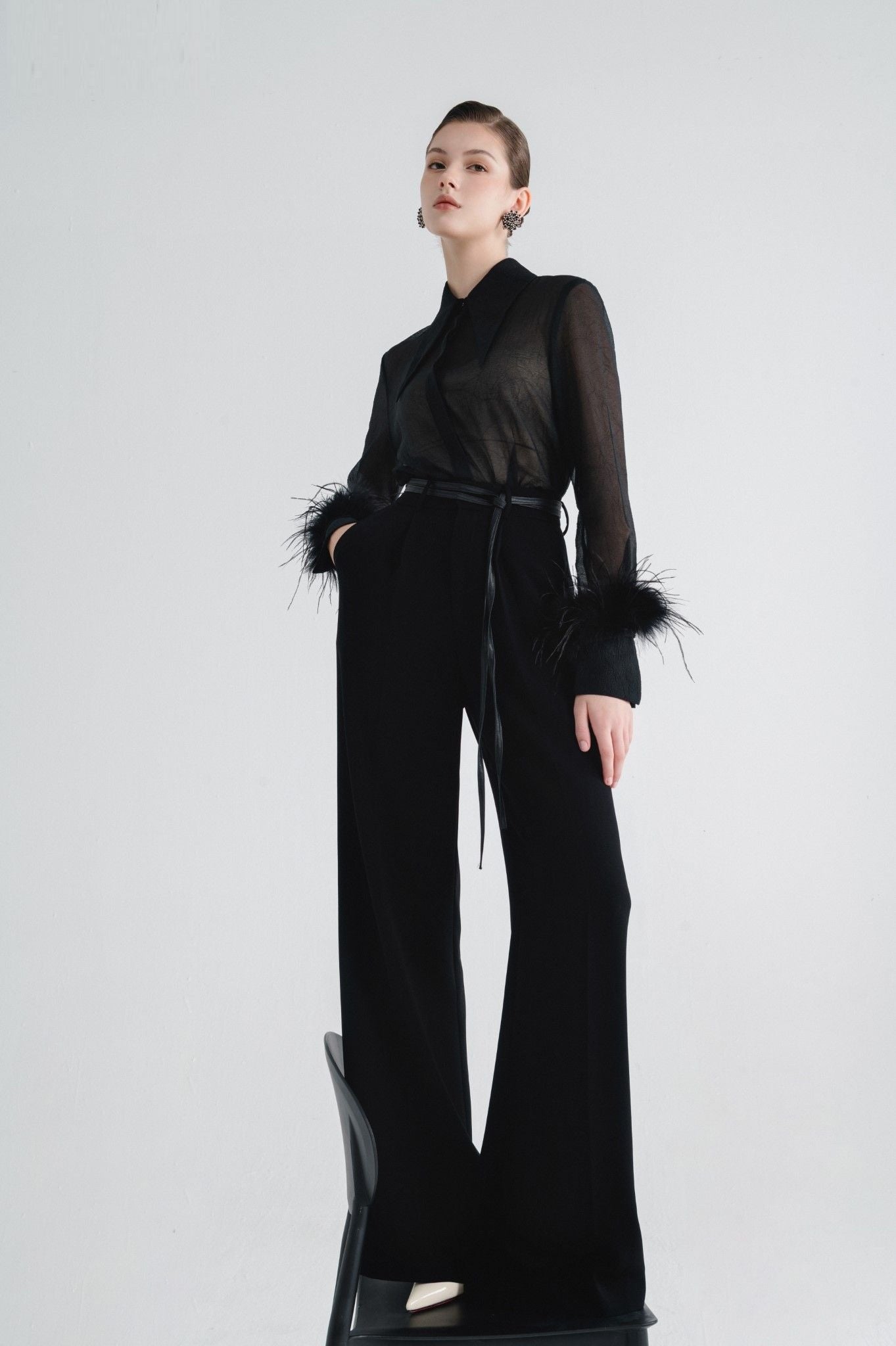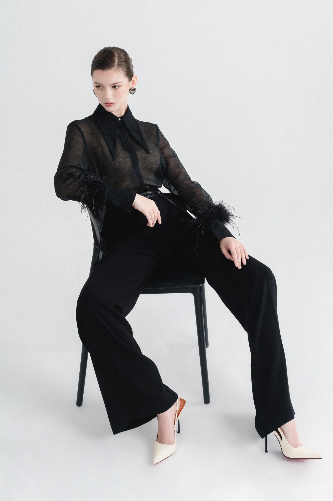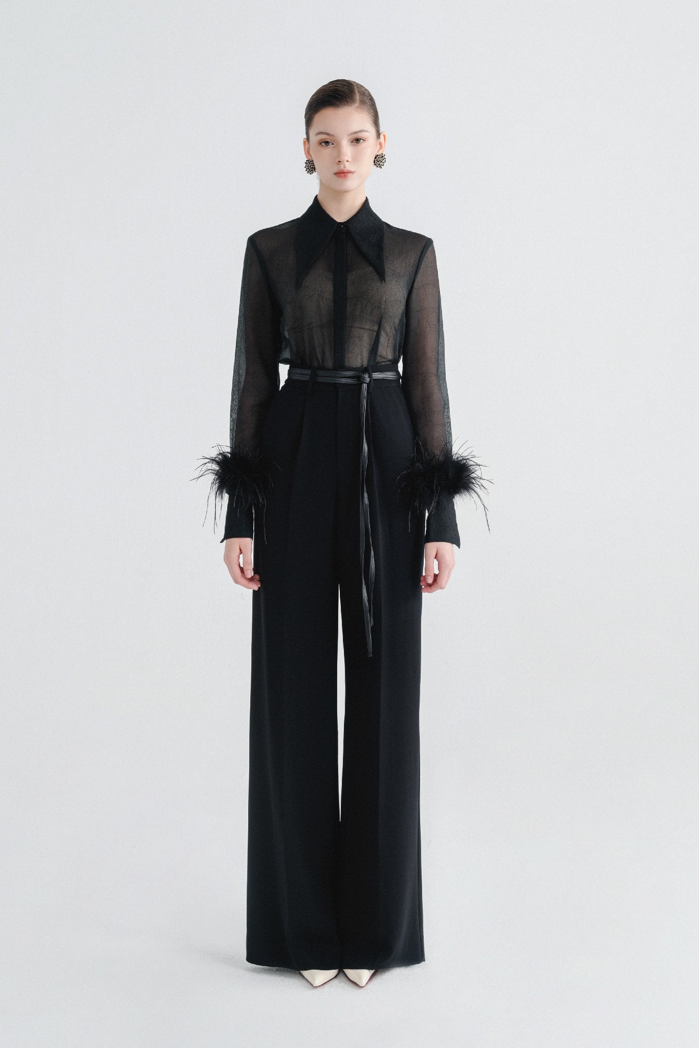 This sheer tailored shirt by Laura Ren is a striking fusion of elegance and edge, perfect for evening dressing or elevated daywear. Designed with a sharp pointed collar and elongated cuffs adorned with feather detailing, it adds bold sophistication to any wardrobe. The transparent finish enhances the fluid silhouette while offering styling versatility layered over or under other pieces. Finished with a sleek concealed button placket and precise tailoring, this shirt exemplifies Laura Ren’s signature refinement with modern allure. Ideal for statement styling with high-waisted trousers or skirts.