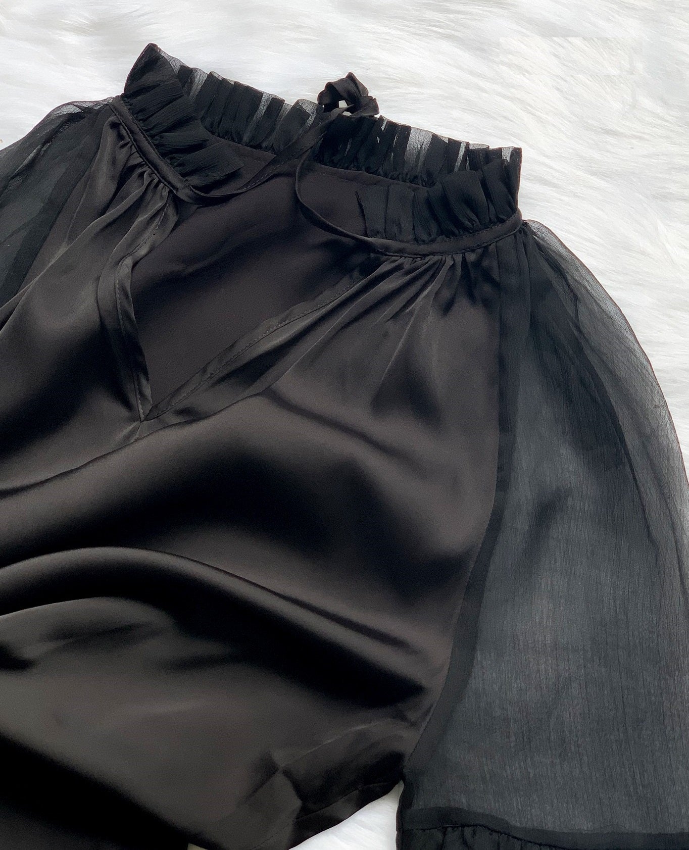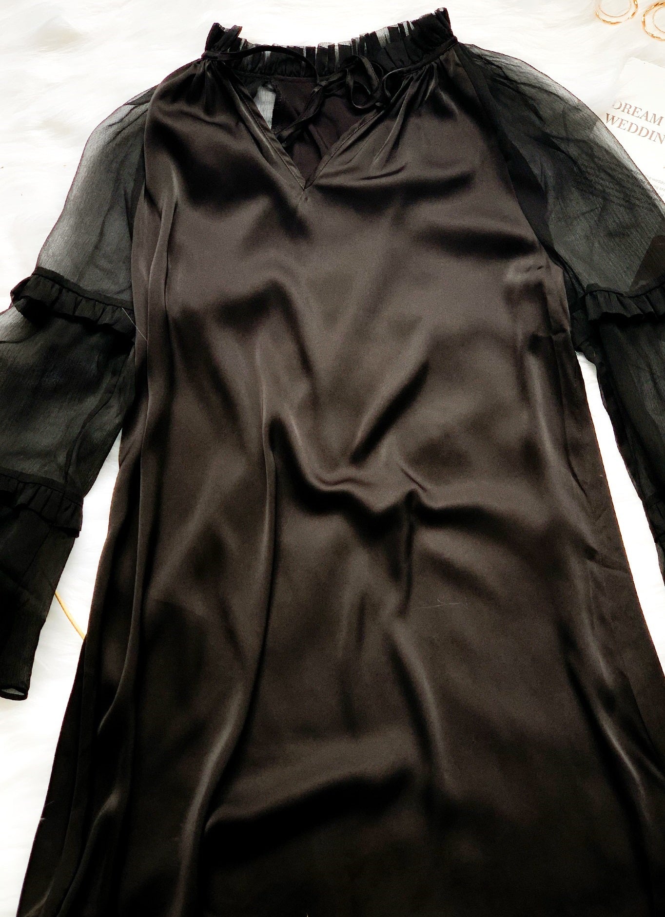 The Sarah Luton silk dress is a statement piece that blends sophistication with playful elegance. Designed in premium silk, this A-line mini dress features romantic sheer sleeves with tiered ruffle accents and a delicate tie neckline. Perfect for day-to-night transitions, its fluid silhouette and refined details make it a wardrobe essential for modern women.