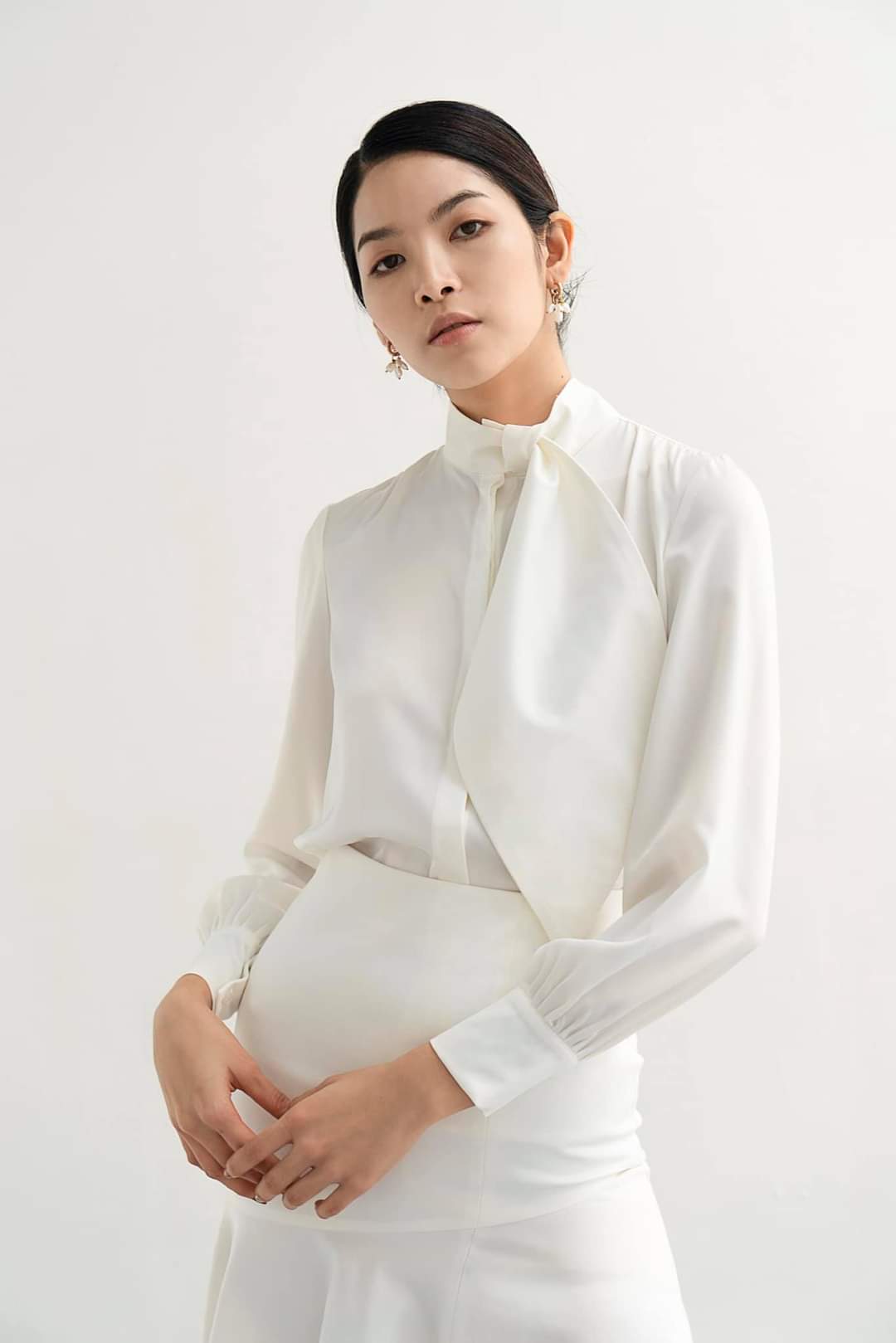 This elegant silk blouse from Sarah Luton redefines minimalism with a sculptural twist. Crafted from lustrous silk, it features a refined high neckline complemented by an asymmetrical draped necktie detail that flows with natural elegance. The tailored silhouette is finished with long sleeves gathered at the cuff for a soft touch of volume. Lightweight yet polished, this blouse is perfect for professional styling or formal events. A timeless piece that balances classic femininity with architectural modernity, it elevates any wardrobe with understated sophistication.