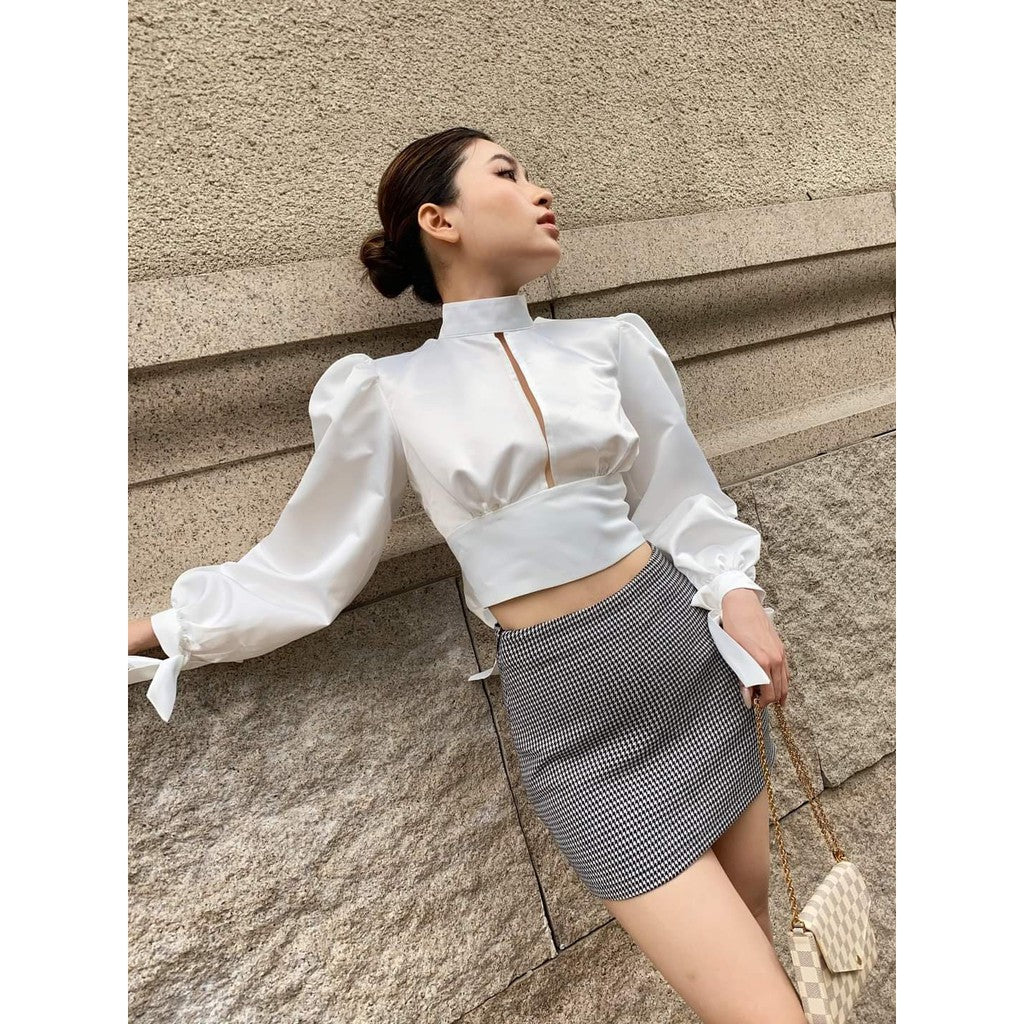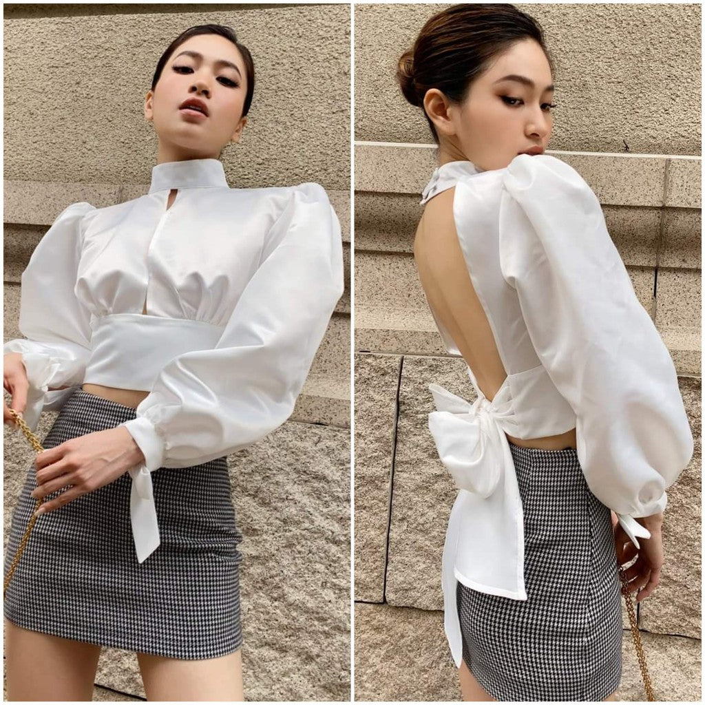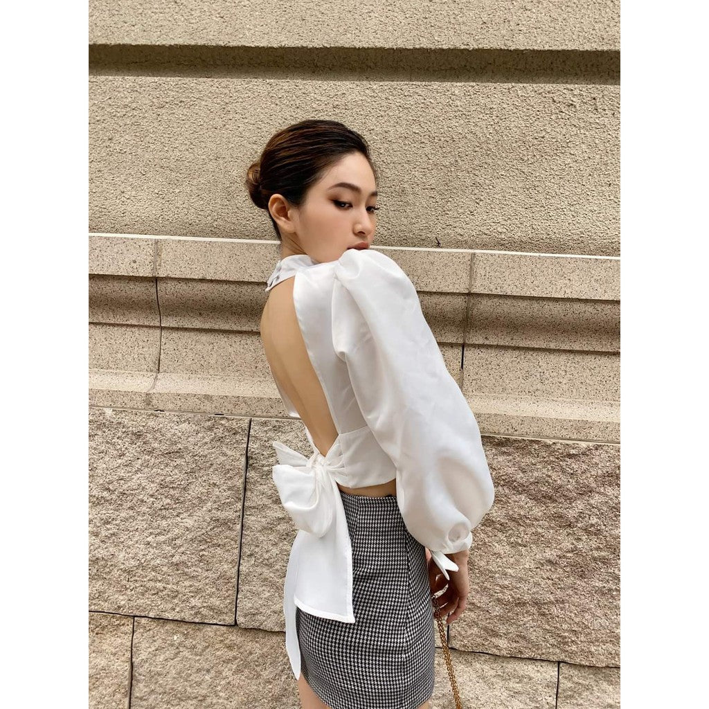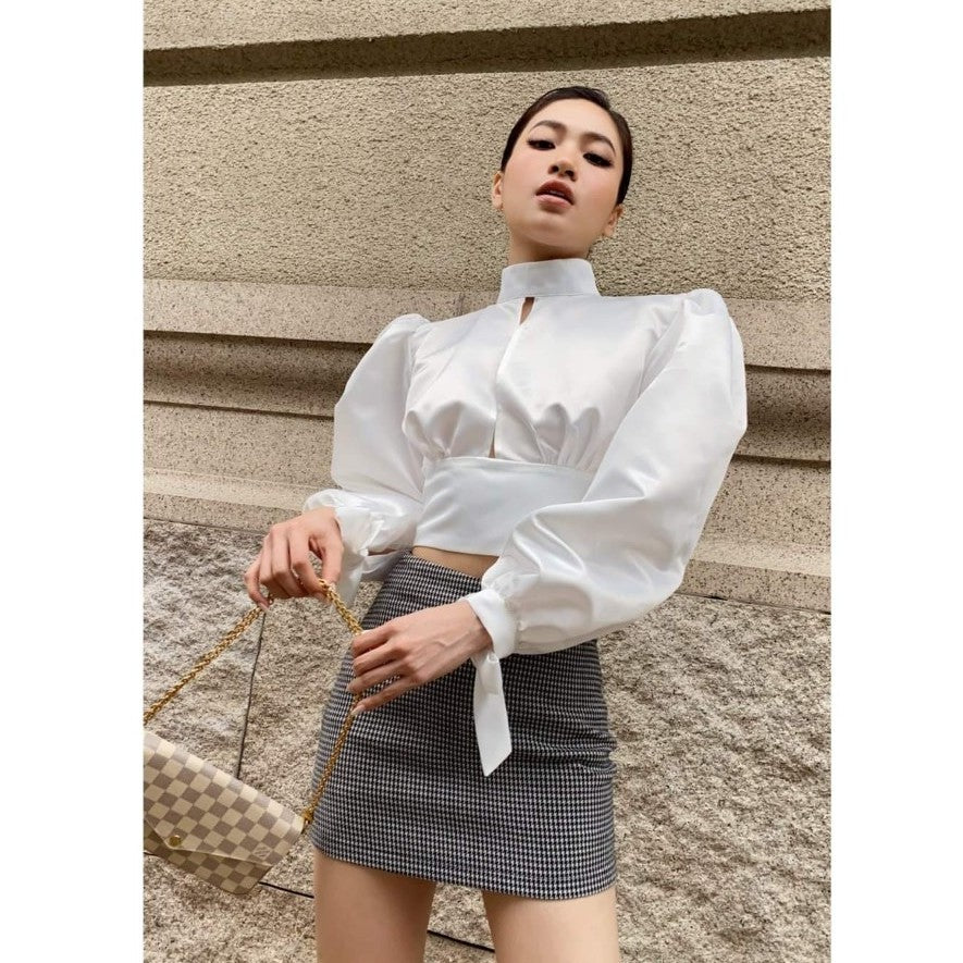 This silk blouse from Sarah Luton is a striking fusion of elegance and contemporary edge. Crafted from lustrous silk, it features voluminous puff sleeves, a sleek high neckline, and a slender front slit for subtle allure. The backless design is elevated with an oversized bow tie at the waist, adding a graceful touch to its tailored fit. Perfect for both elevated daywear and evening events, this piece is designed to flatter and turn heads. Style it with a fitted skirt or tailored trousers to bring out its modern feminine silhouette. An exquisite addition to your wardrobe, this silk blouse redefines sophisticated dressing.