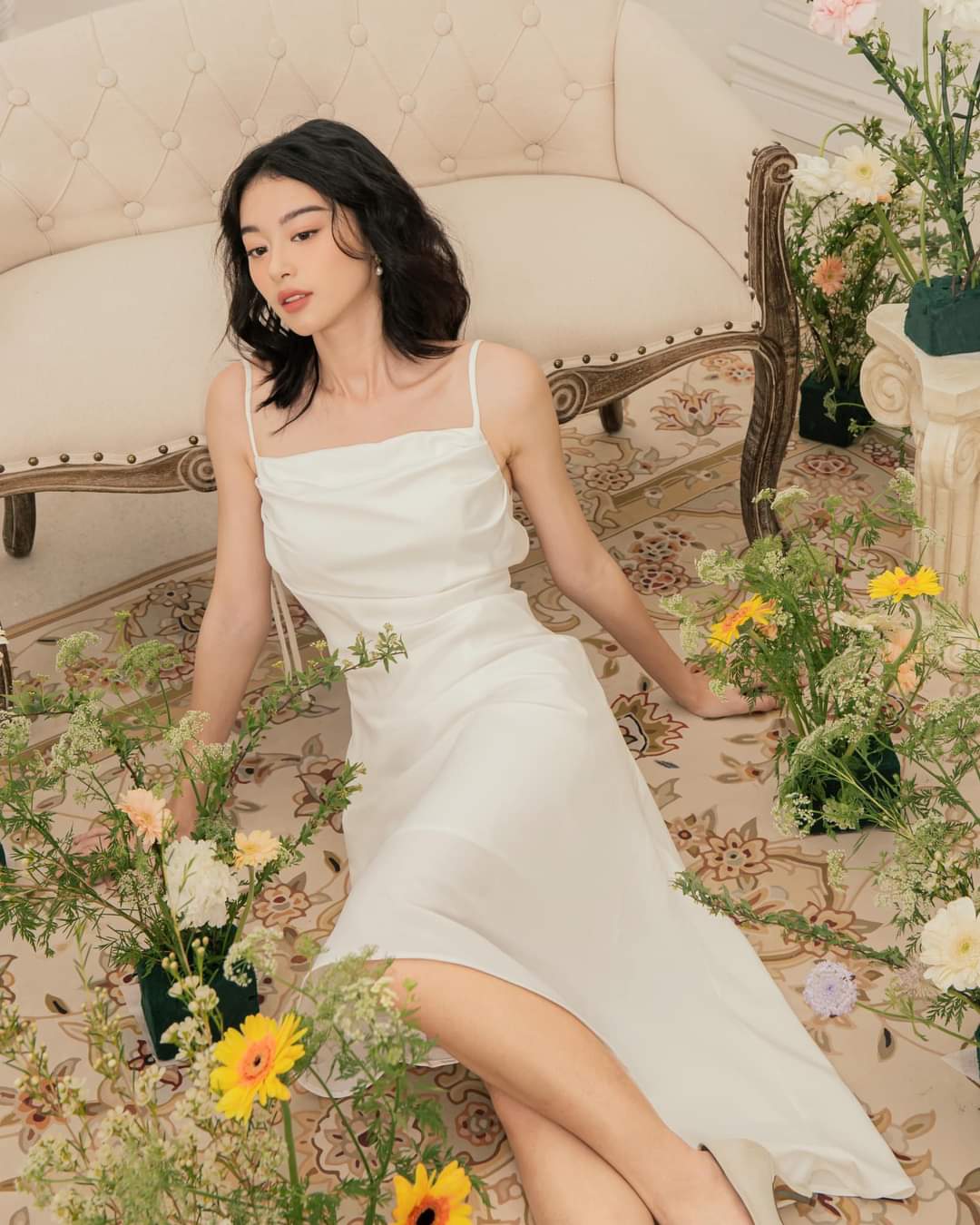 Elevate your wardrobe with this elegant silk dress from Sarah Luton, expertly crafted to exude refined femininity. The smooth silk fabric glides effortlessly over the skin, enhanced by a graceful cowl neckline that flatters the collarbone. Featuring delicate spaghetti straps that tie at the shoulders, this piece offers adjustable styling and a barely-there aesthetic. The asymmetrical hem adds a modern twist, flowing with natural ease for every movement. Ideal for evening affairs or refined daytime occasions, this midi dress blends timeless design with contemporary charm.