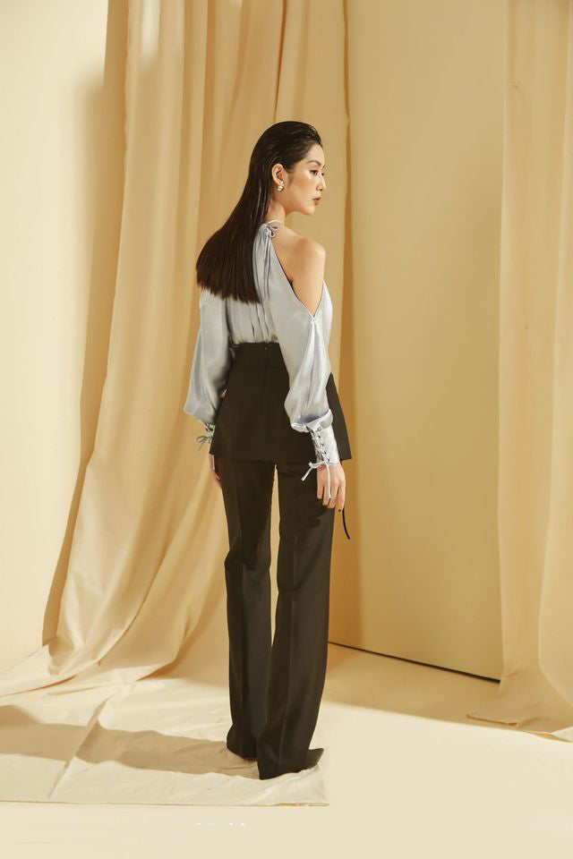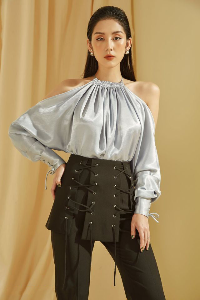 The Sarah Luton silk blouse redefines contemporary elegance with its fluid silhouette and artful details. Crafted from lustrous silk, this halter neck blouse features a softly gathered neckline, open shoulders, and voluminous balloon sleeves with delicate tie accents at the cuffs. The draped fabric creates graceful movement, while the exposed back adds a modern edge. Perfect for both refined evening looks and elevated daywear, this blouse is a statement piece that embodies confidence and sophistication. Add a bold yet feminine touch to your wardrobe with this striking Sarah Luton design.