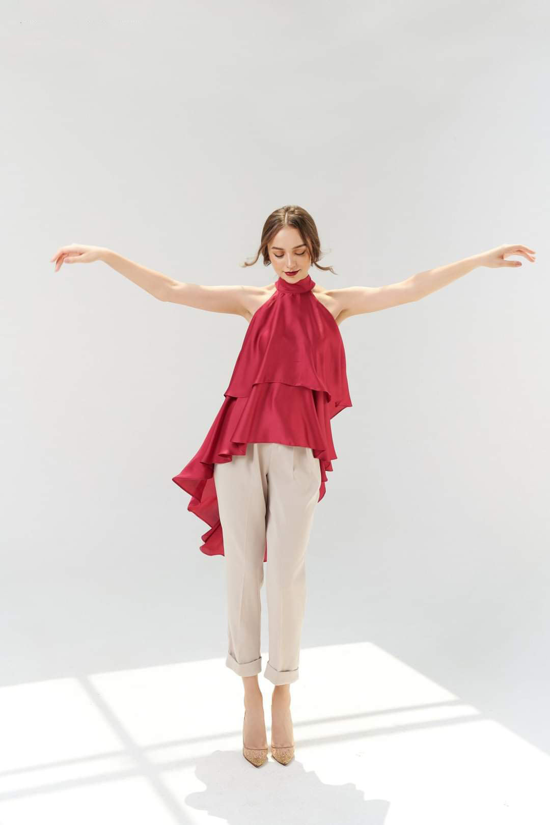 This silk halter top from Sarah Luton brings a statement silhouette to modern wardrobes. Crafted in lustrous silk, it features a flowy, tiered design with cascading ruffles that create dramatic movement. The high neckline adds an elegant frame, while the asymmetrical hem enhances its eye-catching appeal. Ideal for both day events and evening occasions, this piece pairs effortlessly with tailored trousers or skirts. Redefine chic versatility with this standout Sarah Luton creation designed for confident, contemporary women.