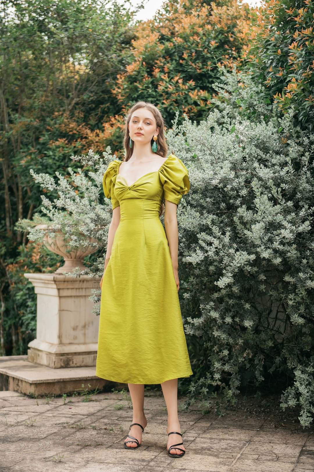 Striking and romantic, this silk midi dress features voluminous puff sleeves and a beautifully gathered sweetheart neckline that highlights the décolletage. The bodice is expertly tailored to sculpt the waist, while the flowing skirt adds soft movement and charm. A subtle sheen from the silk fabric enhances its elevated appeal, making it ideal for garden parties, outdoor events, or intimate gatherings. Crafted with attention to every detail, this elegant silhouette by Sarah Luton offers timeless femininity with a contemporary twist.