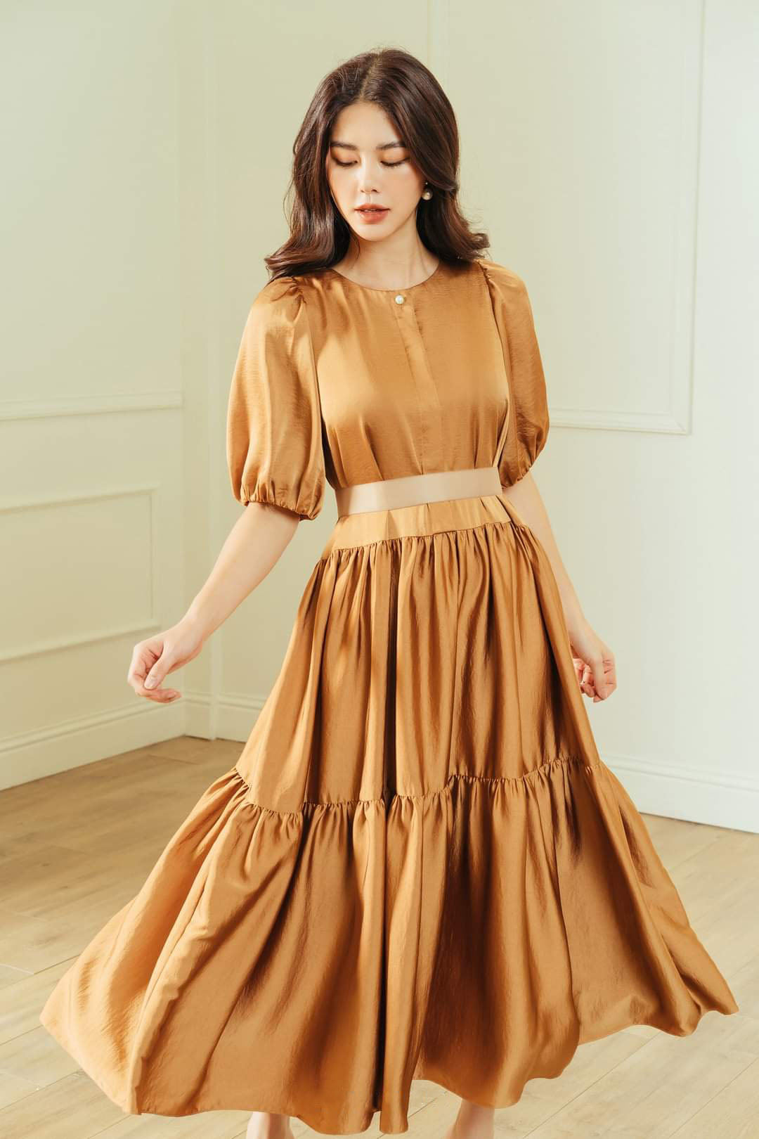 This silk midi dress by Sarah Luton is a graceful expression of romantic femininity. Designed with a round neckline and softly puffed short sleeves, it offers a delicate silhouette that flatters effortlessly. The waist is gently defined with a tailored band, flowing into a tiered, gathered skirt that moves with ease. Crafted from smooth, lightweight silk, the dress brings natural sheen and breathable comfort to any occasion. Ideal for garden parties, weekend brunches, or day-to-evening transitions, this Sarah Luton piece delivers timeless charm with modern refinement.