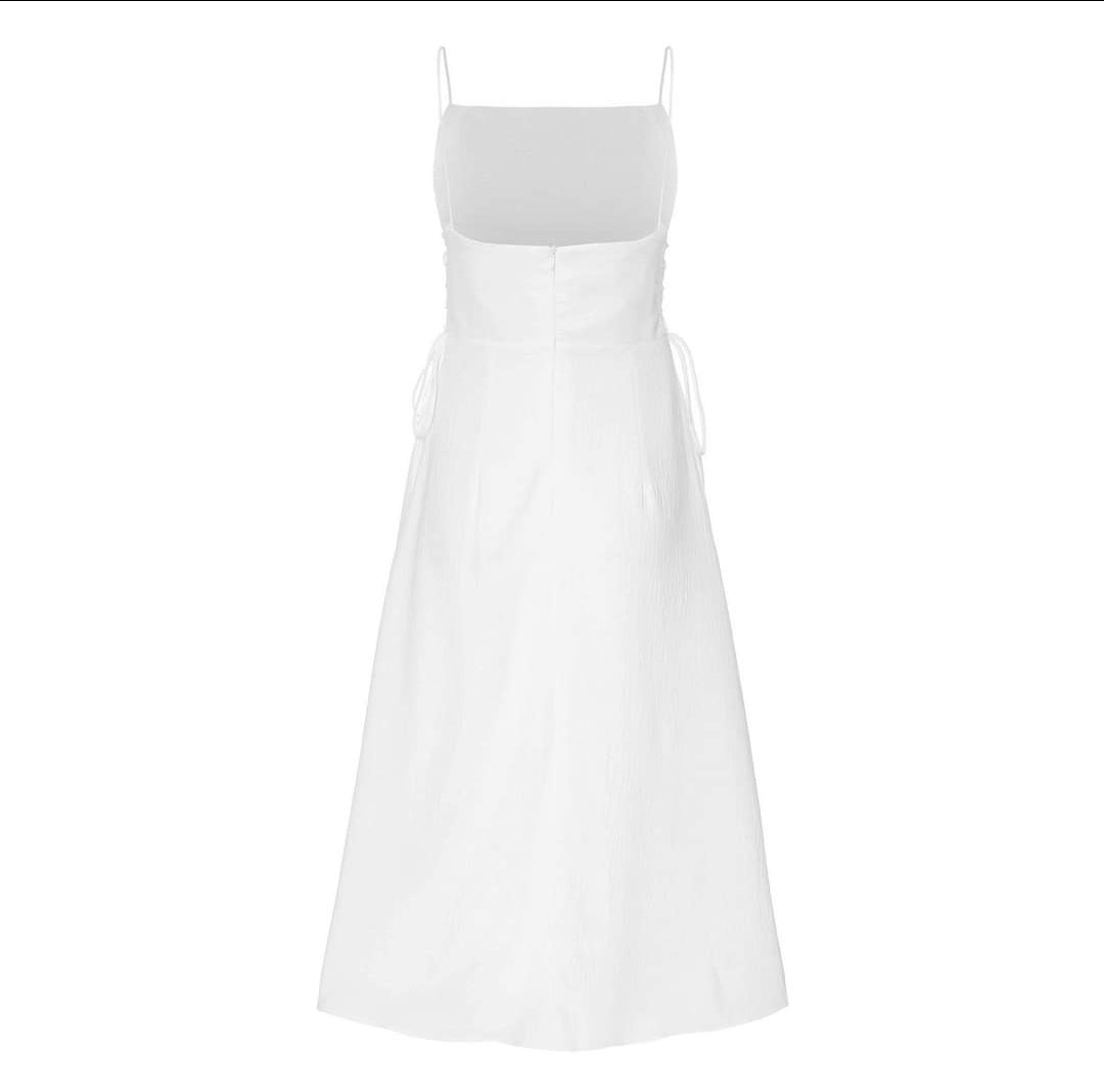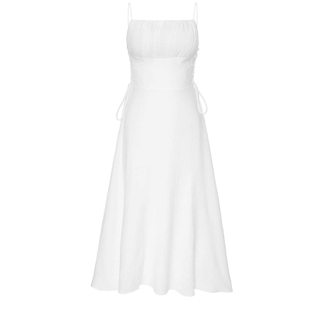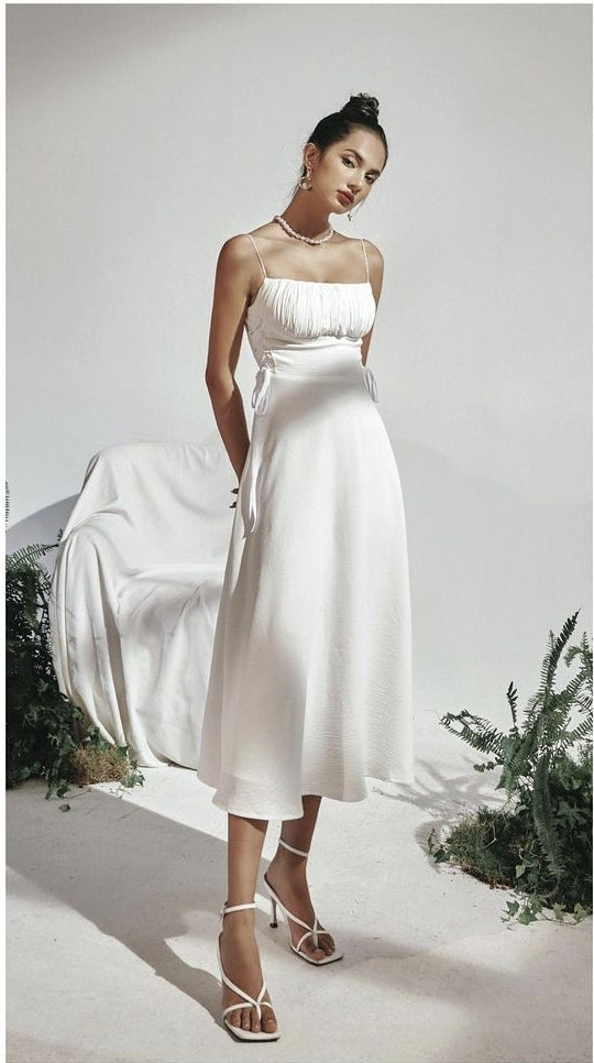Elevate your wardrobe with this graceful silk midi dress from Sarah Luton. Crafted from fluid silk, this design features a softly ruched bodice and delicate spaghetti straps for a refined, feminine shape. The contoured waist with adjustable side ties enhances the figure, while the midi-length skirt flows effortlessly with every step. Perfect for warm-weather occasions or minimalist evening styling, this timeless piece reflects Sarah Luton’s dedication to modern elegance and luxurious materials. Style it with strappy heels and delicate jewelry for a polished finish.