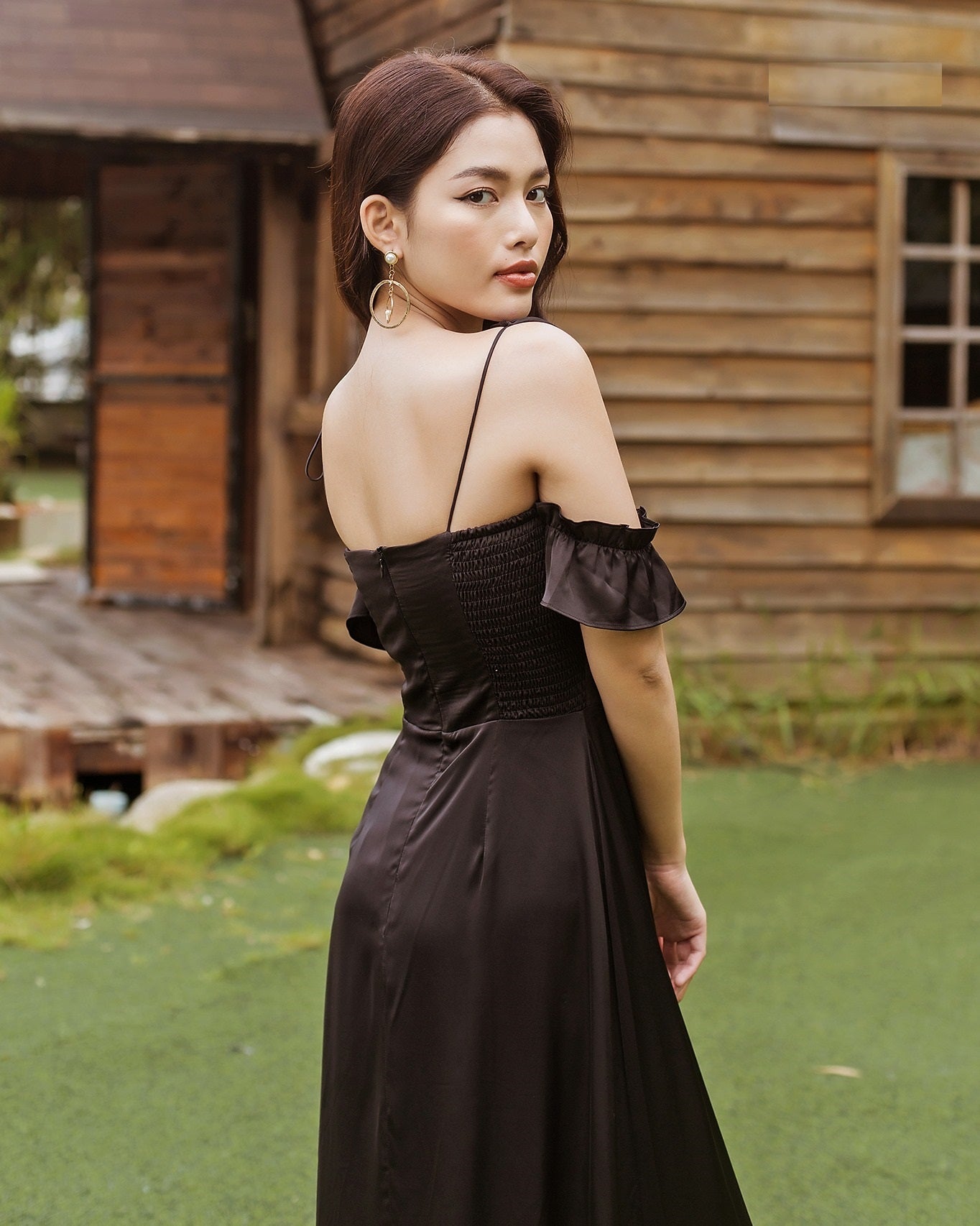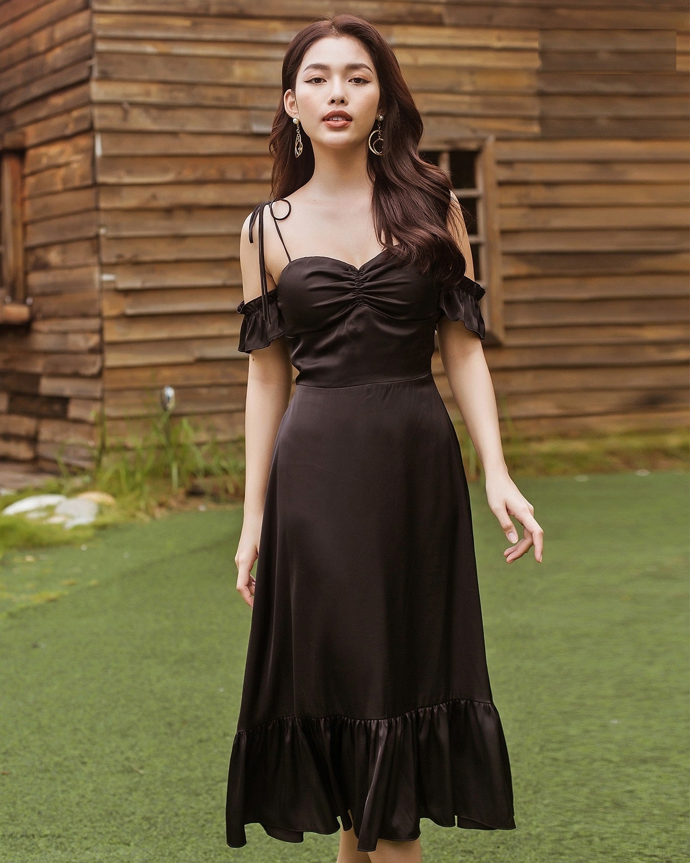 The Sarah Luton silk midi dress combines romantic femininity with elegant sophistication. Crafted from high-quality silk, it features delicate shoulder ties, a ruched sweetheart neckline, and off-shoulder ruffle sleeves. The sleek silhouette skims the body beautifully, while the flounced hem adds soft volume and movement. Perfect for special occasions or an elevated everyday look, this design embodies effortless charm and timeless appeal.