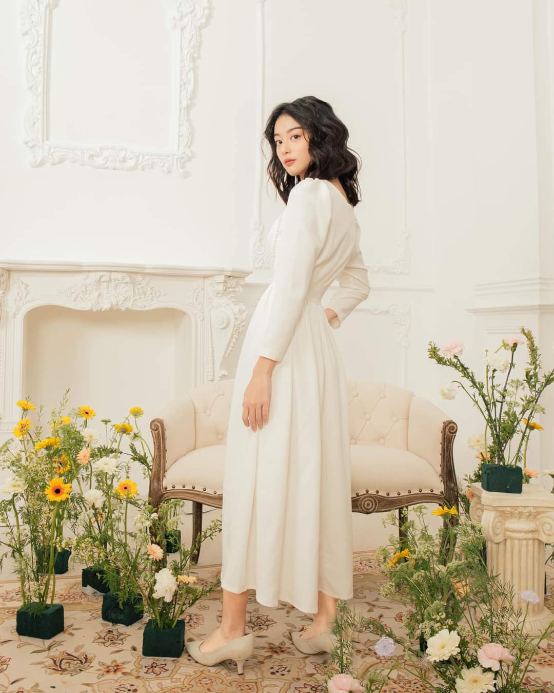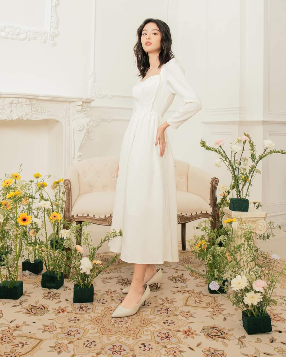 This silk dress by Sarah Luton captures timeless femininity through its elegant construction and romantic details. The design features a sculpted sweetheart neckline, long sleeves with subtle volume, and a softly gathered waistline that flatters the figure. Crafted from smooth silk, it offers a graceful drape and lightweight feel, perfect for elevated daywear or special occasions. The midi-length skirt flows beautifully with every step, making this dress a refined choice for the woman who values grace and sophistication.