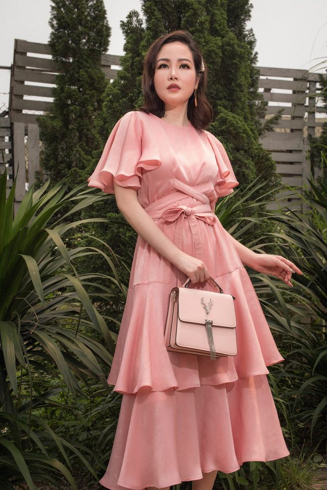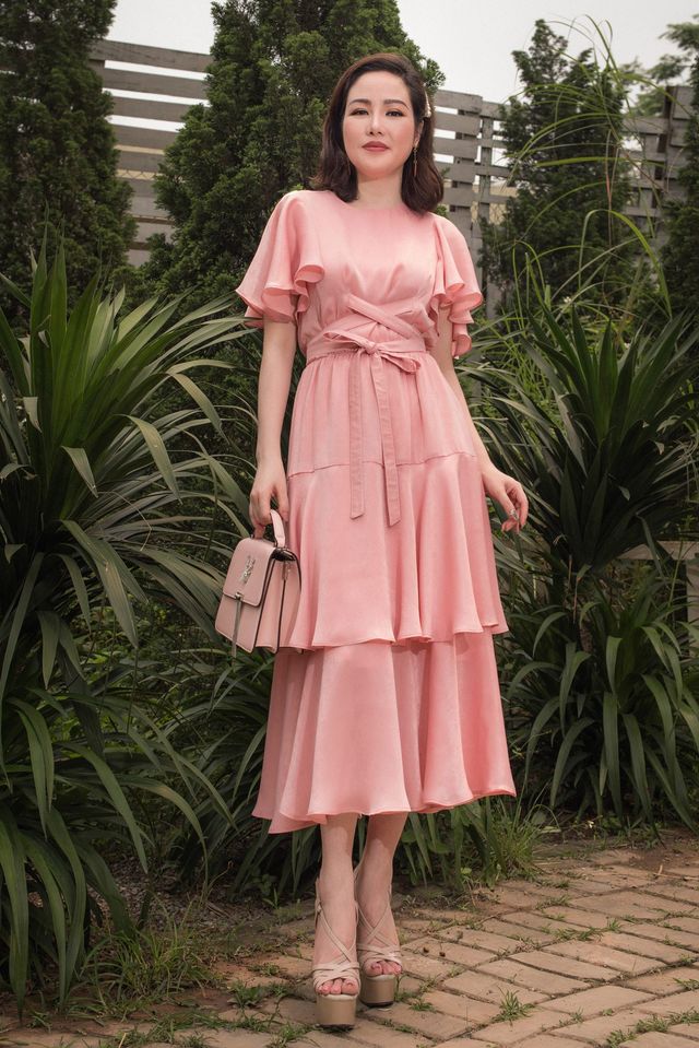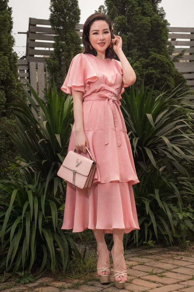 This silk midi dress from Sarah Luton exudes effortless elegance with its flowing silhouette and refined details. Featuring soft flutter sleeves and a round neckline, the design is cinched at the waist with a self-tie belt to create a flattering, feminine shape. The layered, tiered skirt moves beautifully with every step, enhancing the fluid drape of the silk fabric. Perfect for brunches, outdoor weddings, or stylish daytime events, this dress offers timeless charm and versatile sophistication. A wardrobe essential for refined and graceful dressing.