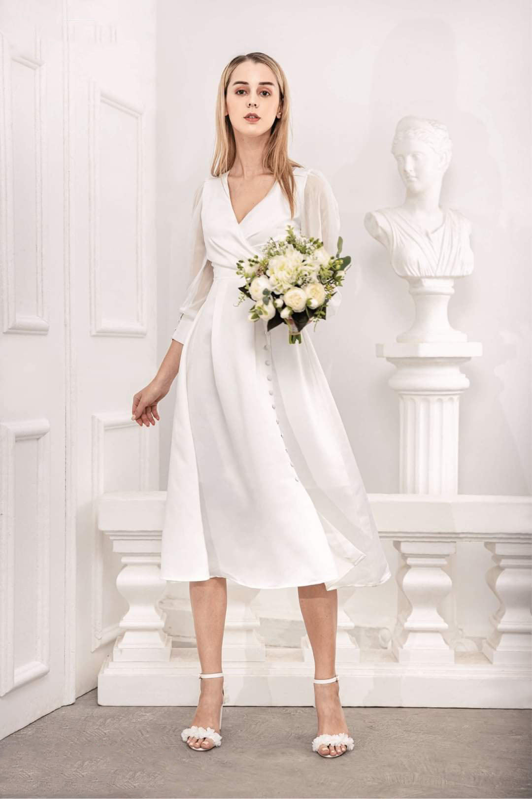 Crafted in delicate silk organza, this midi dress by Sarah Luton is a celebration of timeless femininity. Designed with a flattering wrap-style bodice and V-neckline, it enhances the silhouette while offering understated sophistication. The sheer long sleeves add an ethereal charm, balanced by a tailored cuff and button closure. A refined row of silk-covered buttons graces the side, lending classic structure to the fluid drape of the skirt. Ideal for bridal events, civil ceremonies, or formal occasions, this piece merges elegance with effortless grace.