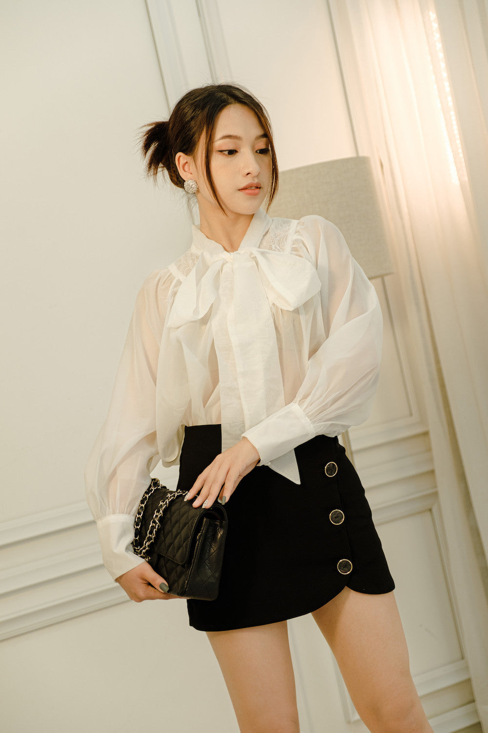 This mini skirt by Sarah Luton combines structured tailoring with sleek sophistication. Designed with a high-waisted silhouette and accented by an asymmetric hemline and bold decorative buttons, it offers a modern twist on a timeless classic. The fabric provides a smooth, luxurious finish with a subtle sheen, ideal for both professional and evening wear. Whether paired with a sheer blouse or structured blazer, this skirt is an effortlessly chic addition to any elevated wardrobe. Perfect for showcasing your legs while keeping a polished, contemporary edge.