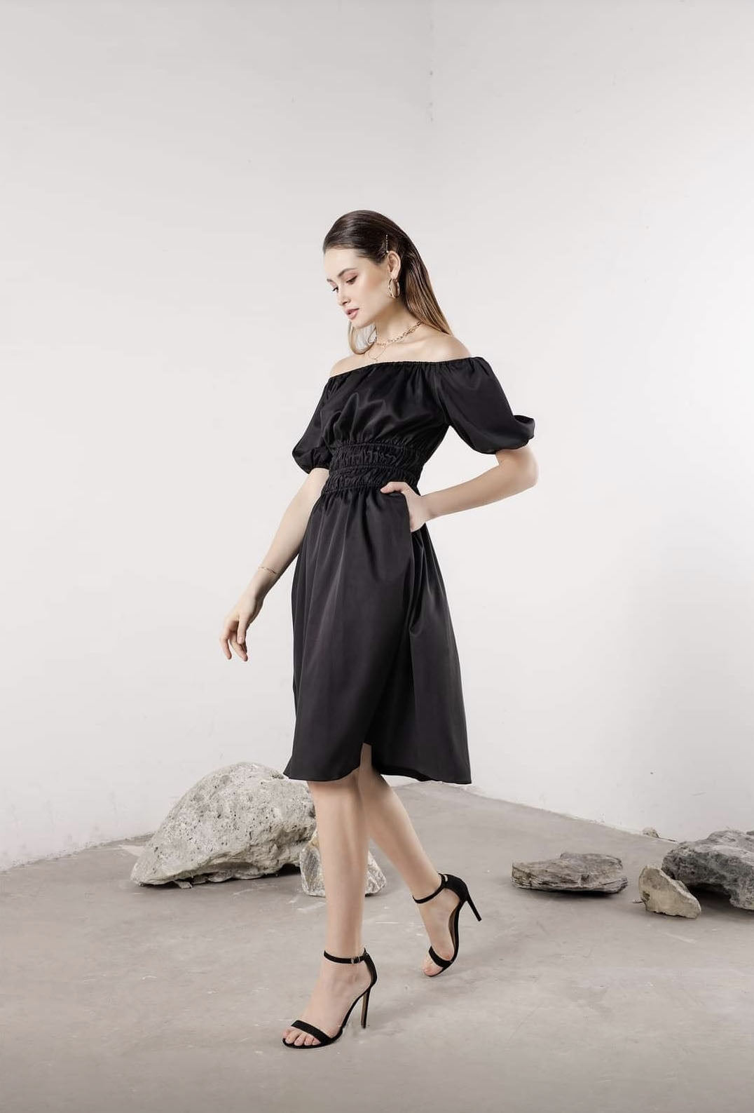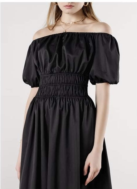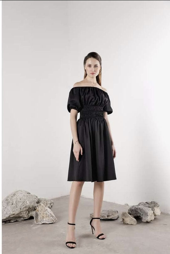 This off-shoulder silk midi dress by Sarah Luton combines romantic charm with modern elegance. Crafted from premium silk, the design features voluminous puff sleeves and a gathered neckline that beautifully frames the shoulders. The ruched bodice cinches at the waist for a flattering silhouette, while the flared skirt offers graceful movement. Ideal for garden parties, special gatherings, or refined daytime affairs, this dress brings together effortless sophistication and comfort in one striking look.