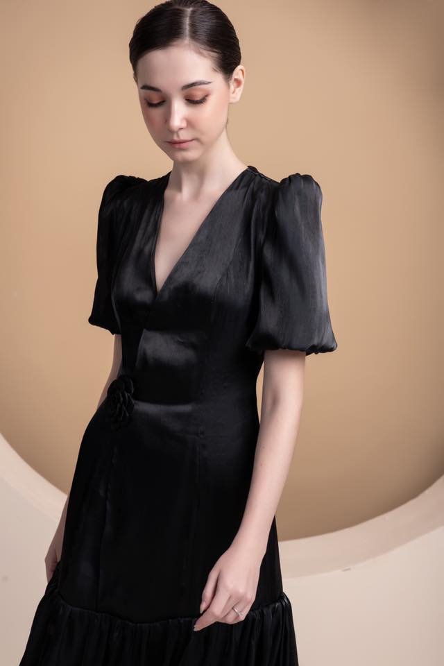 Elevate your eveningwear with this refined silk organza midi dress from Sarah Luton, designed to exude timeless grace. Crafted from lightweight silk organza, this piece features a flattering V-neckline, short puff sleeves, and a tailored bodice that flows into a soft gathered hemline. Its mid-length silhouette makes it perfect for elegant events, weddings, or formal dinners. The subtle sheen and delicate texture of the fabric highlight the sophistication of the design, ensuring you stand out effortlessly. Sarah Luton’s signature attention to detail and craftsmanship are evident in every seam of this ethereal creation.