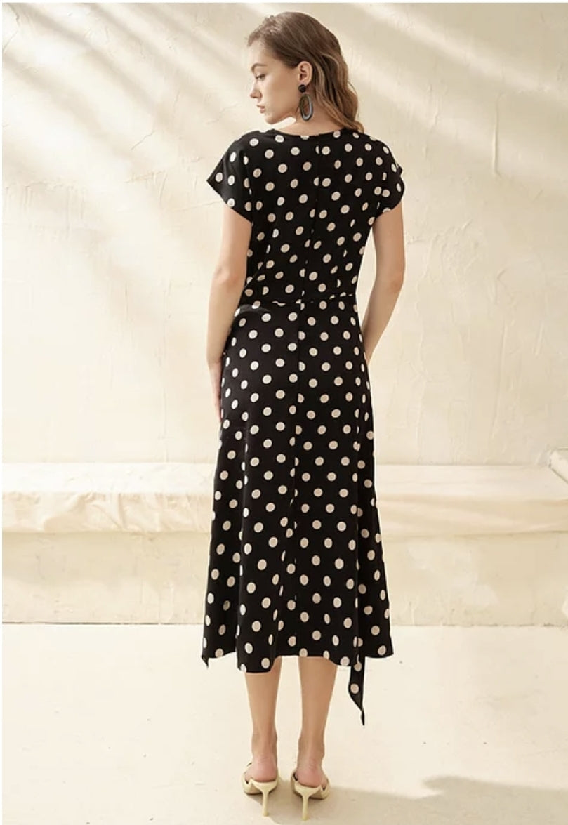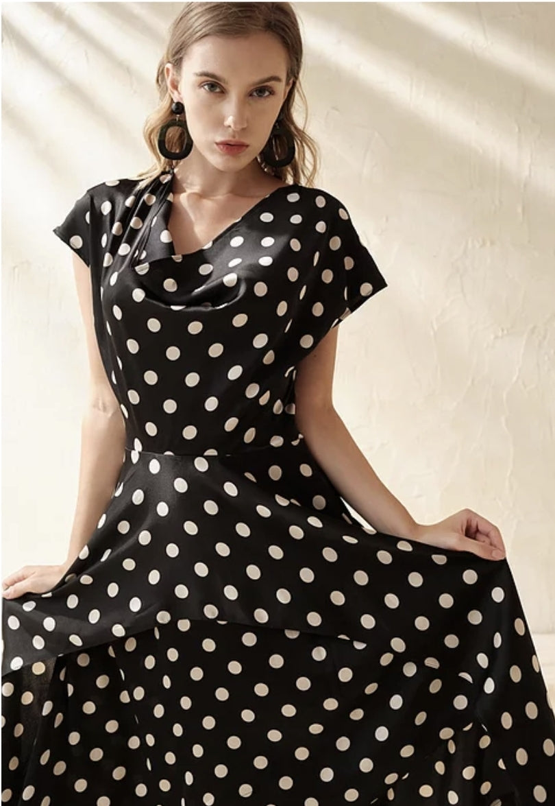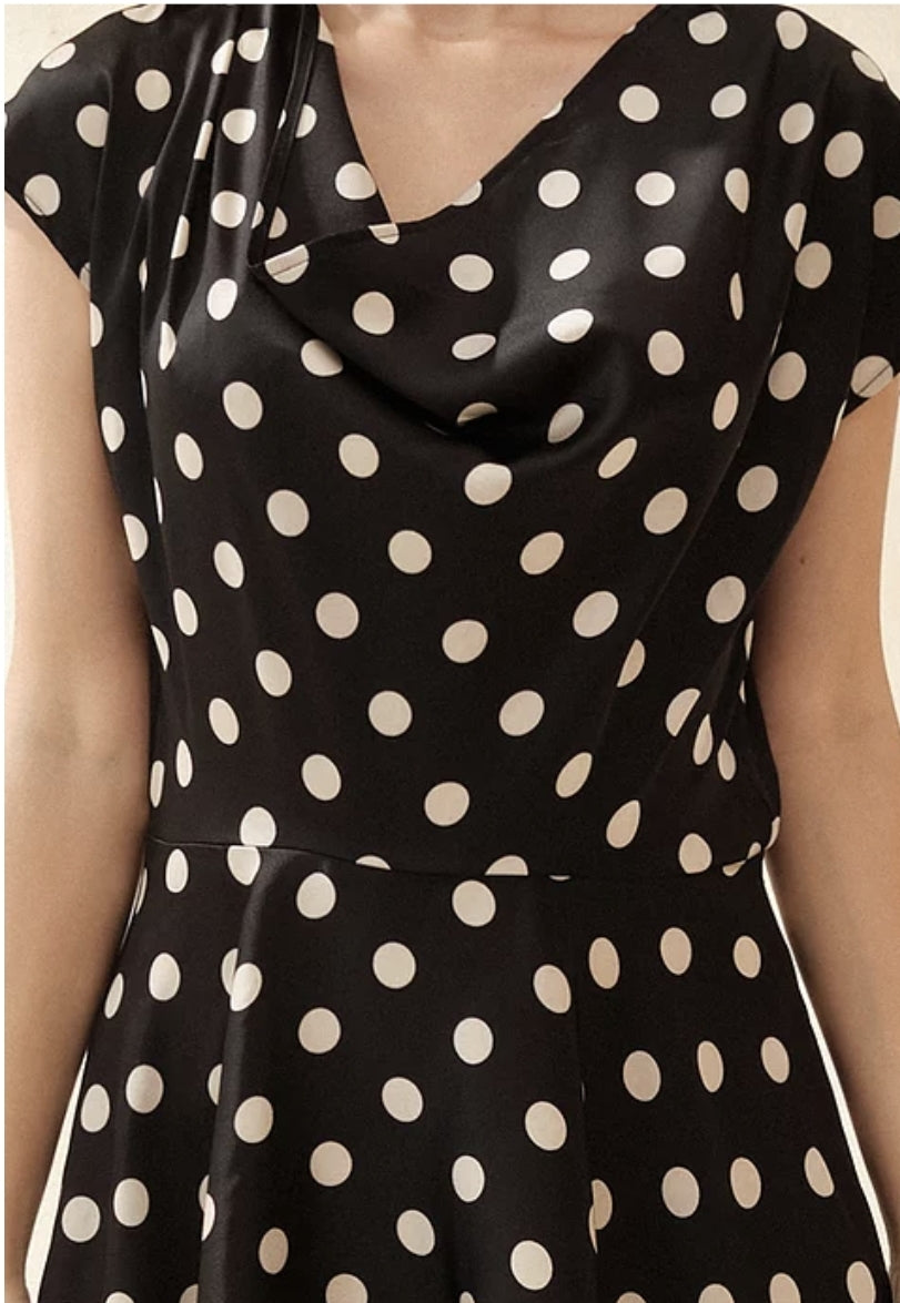 This silk dress from Sarah Luton captures effortless charm with a classic-meets-modern silhouette. Crafted from airy silk, it features a soft cowl neckline and a flattering fit-and-flare shape adorned with timeless polka dots. The asymmetrical hemline adds dynamic movement, making this piece ideal for both daytime elegance and evening outings. Light and fluid, the silk fabric enhances every step with graceful flow. Whether styled with heels or flats, this Sarah Luton dress is a standout choice for refined yet playful sophistication.