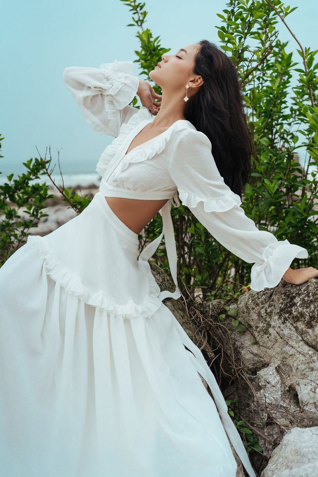 This silk maxi dress from Sarah Luton brings a poetic blend of modern elegance and vintage-inspired charm. Crafted from airy, premium silk, the dress features a flattering cut-out waist, V-neckline with ruffle detailing, and billowy long sleeves with tie cuffs. The flowing silhouette is finished with a ruffled trim skirt that adds soft volume and whimsical movement. Ideal for beachfront events, garden weddings, or summer escapes, this dress delivers an effortlessly romantic aesthetic with a contemporary twist.