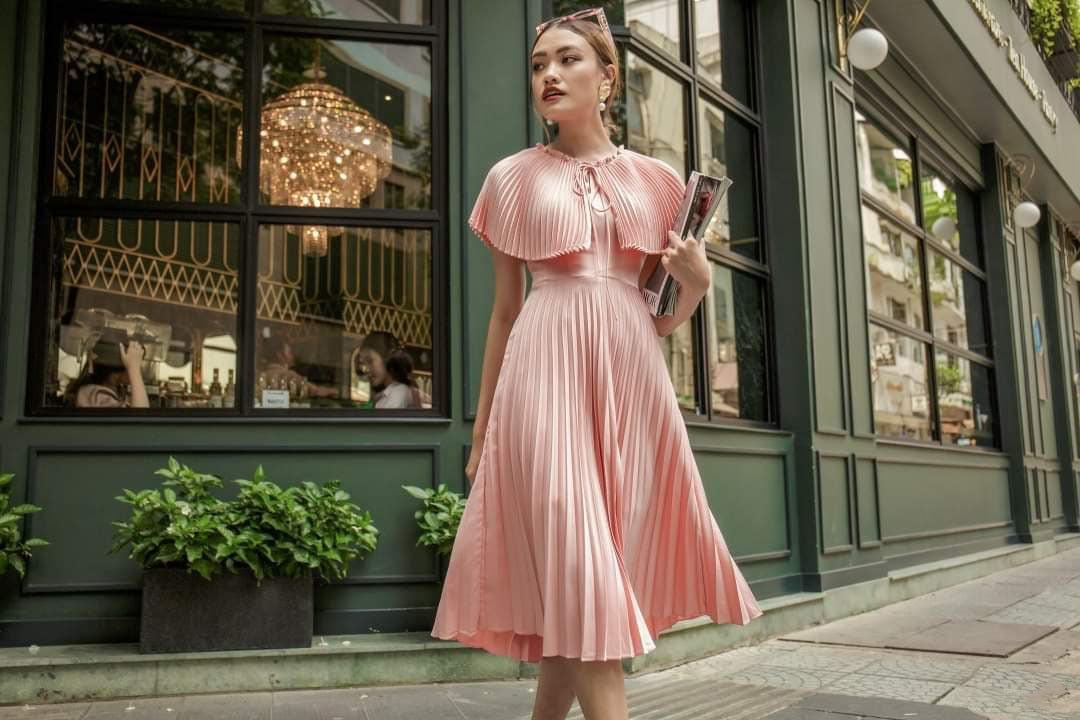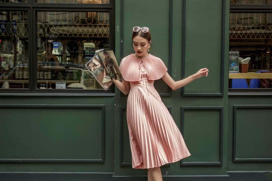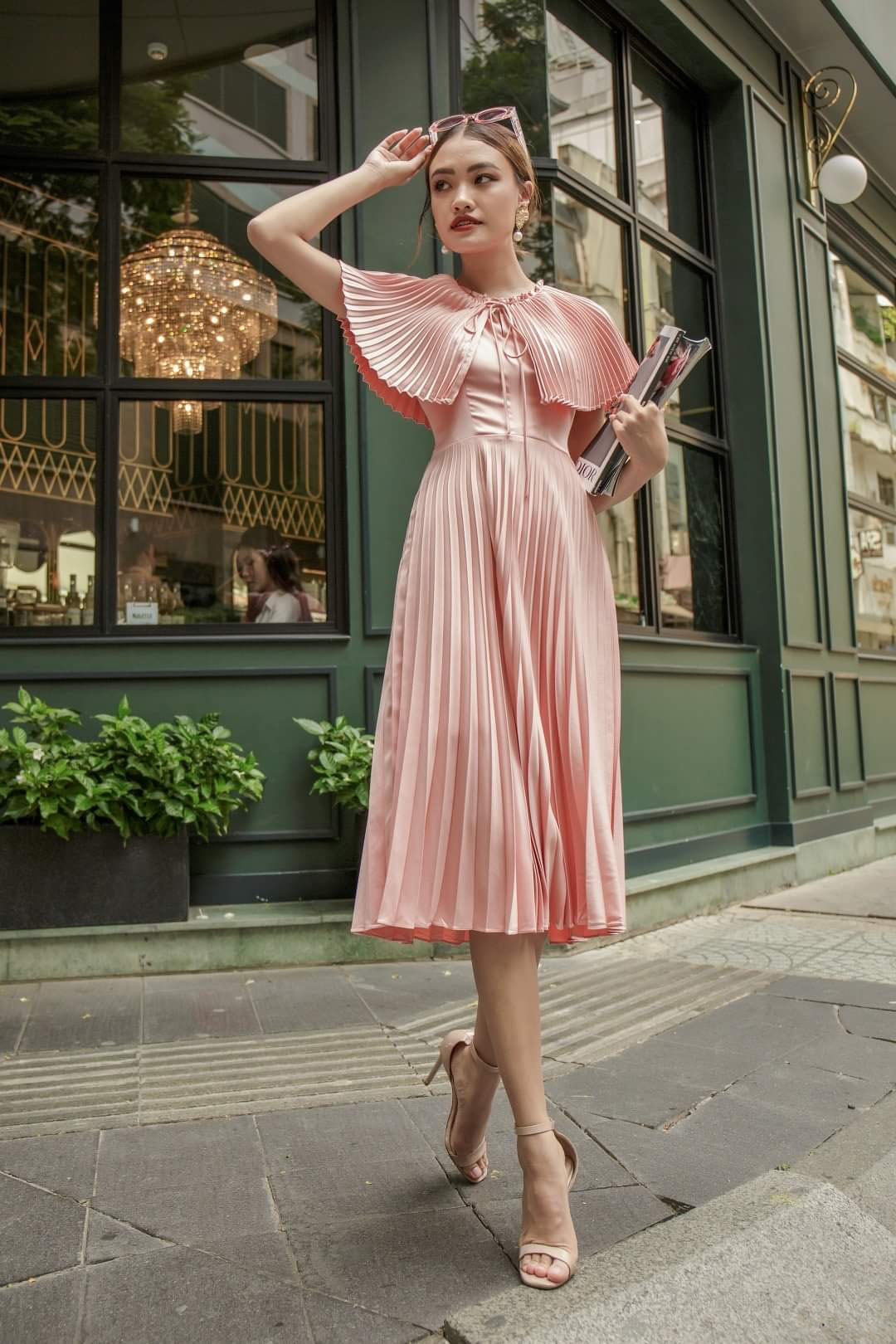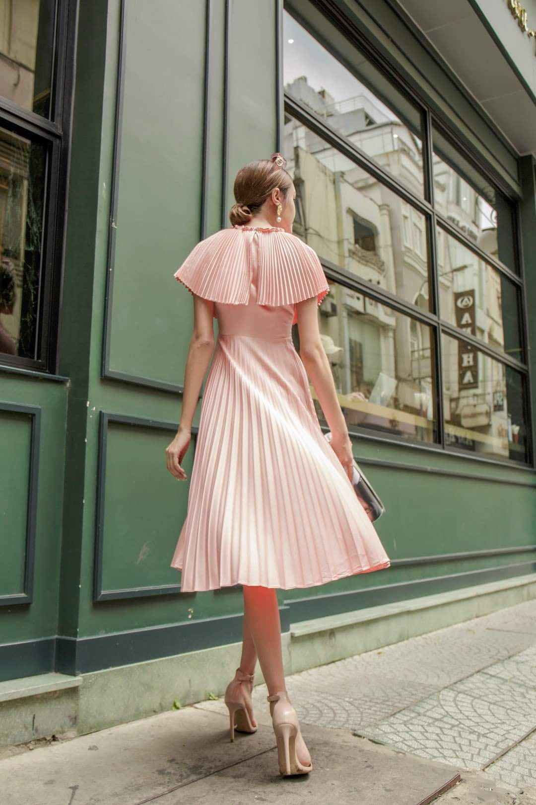 Crafted from fluid silk with a lustrous finish, this pleated midi dress by Sarah Luton exudes feminine refinement and architectural elegance. The design features a sculptural cape collar with soft ruffles and a delicate front tie, adding a touch of drama to the neckline. Precisely pleated throughout the skirt and shoulders, the silhouette moves gracefully while cinching softly at the waist for a flattering fit. Ideal for weddings, garden parties, or special occasions, this statement piece captures the effortless glamour that defines Sarah Luton’s modern aesthetic. Pair with strappy heels or neutral accessories for a complete polished look.
