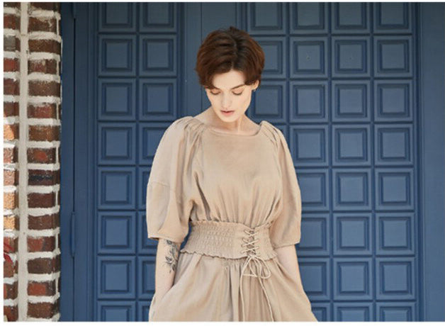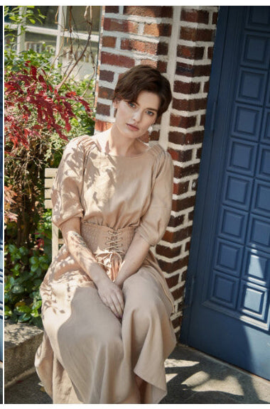 Sarah Luton presents this effortlessly elegant midi dress crafted from breathable linen, designed to blend comfort with sophistication. The dress features a relaxed silhouette enhanced by voluminous puff sleeves and a cinched smocked waist with lace-up detail, offering a flattering hourglass shape. A soft scoop neckline and concealed back zipper complete the look. Ideal for warm-weather days, brunches, or creative office settings, this dress brings natural texture and feminine charm to your wardrobe.