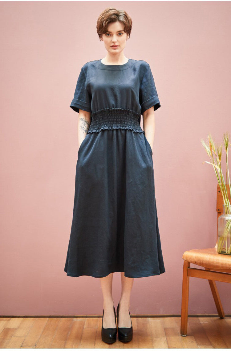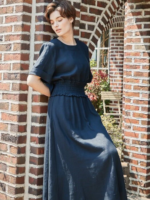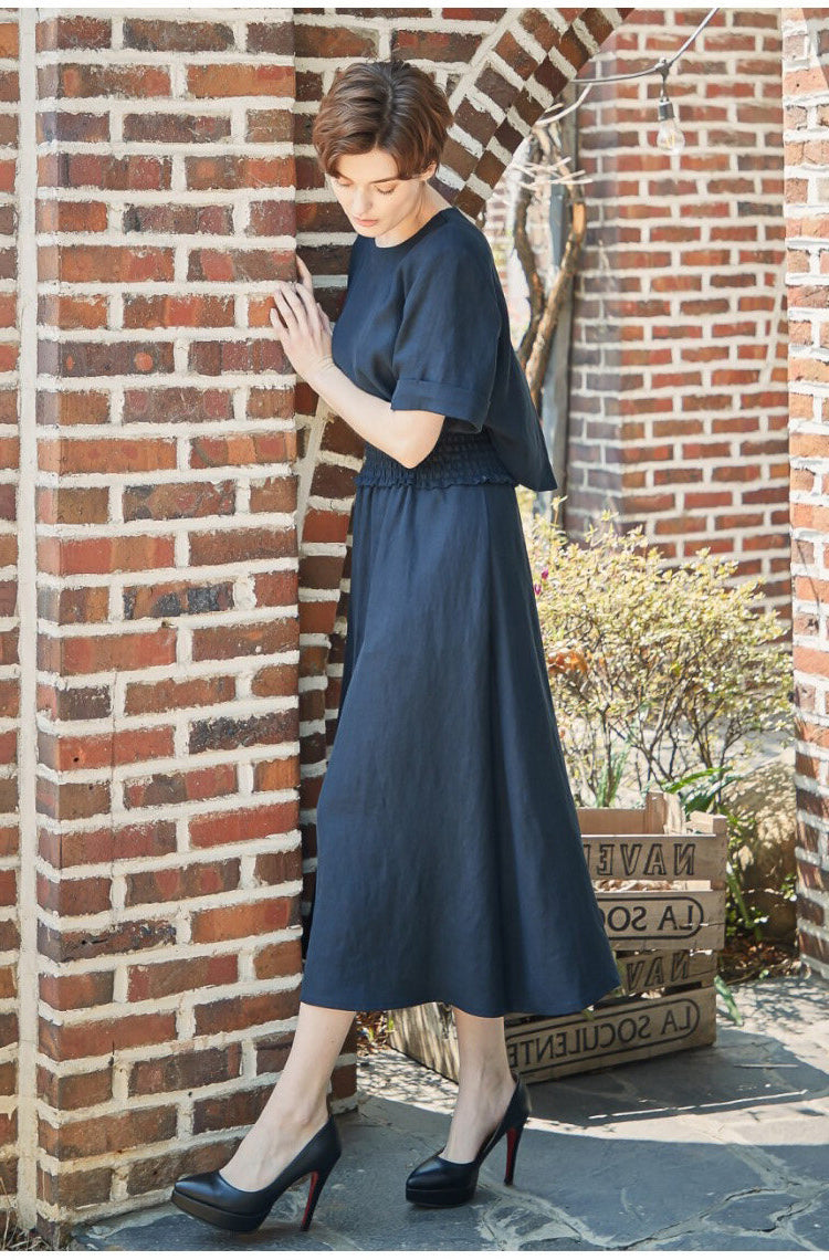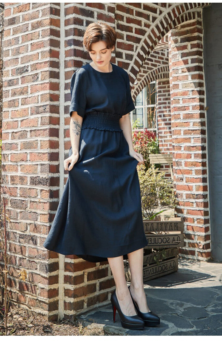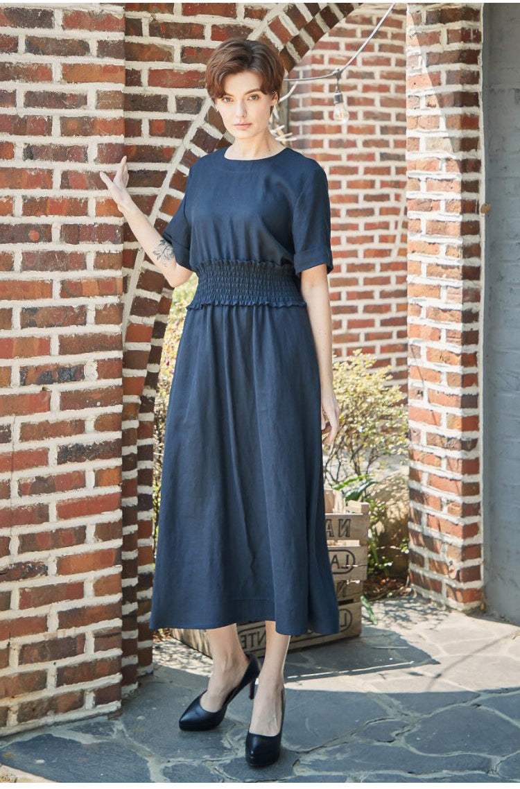 - Breathable linen fabric offers all-day comfort and natural elegance - Smocked waist with corset-style lace-up for a flattering fit - Soft puff sleeves add volume and a modern romantic touch - Midi length with fluid drape enhances graceful movement Back zipper closure ensures ease and a seamless silhouette