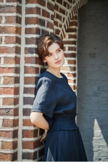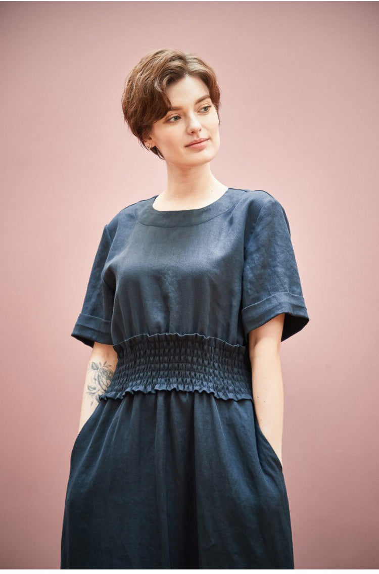 Sarah Luton presents this effortlessly elegant midi dress crafted from breathable linen, designed to blend comfort with sophistication. The dress features a relaxed silhouette enhanced by voluminous puff sleeves and a cinched smocked waist with lace-up detail, offering a flattering hourglass shape. A soft scoop neckline and concealed back zipper complete the look. Ideal for warm-weather days, brunches, or creative office settings, this dress brings natural texture and feminine charm to your wardrobe.