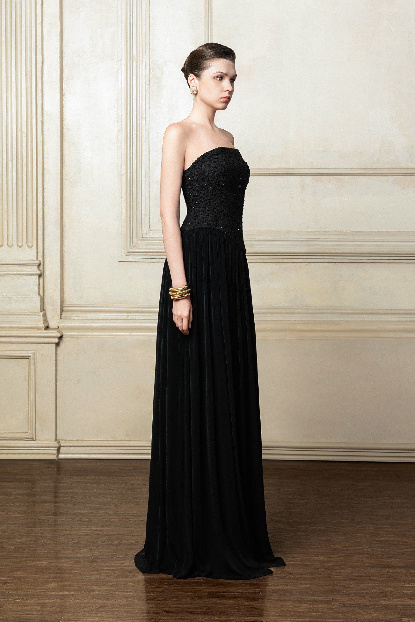 Laura Ren presents an exquisite strapless maxi dress that epitomizes evening elegance with a modern edge. The structured bodice is intricately embellished with tonal beading, offering subtle shimmer and textural contrast. A sharply contoured seam gives way to a fluid velvet skirt, softly pleated for graceful movement and full-length drama. Designed to flatter the natural silhouette, this gown makes a timeless statement for formal soirées, galas, or red carpet events. With its sophisticated lines and rich texture, this Laura Ren piece is a masterclass in refined glamour.