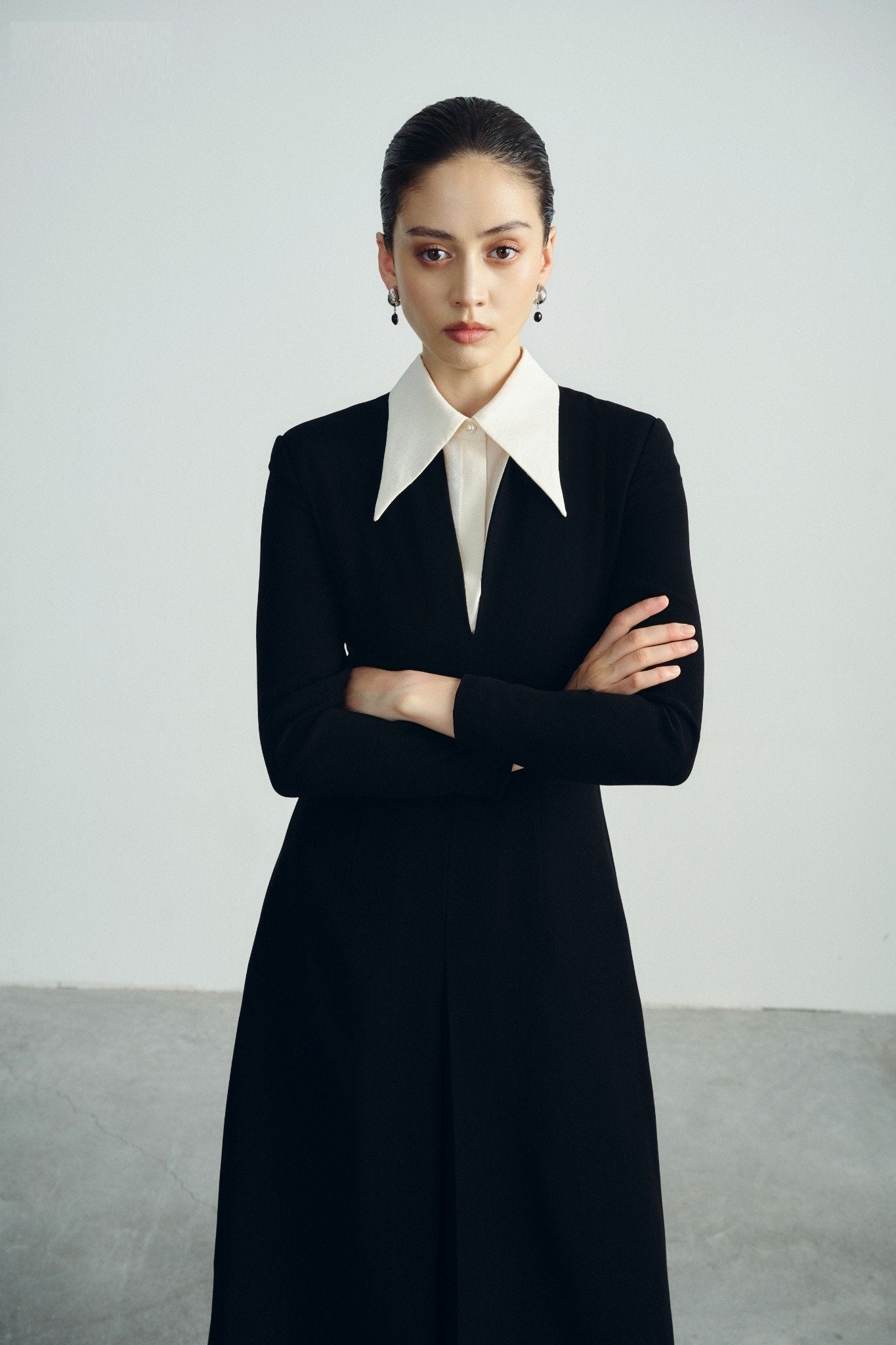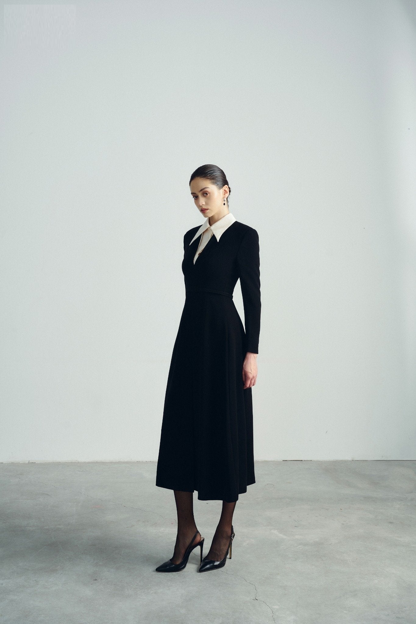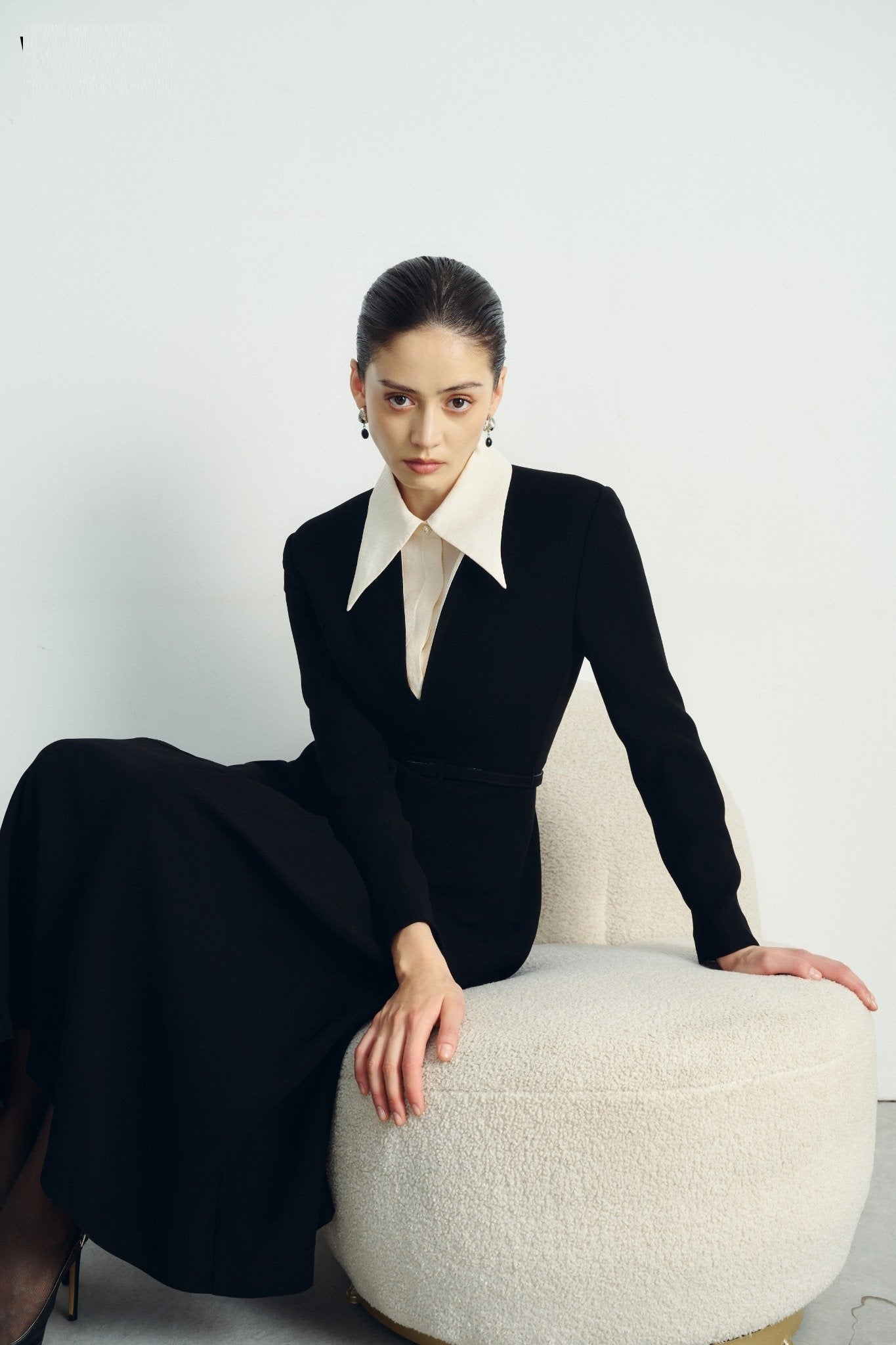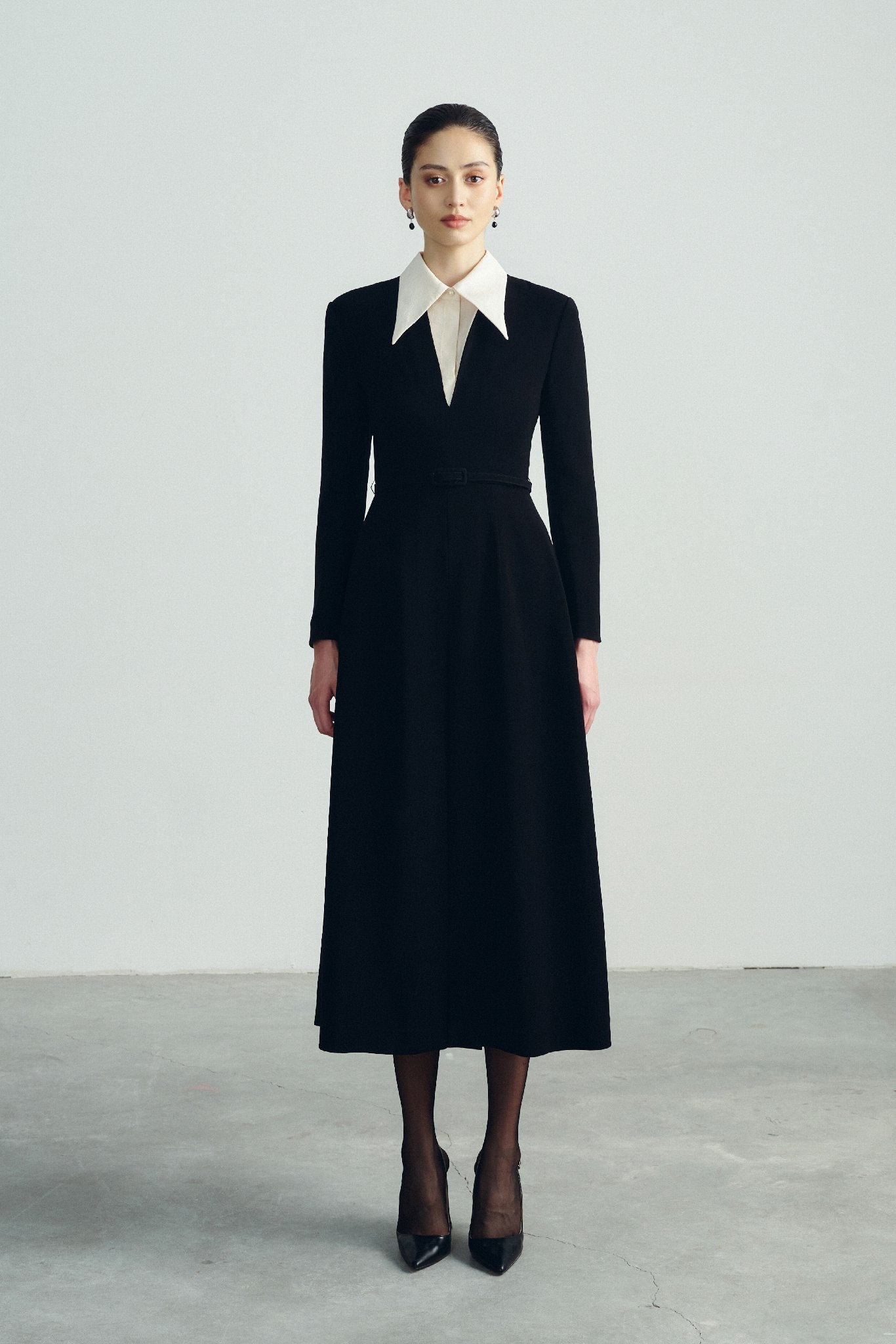 Crafted in smooth crepe with a sculpted silhouette, this midi dress from Laura Ren exudes classic refinement with a modern edge. A sharp contrast collar draws focus to the neckline, while the long sleeves and belted waistline deliver a tailored, cinched effect. Falling to a clean midi length, the dress balances strong lines with understated elegance, making it perfect for polished daywear or formal occasions. The Laura Ren aesthetic comes through in every detail—precise, poised, and timelessly sophisticated.