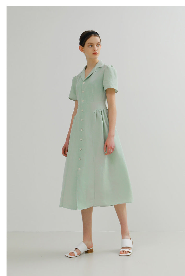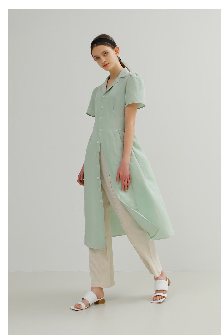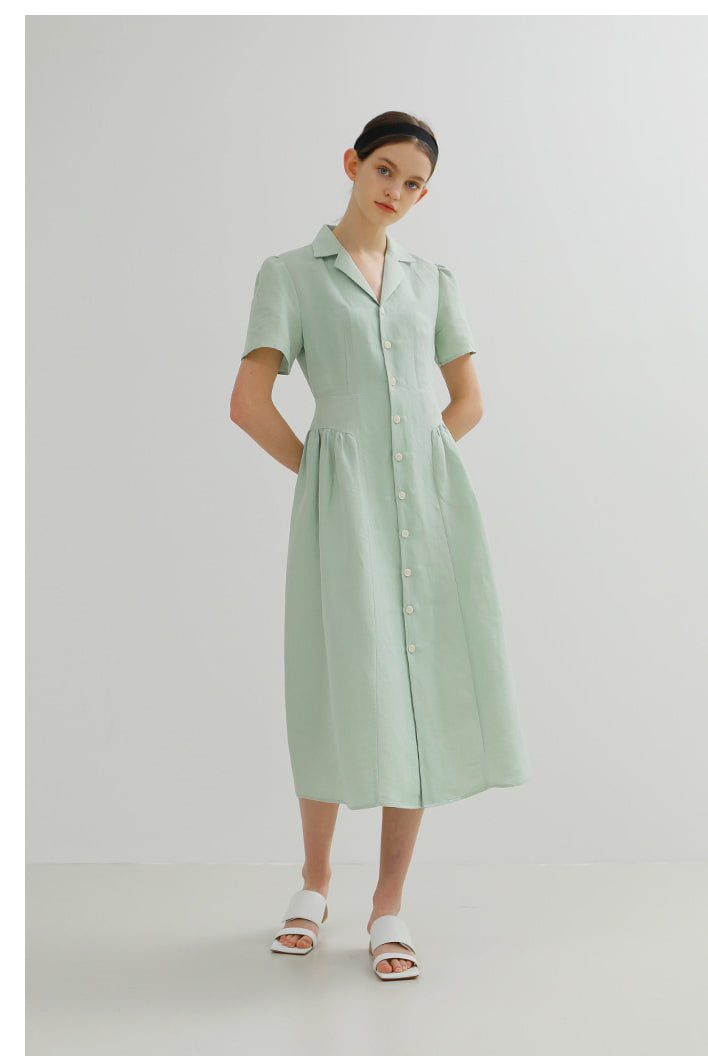 The Sarah Luton linen dress blends effortless style with refined tailoring, crafted from breathable linen for comfort and elegance. Featuring a notched collar, short sleeves, and a button-down front, this midi silhouette flatters the waist with a softly gathered skirt. Designed for timeless versatility, it's perfect for warm-weather days or layered looks. An ideal addition to any modern wardrobe.