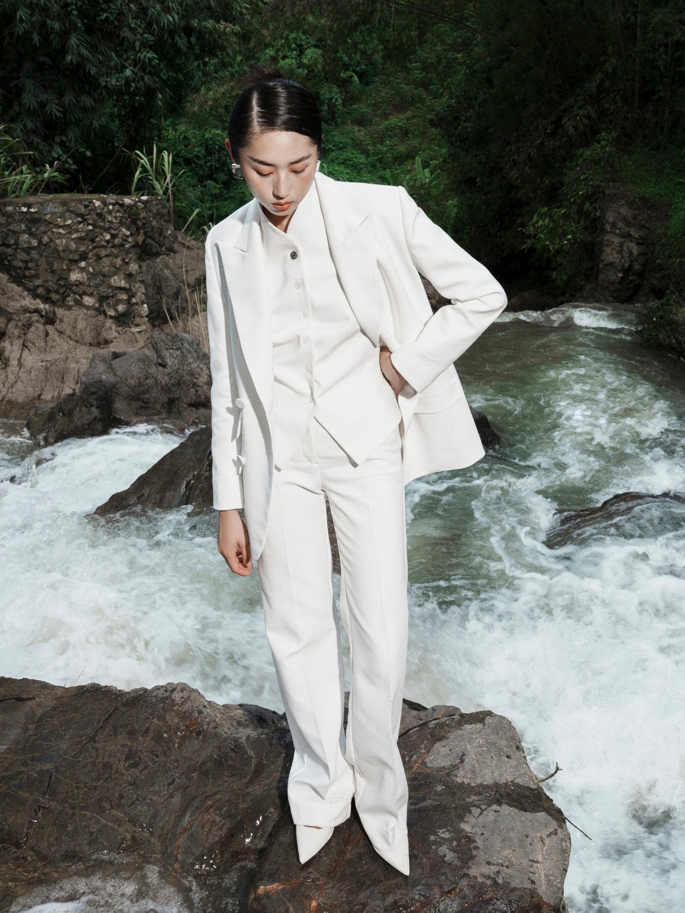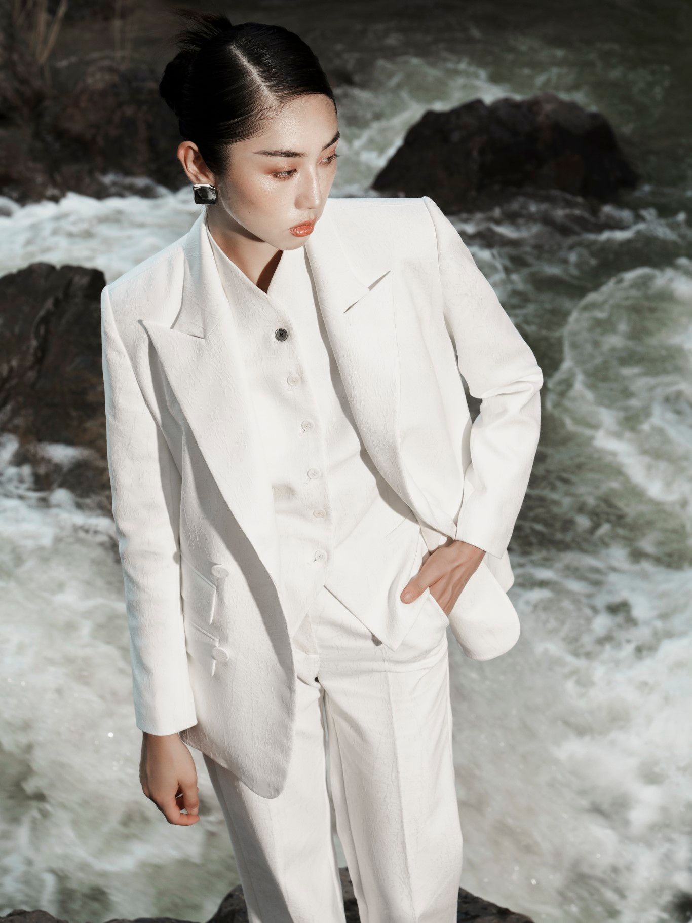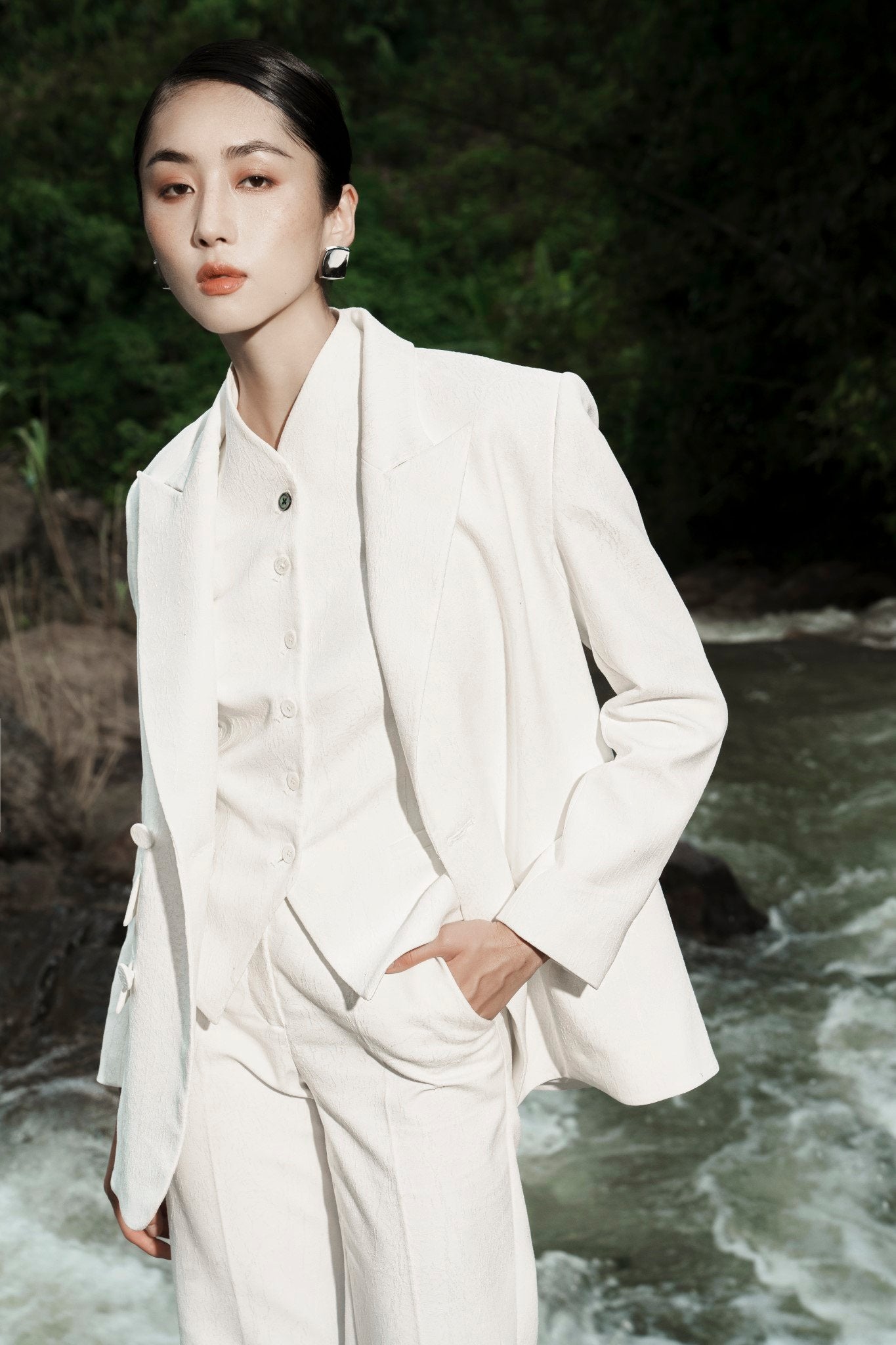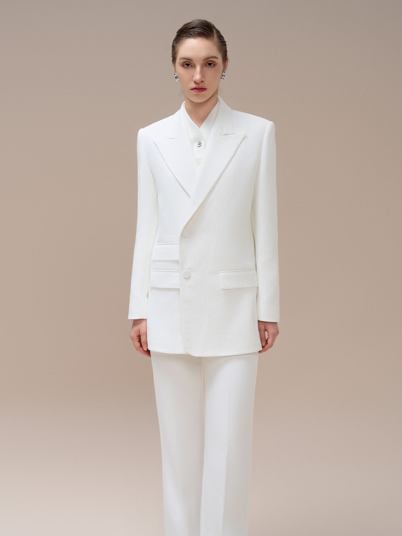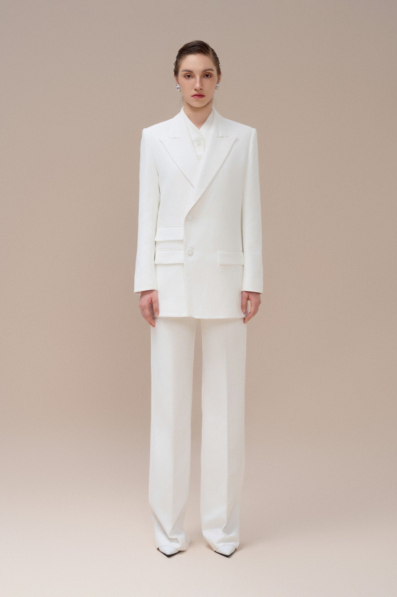 Refined and architectural, this double-breasted blazer from Laura Ren embodies sharp tailoring with timeless femininity. Designed with a structured longline silhouette, peak lapels, and flap pockets, it offers a commanding presence while remaining effortlessly elegant. Ideal for sophisticated suiting or styling over dresses, this piece adds a polished edge to any ensemble. Meticulously crafted to maintain its crisp structure, it exemplifies the modern minimalism of the Laura Ren aesthetic. A wardrobe essential for power dressing with quiet confidence.
