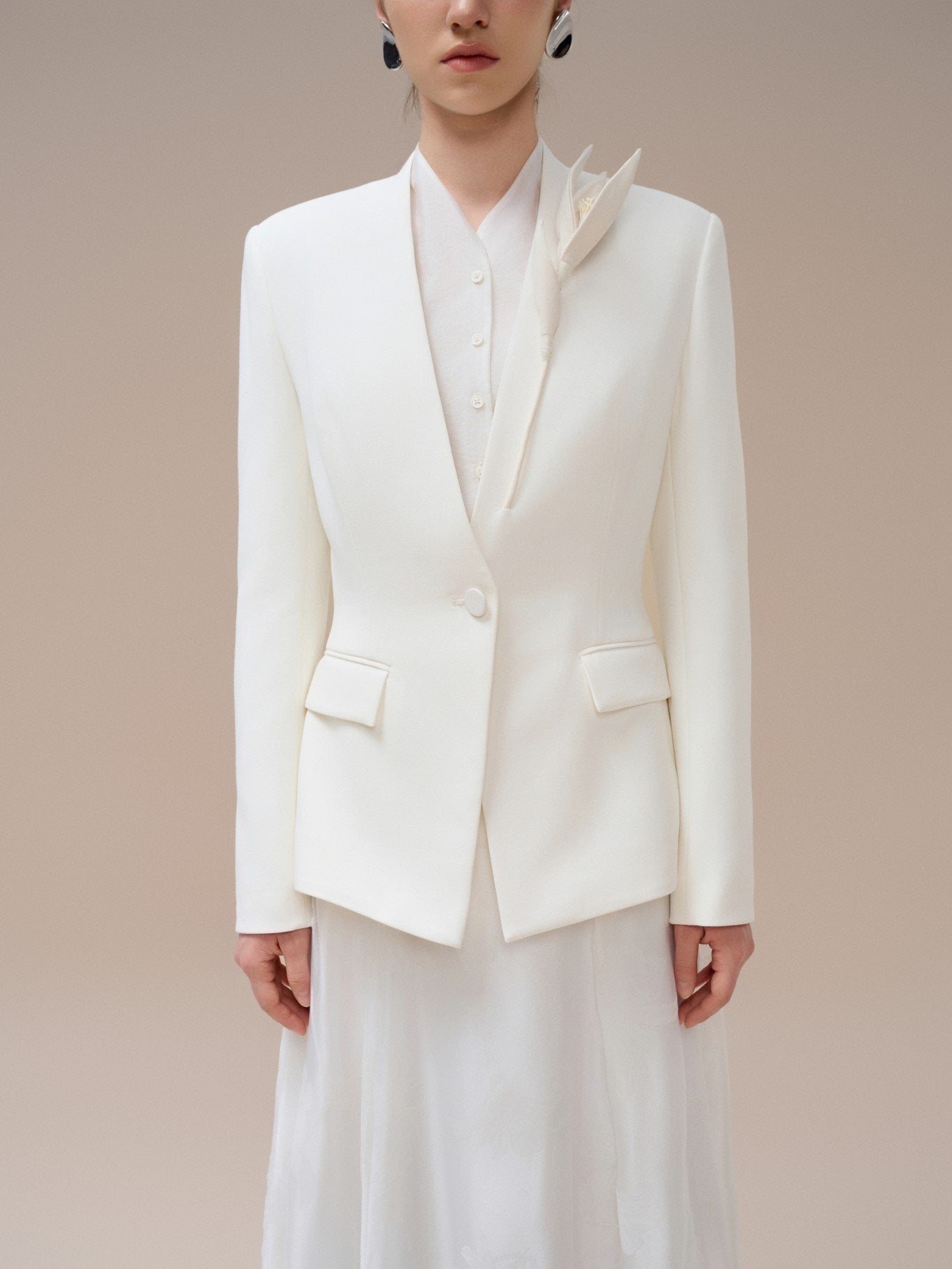 The Fiona Notched Blazer by Laura Ren is a refined tailoring masterpiece, crafted to evoke timeless elegance through meticulous detail and sculptural precision. Designed with a sharply structured notched lapel, elongated hemline, and figure-defining waist, this blazer elevates the art of modern suiting. Flap pockets and covered buttons underscore its clean minimalism, while a matching detachable flower pin adds a subtle couture accent. Fully lined for comfort and structure, the Fiona blazer is ideal for both occasion dressing and high-formality events. Pair with Laura Ren’s satin skirt or tailored pants for a seamless monochrome statement.
