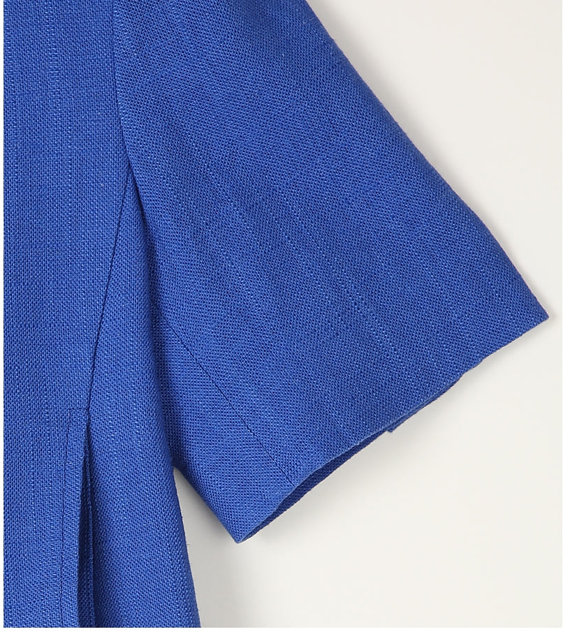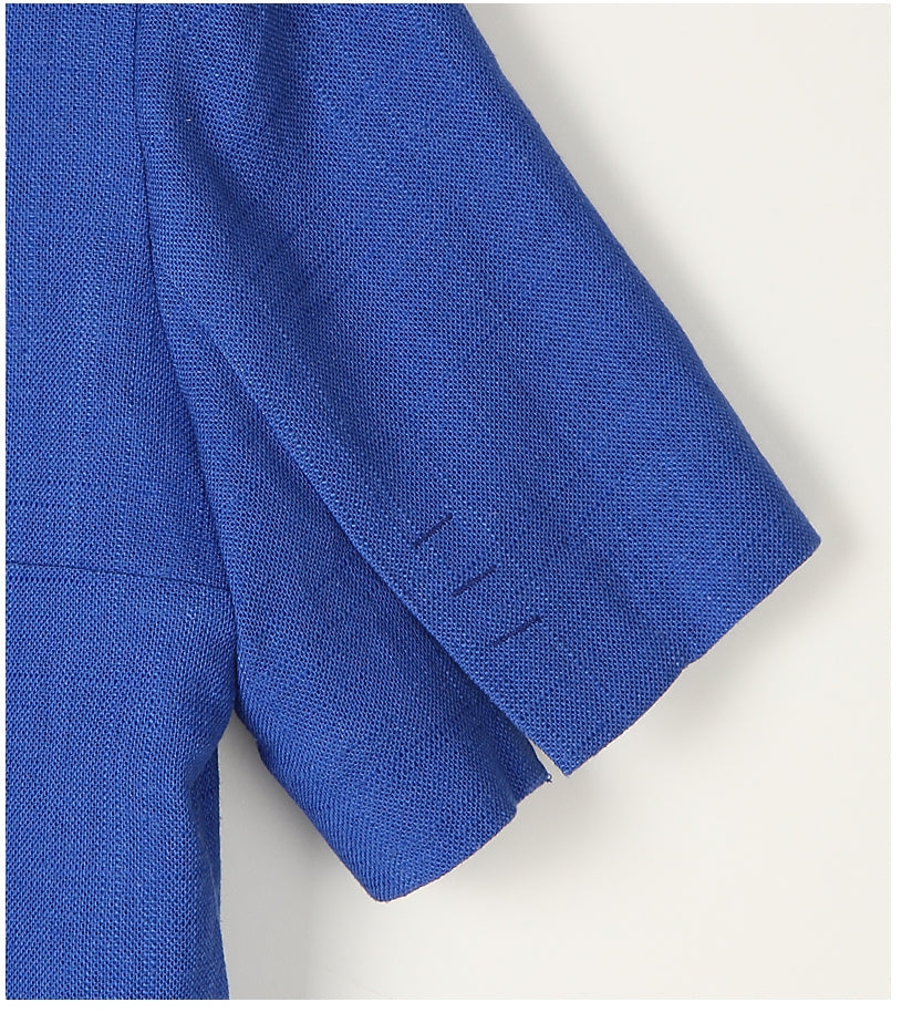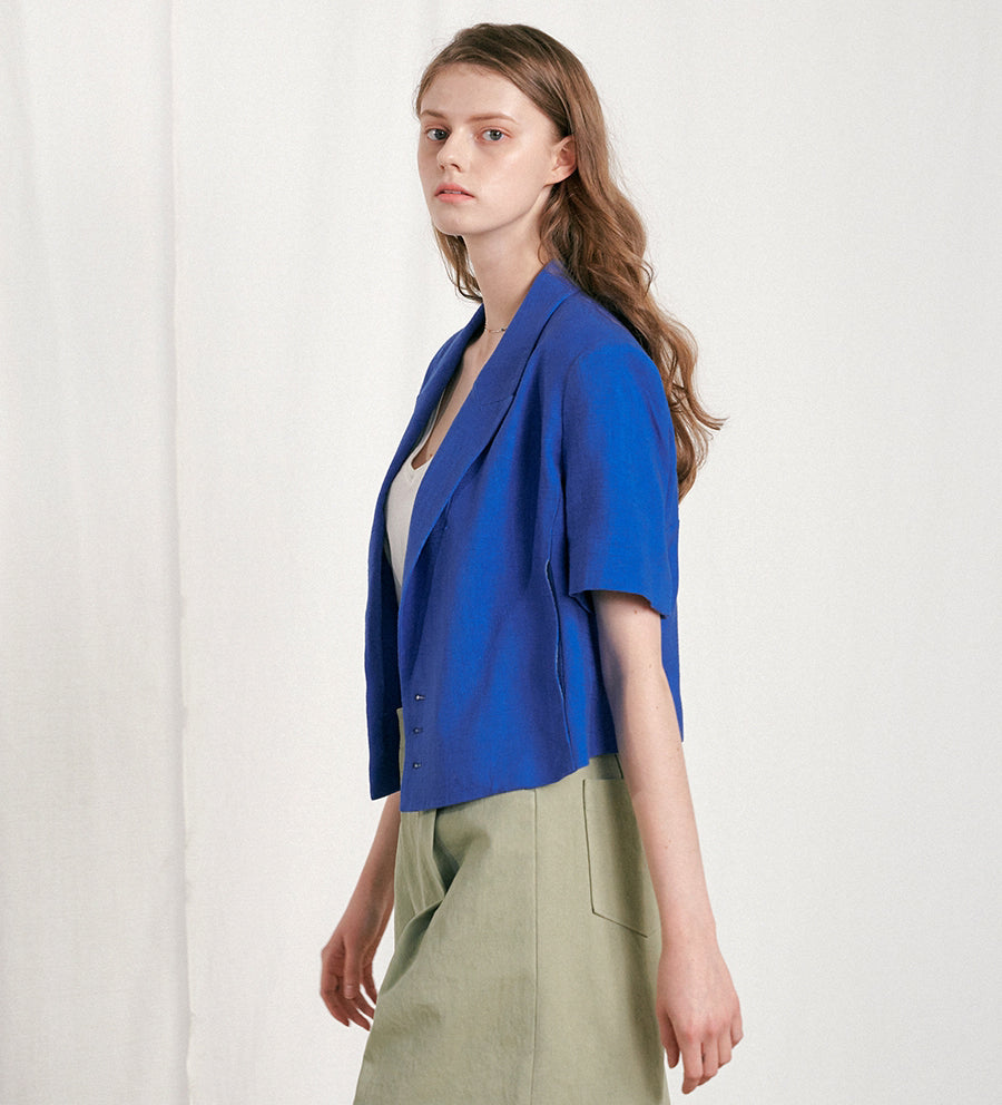 Sarah Luton introduces a tailored linen blazer that captures contemporary elegance with ease. Crafted from lightweight, breathable linen, this structured piece features a sharp lapel collar, three-button detailing, and a cropped silhouette perfect for warm-weather layering. The short sleeves and clean lines enhance its modern minimalist appeal, while the neutral versatility makes it ideal for pairing with everything from wide-leg trousers to tailored shorts. Designed for the refined woman who values comfort without compromising sophistication.