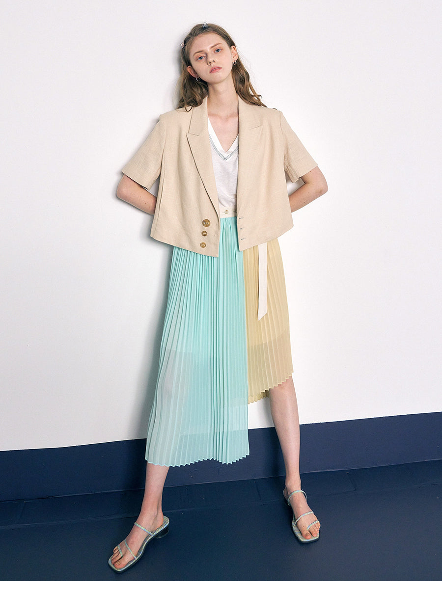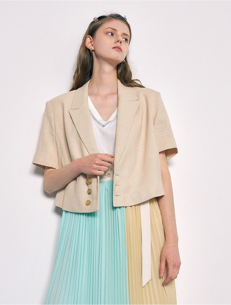 Sarah Luton introduces a tailored linen blazer that captures contemporary elegance with ease. Crafted from lightweight, breathable linen, this structured piece features a sharp lapel collar, three-button detailing, and a cropped silhouette perfect for warm-weather layering. The short sleeves and clean lines enhance its modern minimalist appeal, while the neutral versatility makes it ideal for pairing with everything from wide-leg trousers to tailored shorts. Designed for the refined woman who values comfort without compromising sophistication.