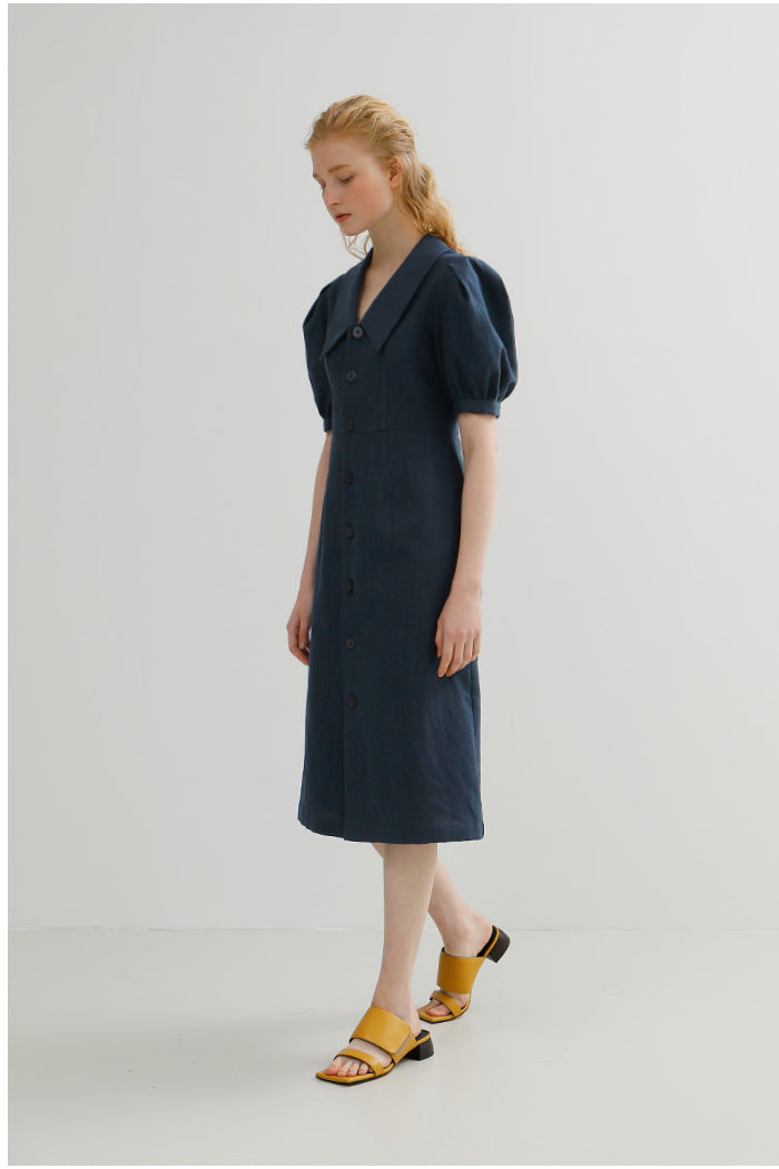 The Sarah Luton linen midi dress is a refined blend of contemporary tailoring and vintage charm. Crafted from breathable linen, it features statement puff sleeves, a wide notched collar, and a row of tonal buttons for a structured silhouette. The tailored waist flatters the figure, while the midi length brings elegant versatility for both everyday wear and polished occasions. A timeless essential for modern wardrobes.