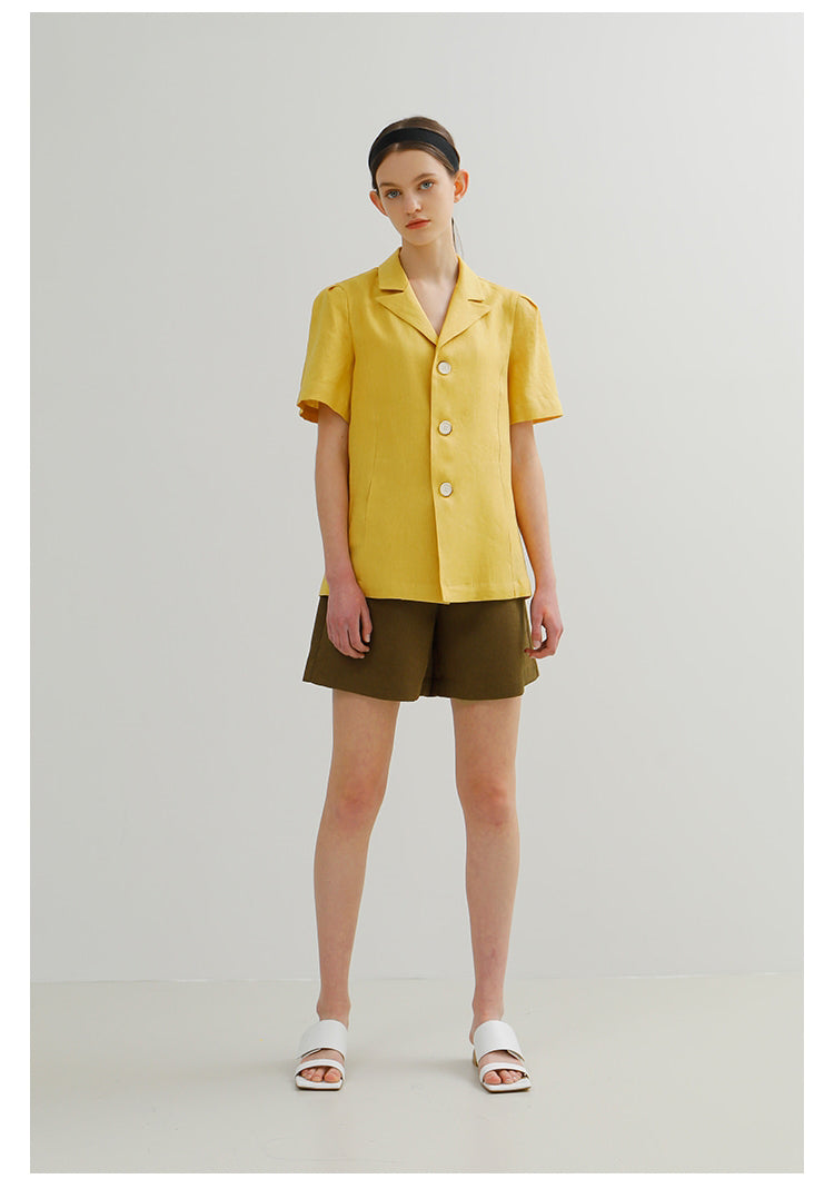 The Sarah Luton linen blouse is a timeless staple crafted from breathable linen for refined, warm-weather dressing. Designed with a structured notched collar and short sleeves, this blouse features a minimalist front with tonal buttons and flattering vertical seams. Its clean lines and lightweight texture offer versatile elegance, ideal for elevating both casual and tailored looks.
