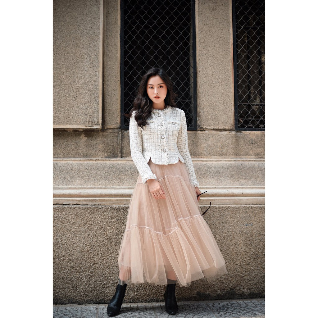 A refined essential for the modern wardrobe, this tailored silk tweed blazer by Sarah Luton exudes timeless elegance and sophistication. Designed with a structured silhouette and crafted from textured silk-blend tweed, it features front flap pockets, a sharp collar, and ornate button details for a polished finish. The cropped length pairs effortlessly with high-waisted skirts or trousers, making it ideal for elevated daywear or formal occasions. Sarah Luton blends Parisian-inspired charm with everyday wearability in this statement layering piece.