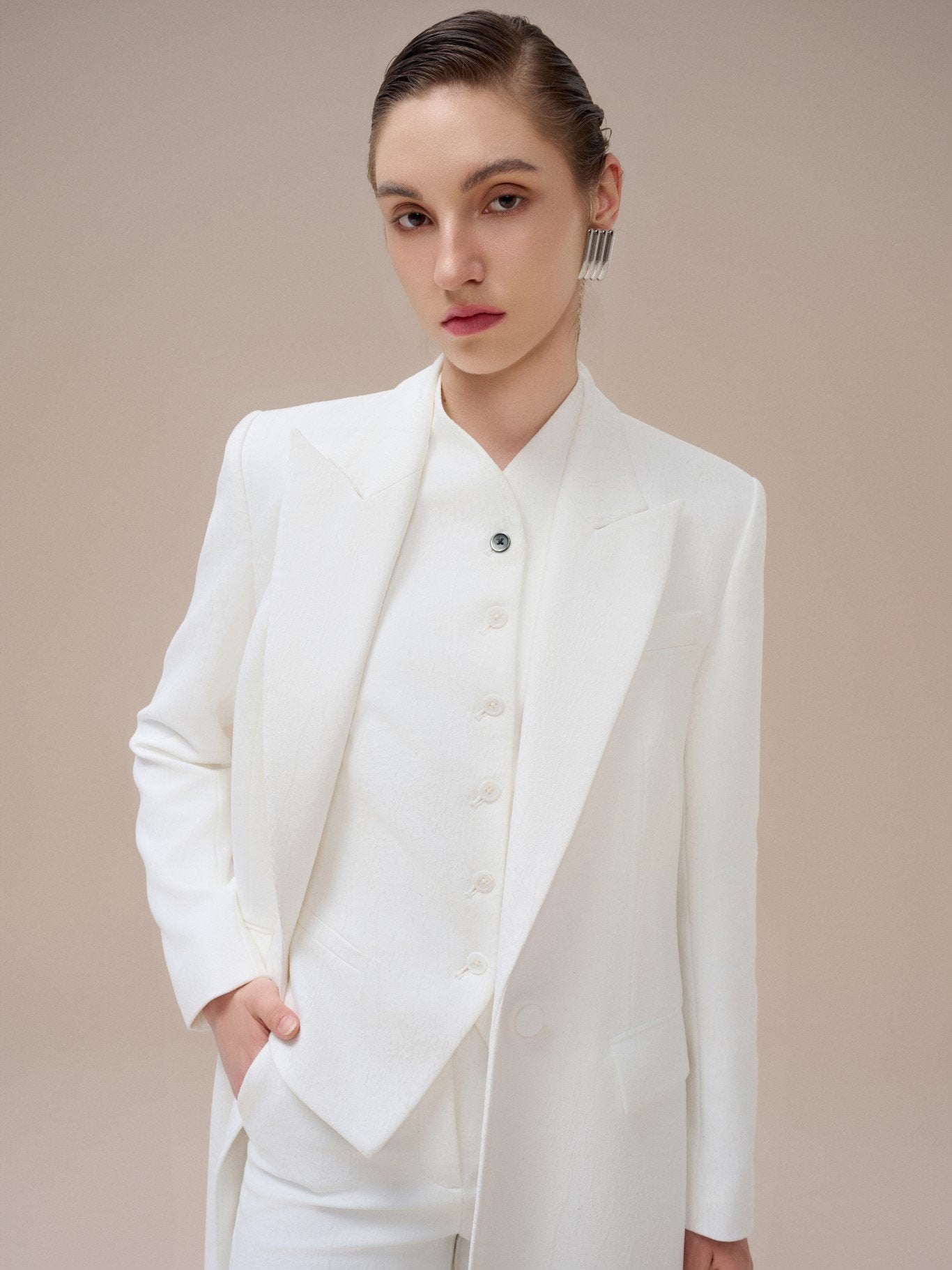 This tailored jacquard vest from Laura Ren is a refined essential designed for timeless sophistication. Featuring a sleek, elongated cut with a button-down front and sharp shoulders, the vest balances modern elegance with classic tailoring. Crafted from a subtly textured jacquard fabric, it adds depth and richness to minimalist ensembles. Wear it layered under matching outerwear or styled alone for a statement look. The clean lines and structured silhouette reflect Laura Ren’s signature approach to contemporary power dressing.