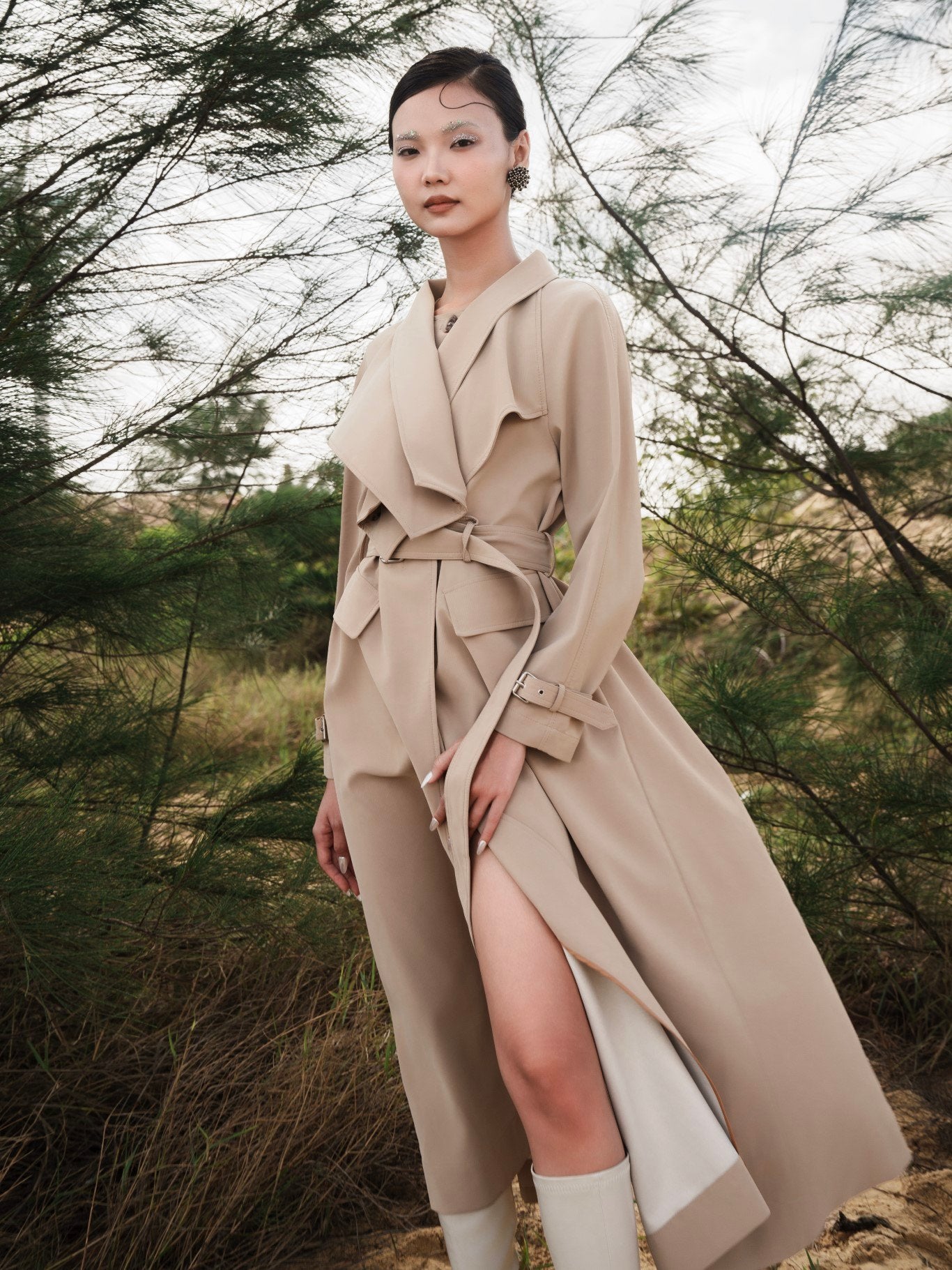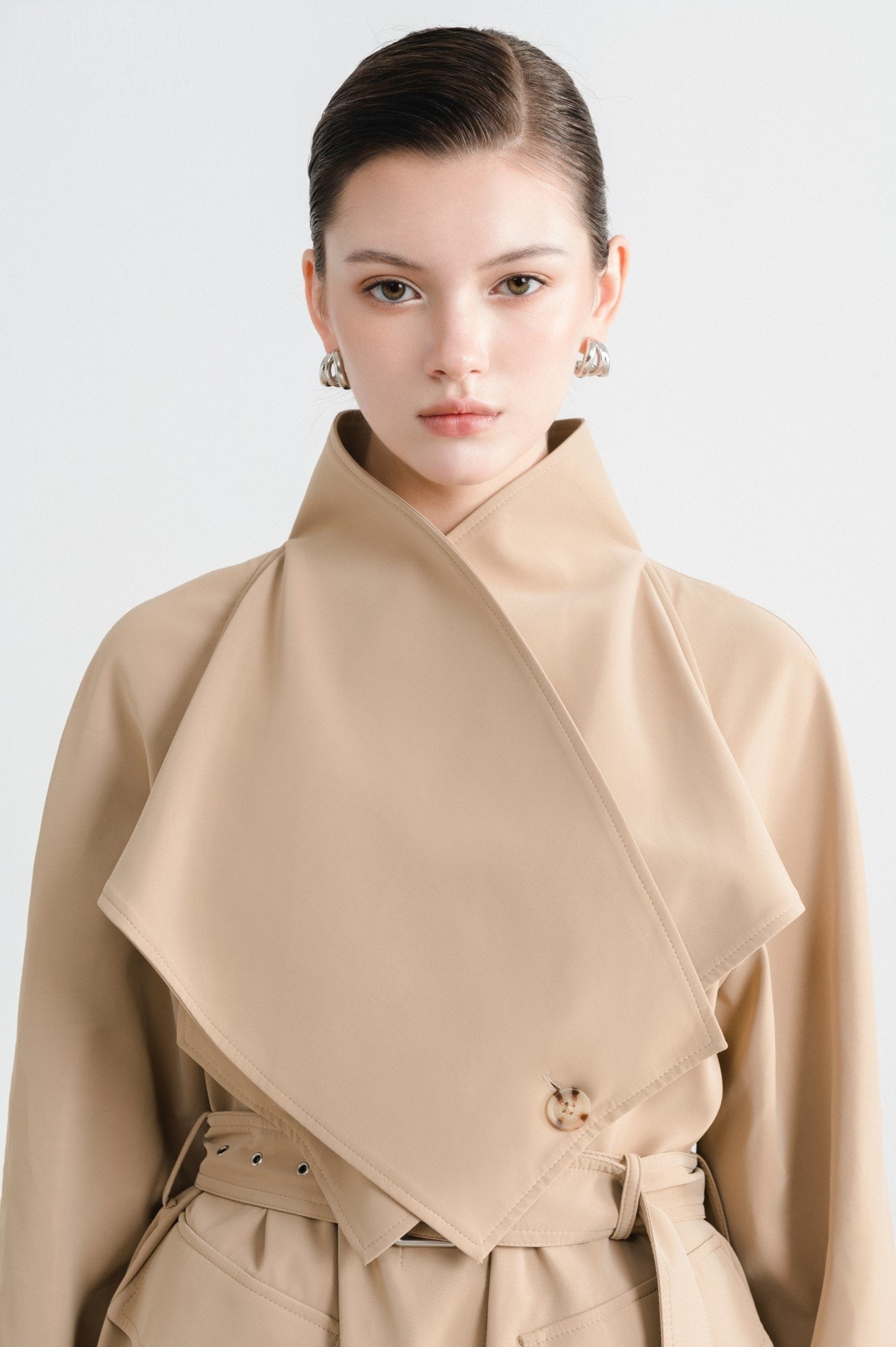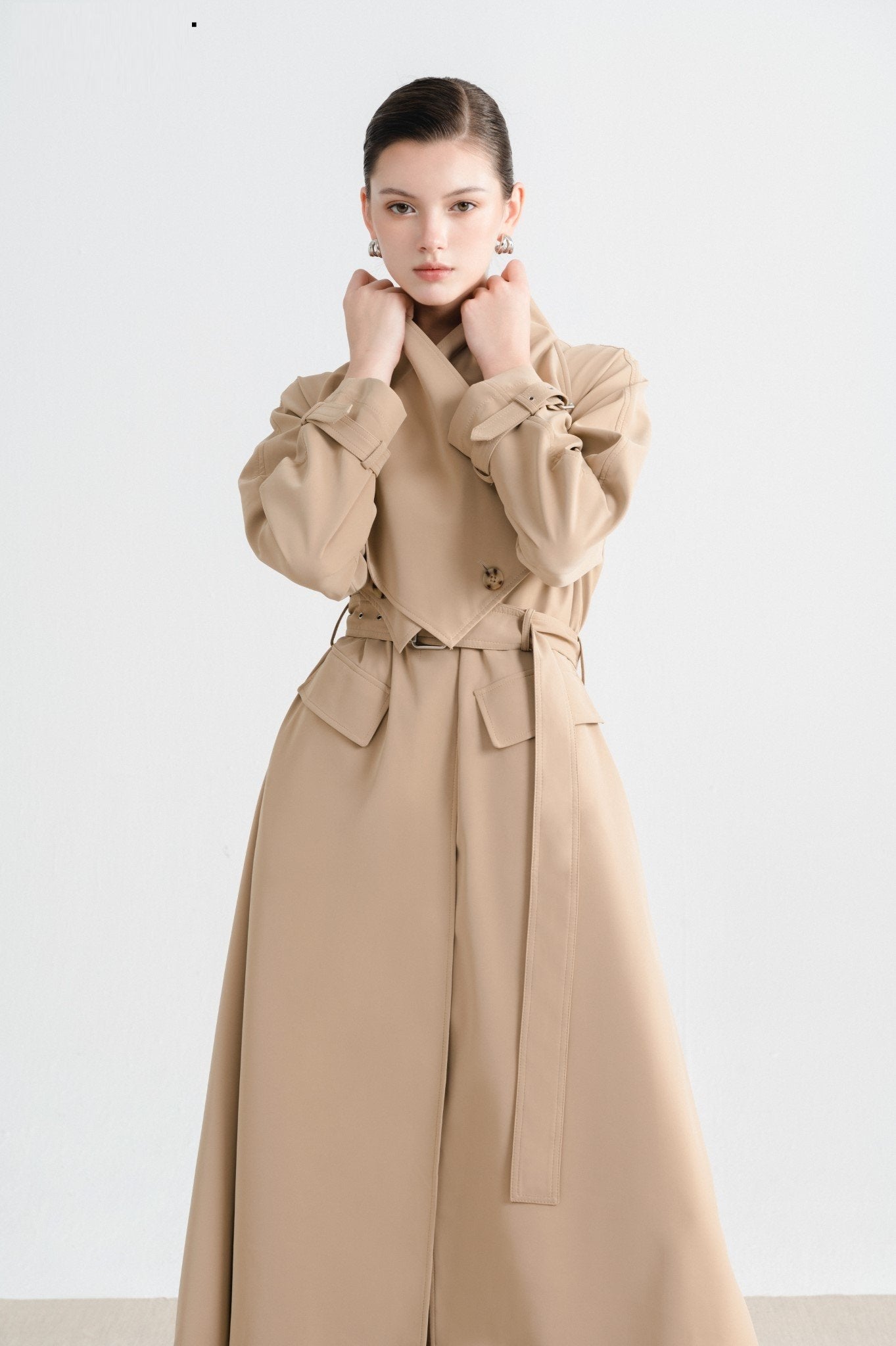 Laura Ren presents a refined interpretation of timeless outerwear with this tailored wool blend trench coat. Designed with exaggerated lapels and a sculptural silhouette, the coat features a sharp belted waist, adjustable sleeve cuffs, and flap front pockets for classic trench functionality. The longline cut and structured fit offer elegant coverage while the premium wool blend ensures both warmth and softness. A concealed front placket and tonal belt polish off the piece with minimalist precision. Sophisticated and versatile, this coat elevates everyday dressing with Laura Ren’s modern tailoring.
