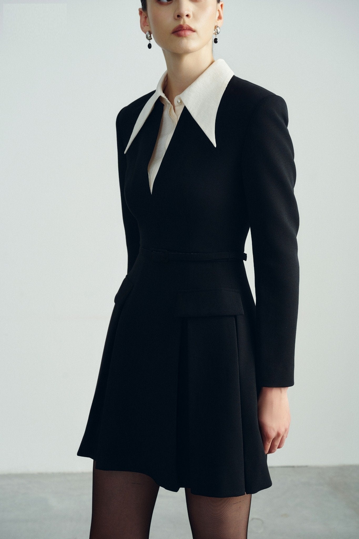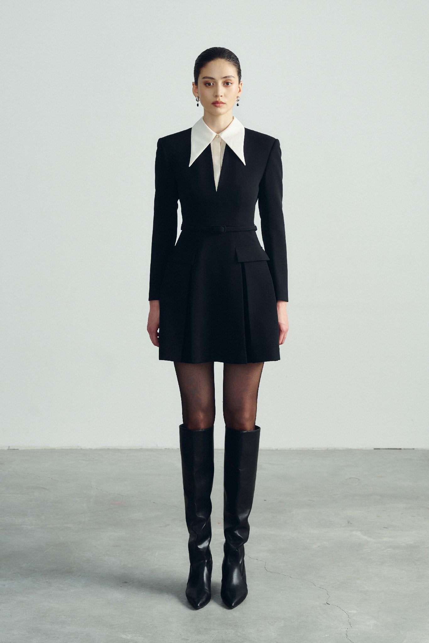 The Laura Ren tailored mini dress offers a bold reinterpretation of classic formalwear, blending structured elegance with modern sophistication. Crafted from refined wool suiting fabric, this piece features a sharply tailored silhouette with strong shoulders and a waist-defining belt. The exaggerated pointed collar in crisp contrast fabric lends architectural drama, while the pleated A-line skirt brings movement and lightness. Designed for standout occasions, this mini dress channels an air of composed authority—perfect for events where fashion-forward finesse meets tailored formality. Pair with knee-high boots or heels to complete a polished, editorial-inspired look.