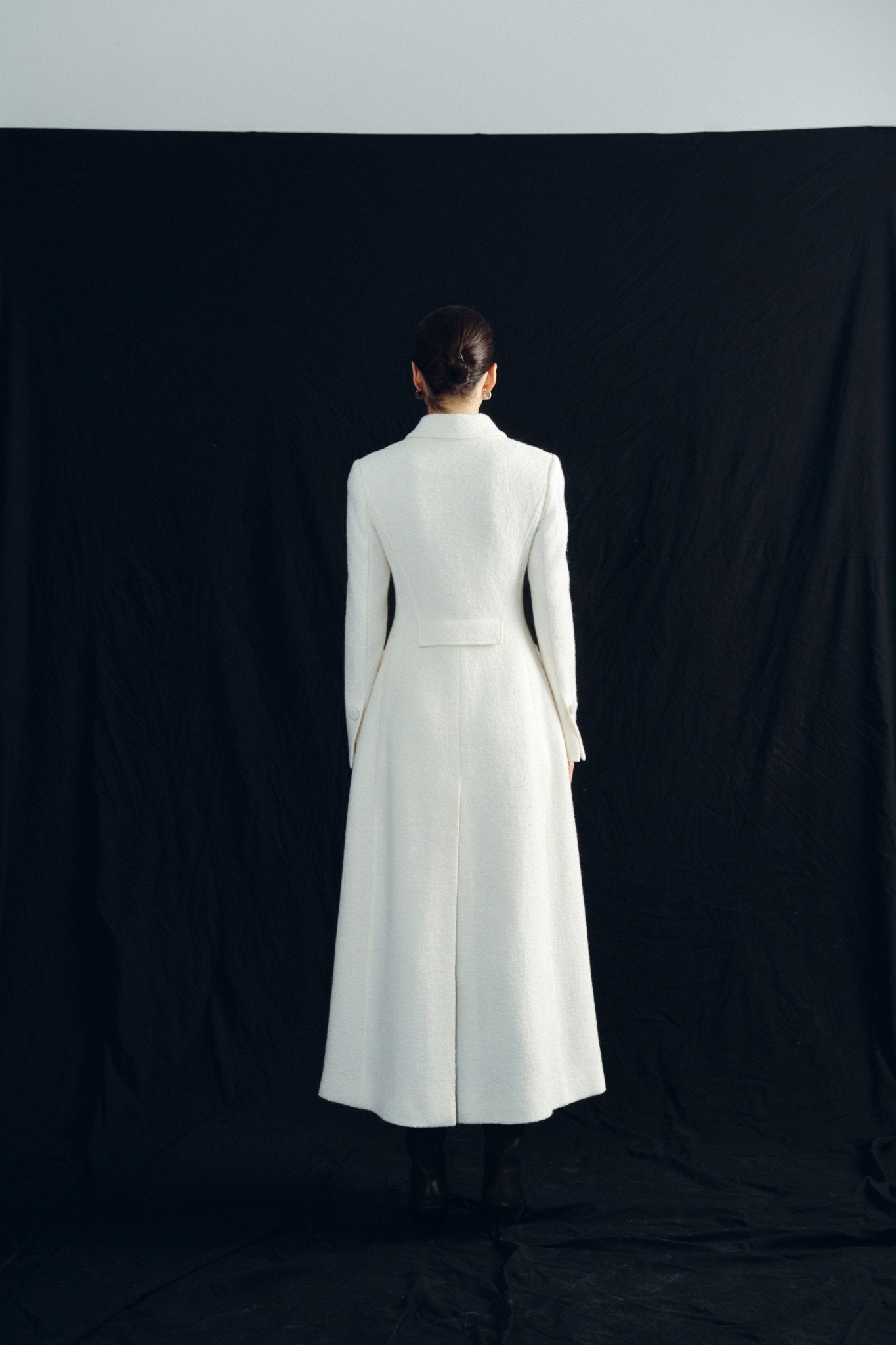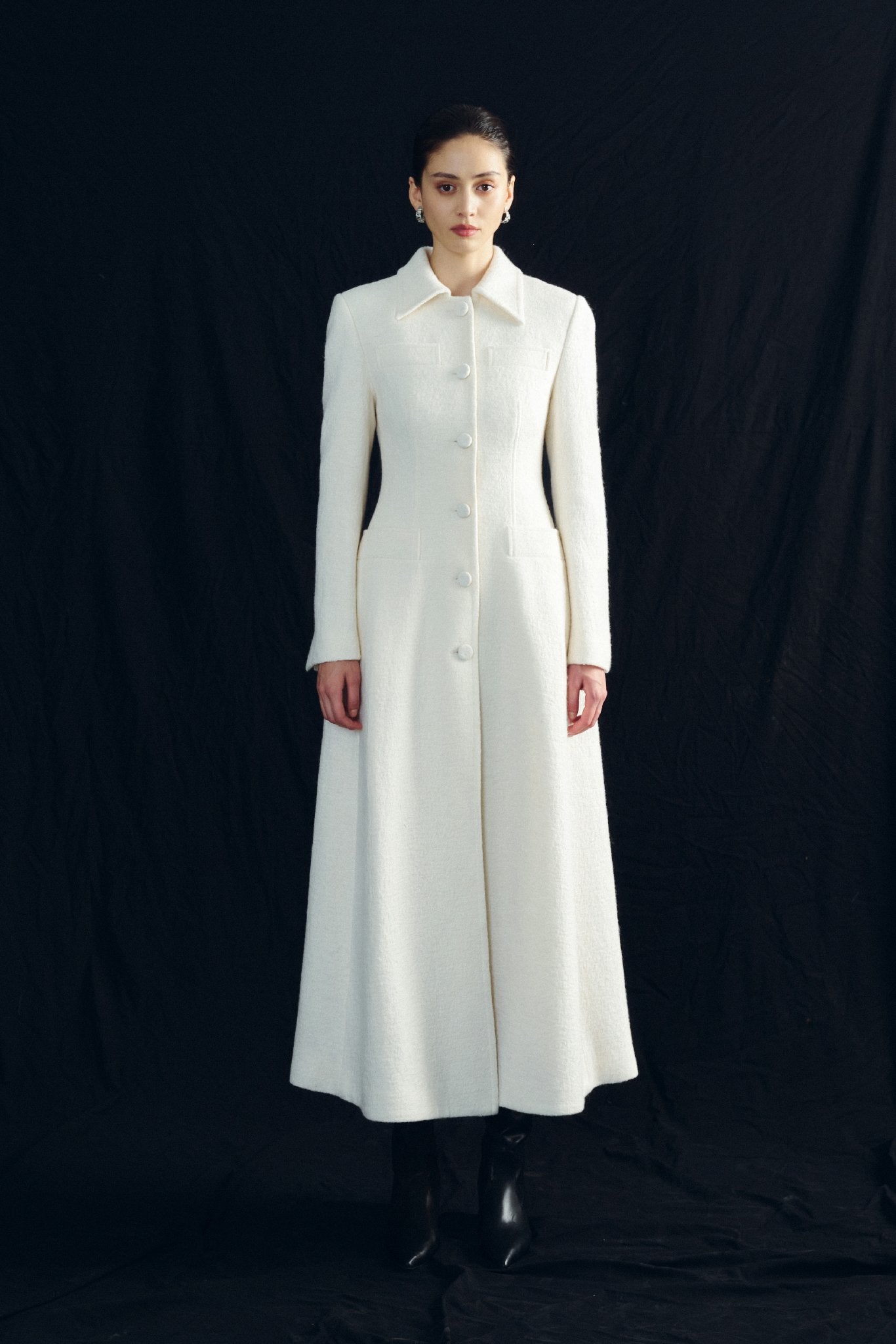 Elevate your outerwear collection with this structured double-breasted long coat, crafted from a premium textured wool blend for both warmth and elegance. The elongated silhouette creates a statuesque effect, while precision tailoring and a softly nipped-in waist flatter the figure. Thoughtful details such as front flap pockets, back vent, and refined lapels blend function with timeless sophistication. Ideal for transitioning between seasons or styling over both casual and formal ensembles. A signature piece from Laura Ren, this coat embodies elevated minimalism and polished presence.