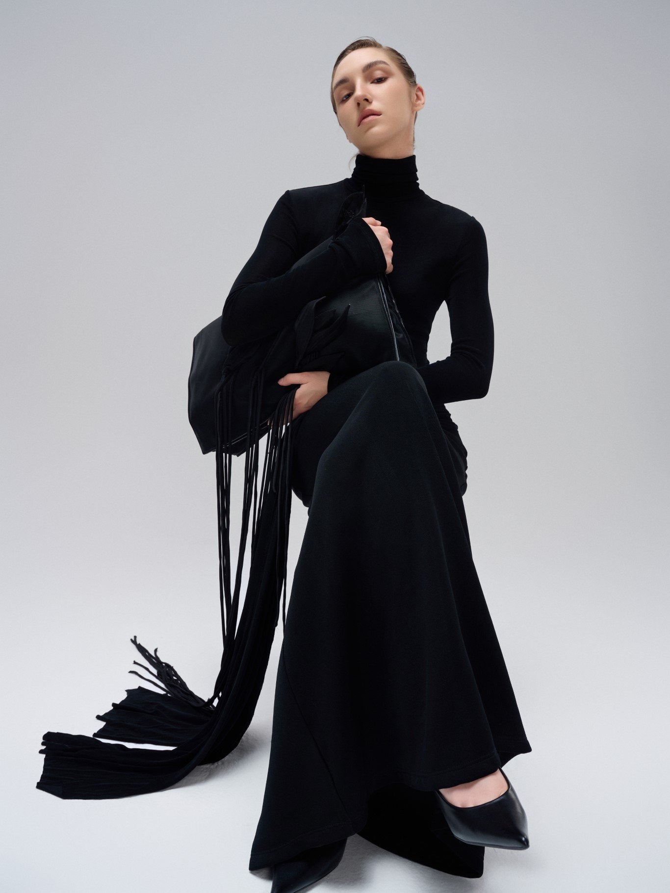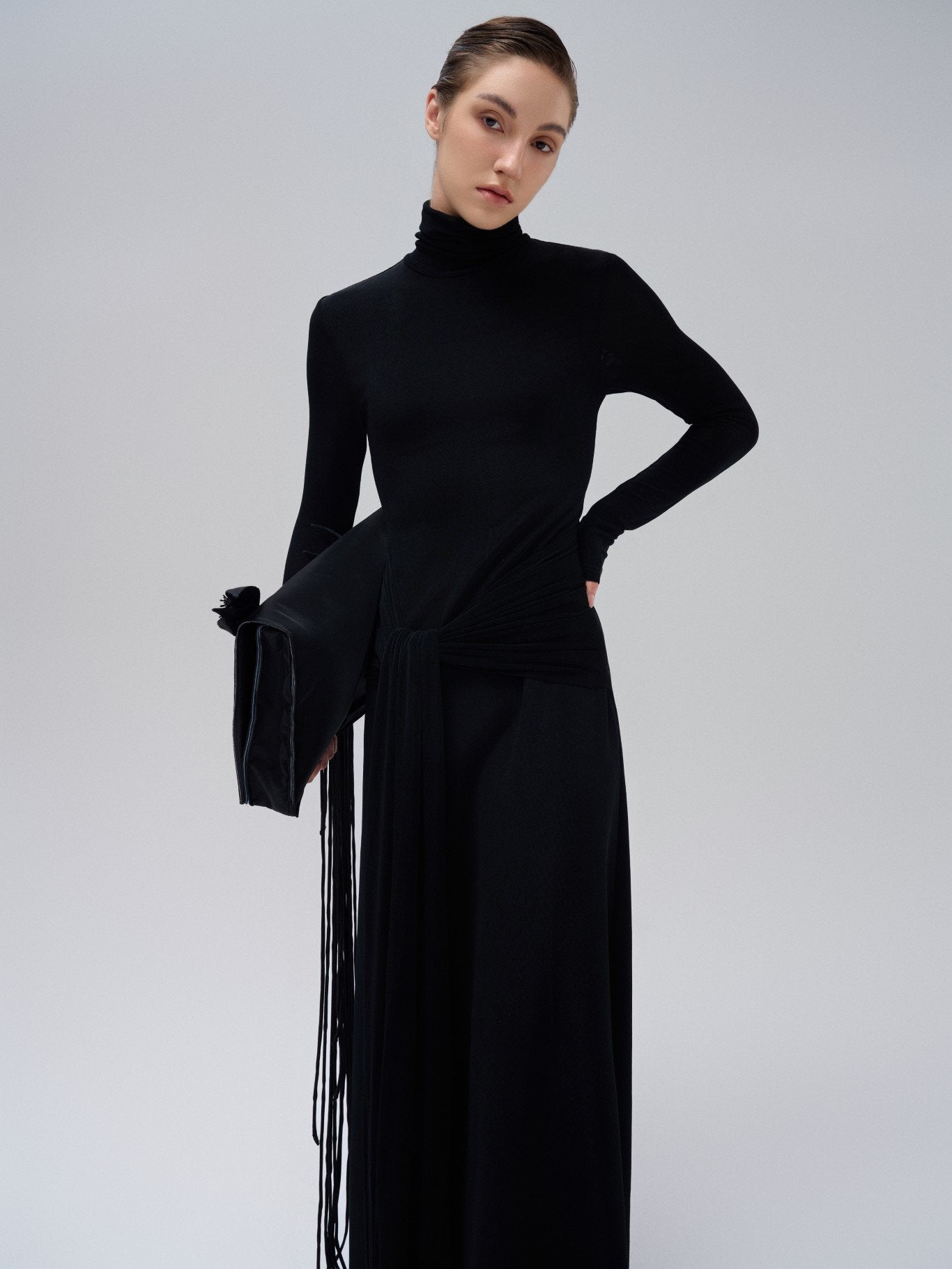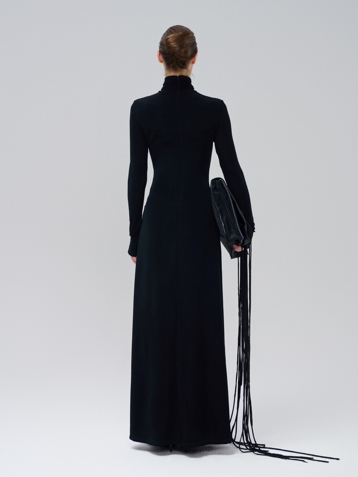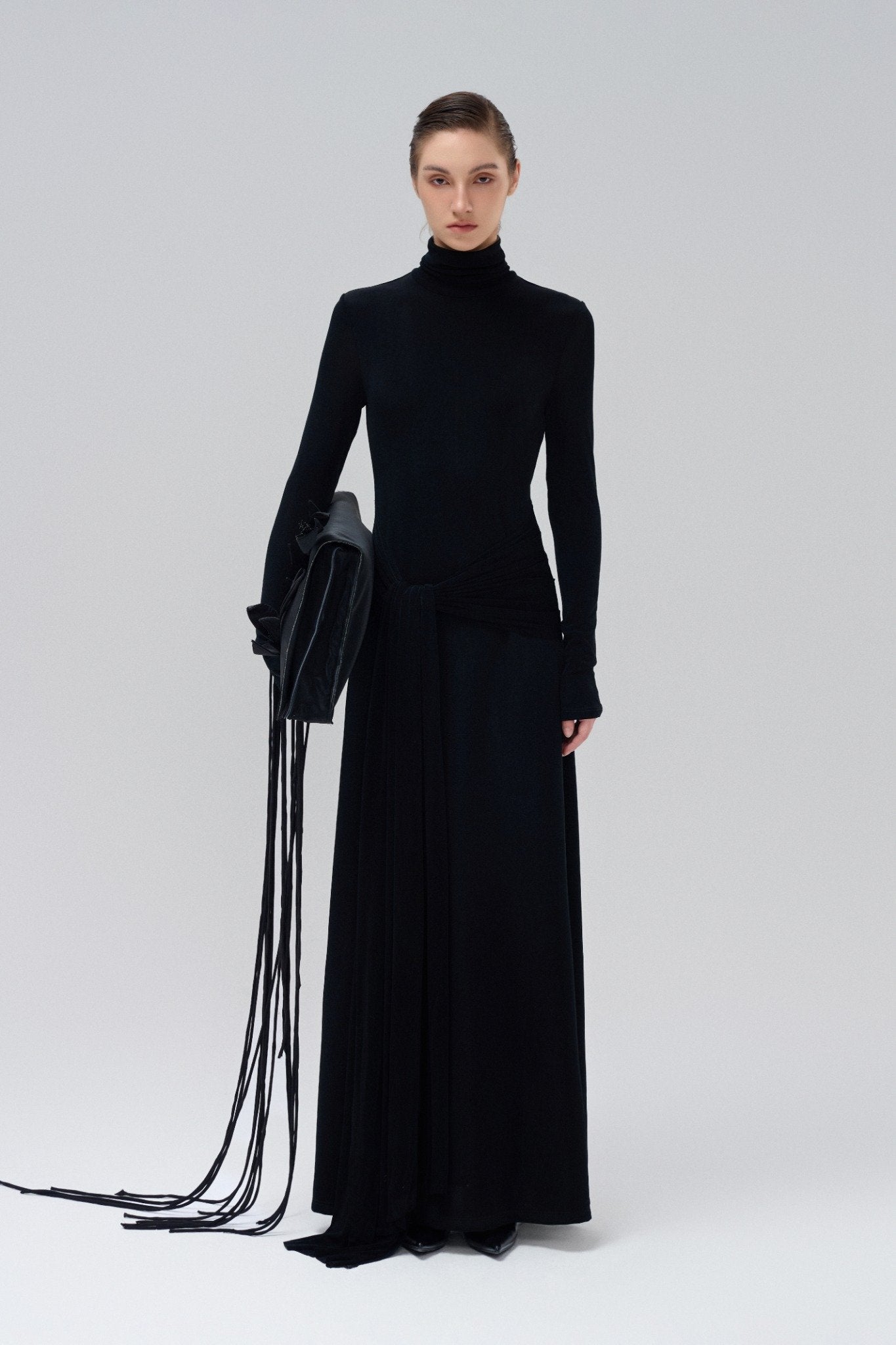 The Meryl Kint Dress from Laura Ren is a masterclass in quiet drama and sculptural elegance. Designed with a sleek turtleneck and long sleeves, this full-length dress hugs the body with a clean, elongated silhouette. A knotted drape detail at the hip adds fluid dimension while subtly defining the waist. Minimalist yet impactful, the design pairs sophistication with comfort, making it ideal for evening affairs or gallery-style settings. Laura Ren’s signature touch ensures this piece balances modern restraint with powerful presence.