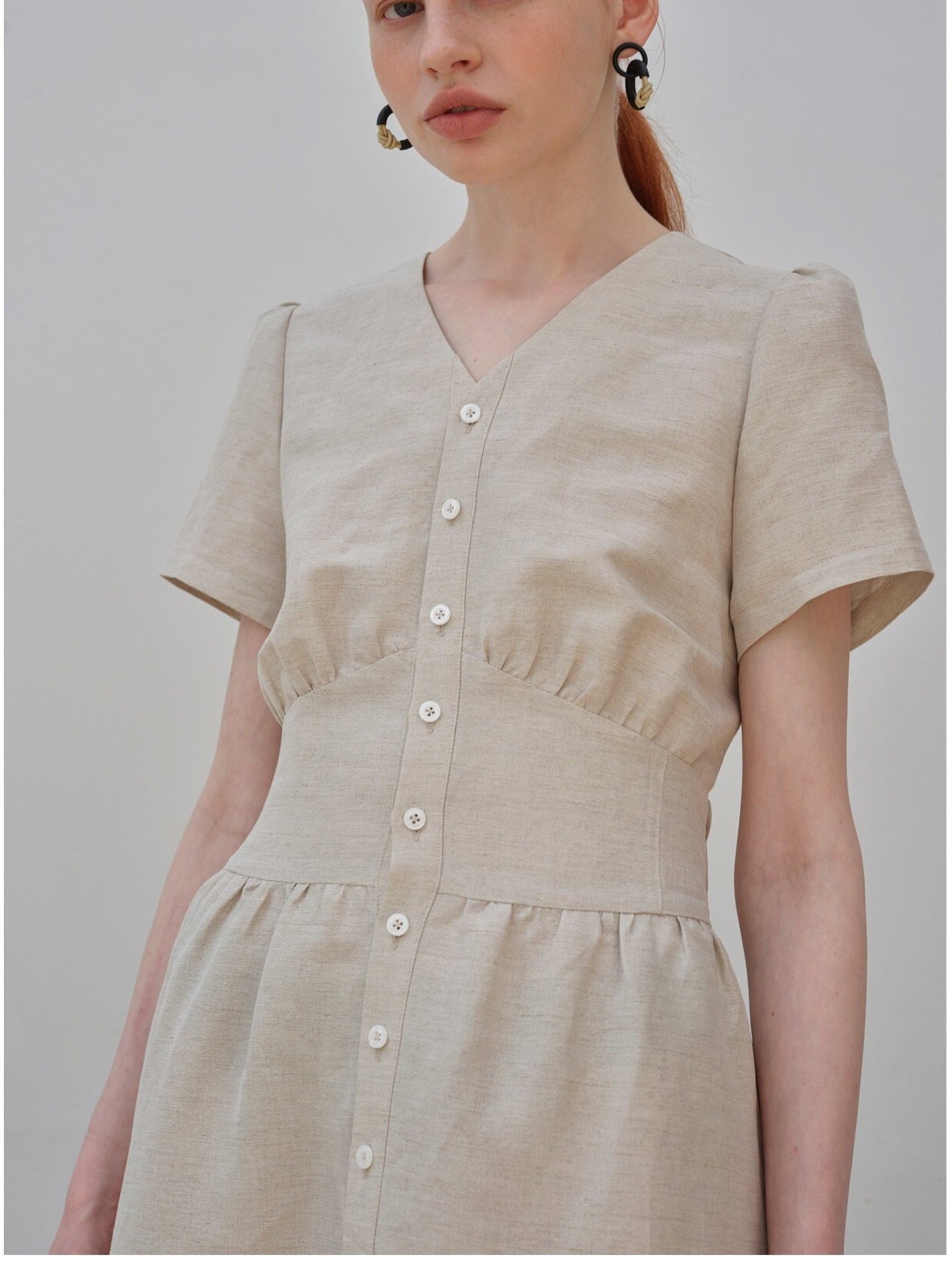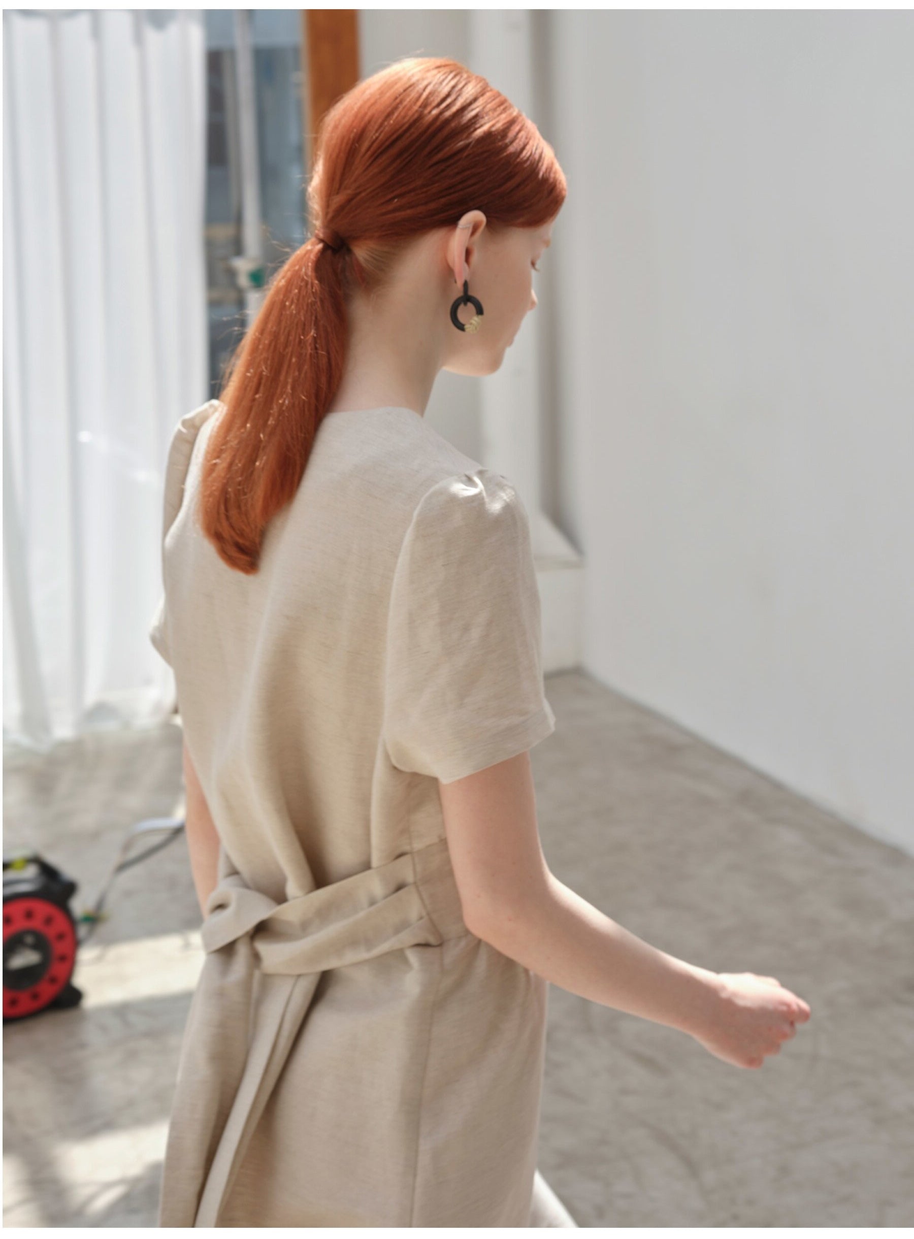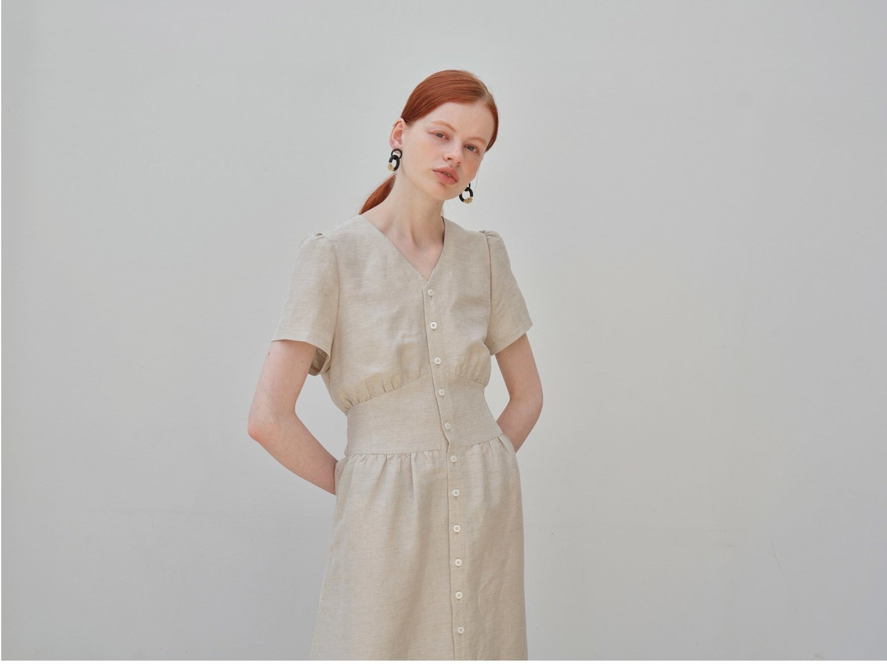 Sarah Luton presents this refined linen midi dress, designed to combine minimalist elegance with architectural structure. Crafted from breathable, high-quality linen, the dress features gently puffed mid-length sleeves, precise darted seams, and subtle contrast stitching that defines the silhouette. The midi-length hemline enhances its timeless appeal, while the clean crew neckline and tailored waist create a flattering, elongated look. Ideal for refined everyday wear or understated formal occasions.