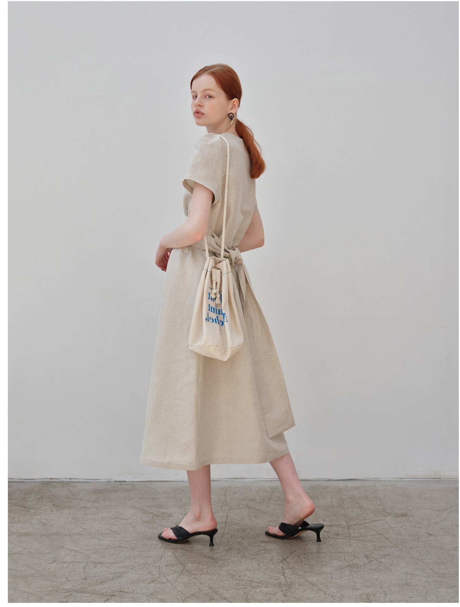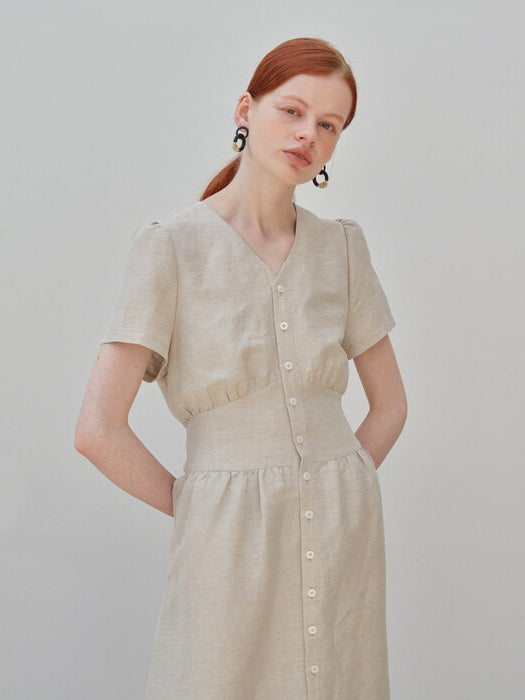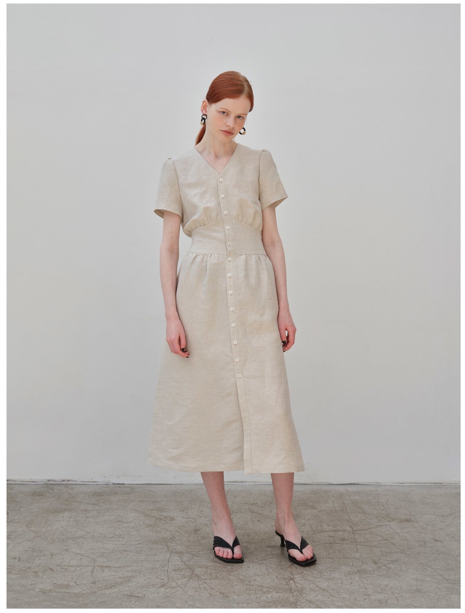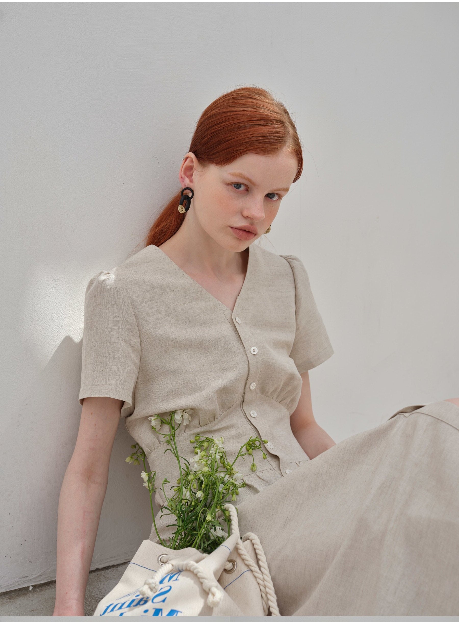 Sarah Luton presents this refined linen midi dress, designed to combine minimalist elegance with architectural structure. Crafted from breathable, high-quality linen, the dress features gently puffed mid-length sleeves, precise darted seams, and subtle contrast stitching that defines the silhouette. The midi-length hemline enhances its timeless appeal, while the clean crew neckline and tailored waist create a flattering, elongated look. Ideal for refined everyday wear or understated formal occasions.