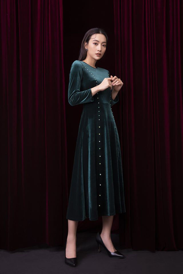 Discover timeless elegance with this velvet midi dress by Laura Ren, designed to flatter with effortless sophistication. Featuring long sleeves and a gently flared hem, this dress creates a graceful silhouette ideal for formal events or special evenings. The soft velvet texture offers a rich, fluid drape, while the vertical pearl embellishments add a touch of classic refinement and elongate the figure. Perfect for styling with heels and statement earrings, this Laura Ren velvet dress embodies understated glamour with a modern twist.