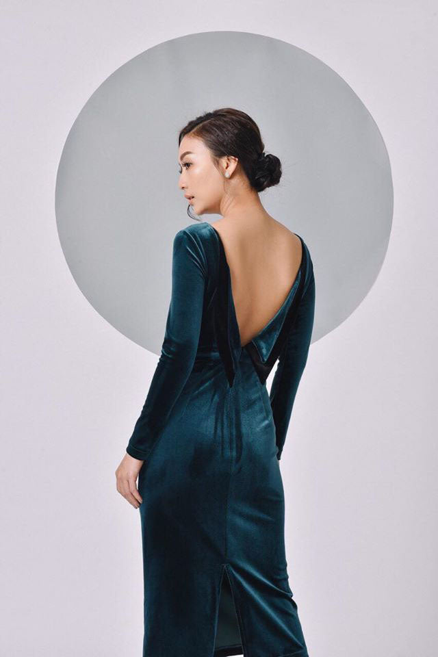 This velvet midi dress from Laura Ren exudes elegance with its minimalist front and daring low back design. Crafted from rich velvet, the dress features long fitted sleeves and a clean bateau neckline, while the back stuns with a plunging V-cut framed by a soft fold-over panel. Its figure-hugging silhouette and subtle back slit add just the right balance of allure and sophistication. Ideal for evening occasions or formal events, this timeless piece embodies the refined craftsmanship Laura Ren is known for. The velvet texture catches light beautifully, creating a soft, luminous effect with every step.