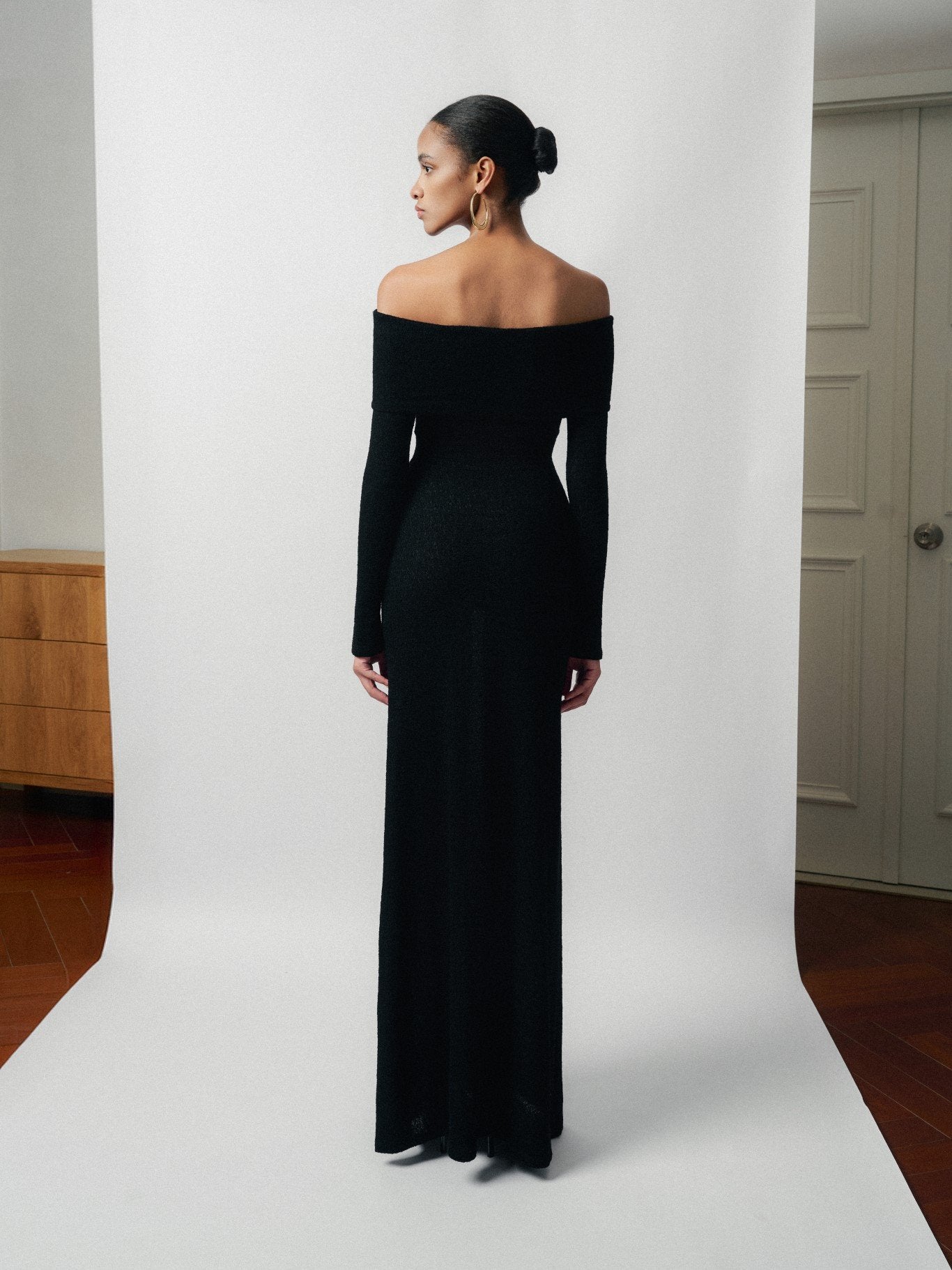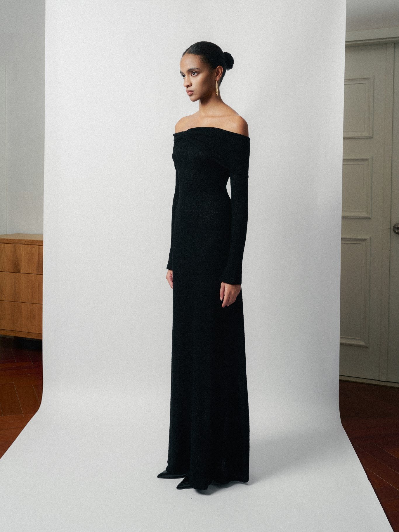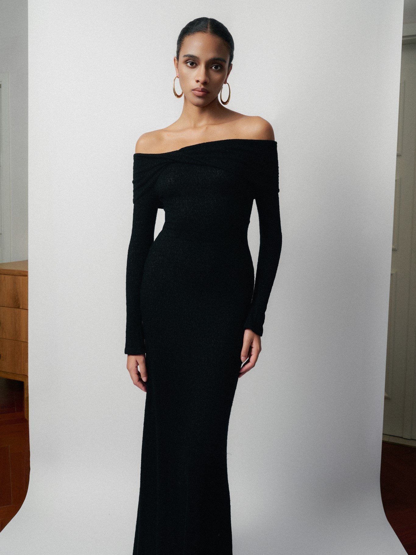 The LUMI wool lacy jacquard long dress by Laura Ren exudes minimalist elegance with a striking silhouette. Designed in a refined jacquard wool blend, this long evening dress features an off-shoulder neckline that highlights the décolletage and long sleeves for a balanced, graceful look. The body-hugging shape enhances natural curves, while the floor-length hemline softly flares for effortless movement. Ideal for formal occasions or black-tie events, this piece speaks to Laura Ren’s commitment to structured sophistication and fine craftsmanship. A timeless addition to your luxury wardrobe, made to command attention with quiet power.